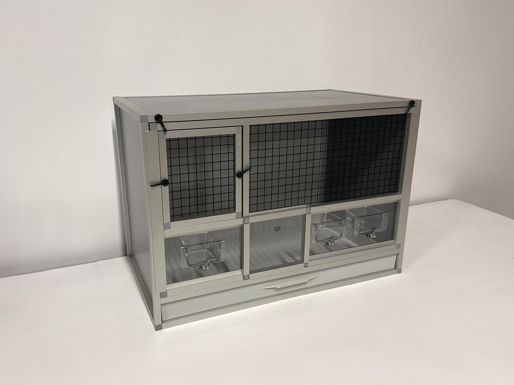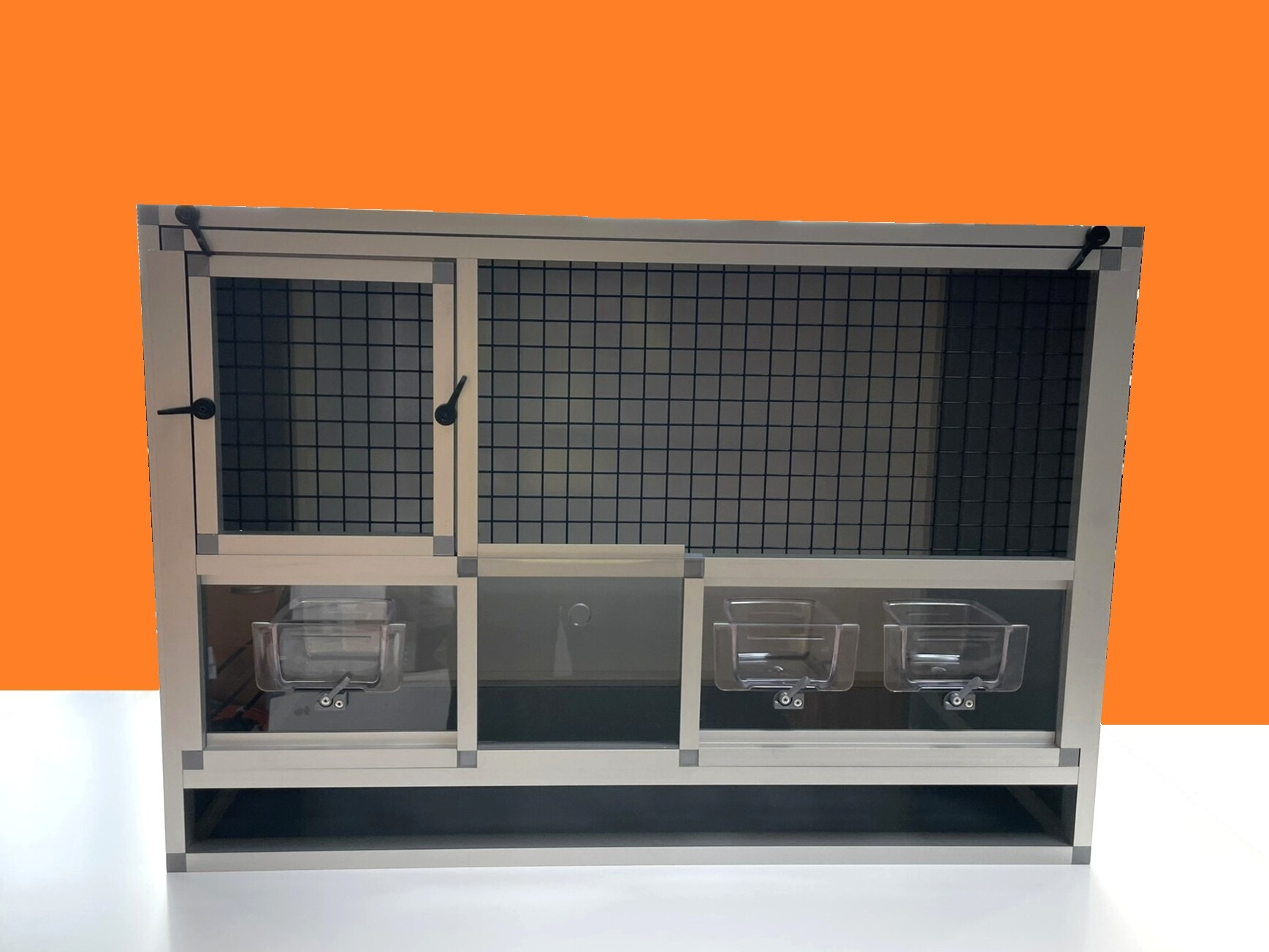 Přední stěnu lze vyjmout. Je to především z důvodu kvalitní údržby celé klece. Stěny této bednové klece jsou z velmi kvalitního materiálu hliníkový sendvič. Do toho materiálu lze řezat, vrtat.
