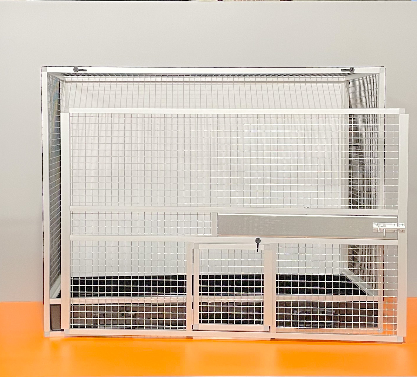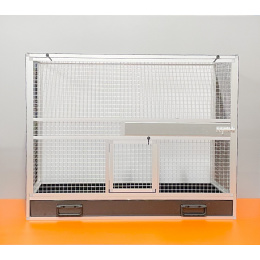 Výplně klece jsou z hliníkového sendviče (hliník-plast-hliník). Jedná se o velice pevný a kvalitní materiál. Může být v barvě bílé, šedé, tmavě zelené a antracitové. Na přání i v barvě černé. Strop je potažen pletivem, na přání lze udělat strop plný. V přední stěně je umístěný otočný krmný pult označený jako KMP03. Jedná se o krmný pult se třemi miskami o obsahu 0,35 l. Součástí klece není napáječka. Doplňky lze přiobjednat https://www.aluhobby.cz/ptactvo/doplnky-pro-bednove-klece/. Velkou předností této bednové klece je především nízká váha (14 kg) a vysoká pevnost. Díky nízké váze a použitým materiálům se velmi snadno udržuje v chovu hygiena.