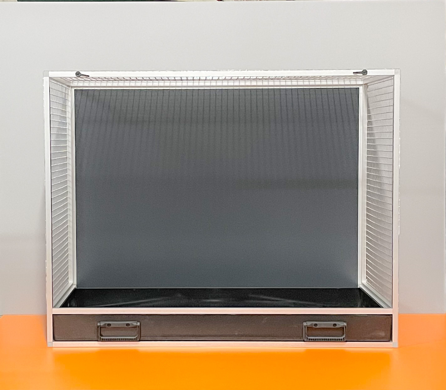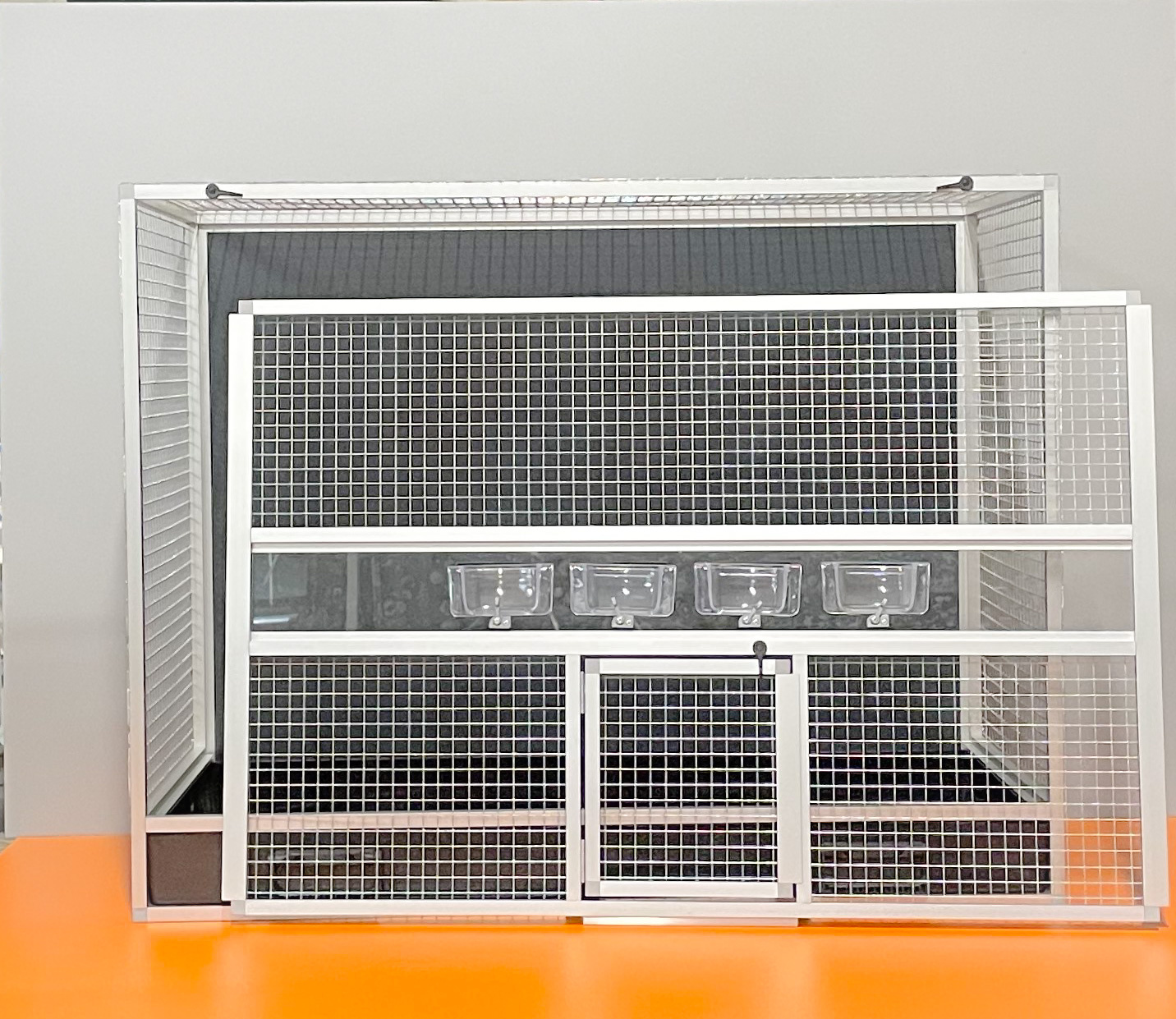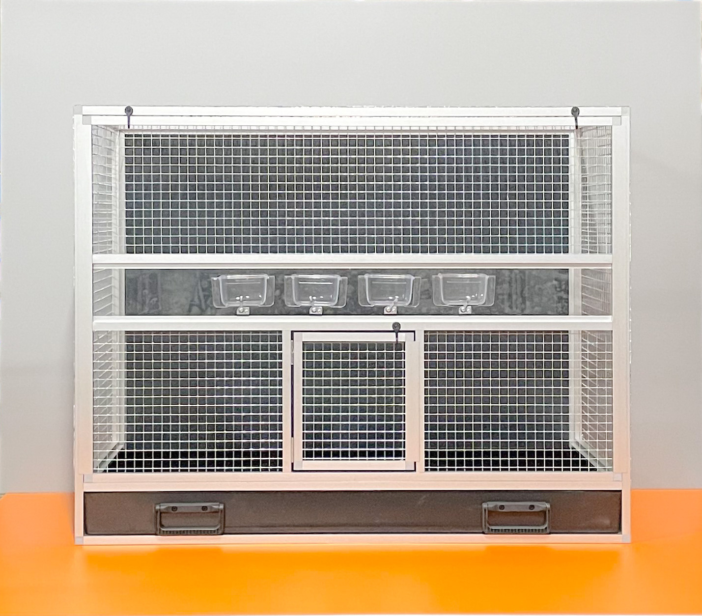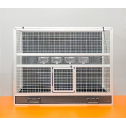 Bednová klec o rozměru šířka 99 cm, hloubka 50 cm a výška 78,5 cm má hliníkovou konstrukci tvořenou z profilu 15x15mm s povrchovou úpravou stříbrný elox. Výplně klece jsou z hliníkového sendviče (hliník-plast-hliník). Jedná se o velice pevný a kvalitní materiál. Může být v barvě bílé, šedé, tmavě zelené a antracitové. Na přání i v barvě černé. Strop je potažen pletivem, na přání lze udělat strop plný. Přední stěna je tvořena vyjímatelnou mřížkou se čtyřmi krmítky. Součástí klece není napáječka. Doplňky lze přiobjednat https://www.aluhobby.cz/ptactvo/doplnky-pro-bednove-klece/. Velkou předností této bednové klece je především nízká váha (14 kg) a vysoká pevnost. Díky nízké váze a použitým materiálům se velmi snadno udržuje v chovu hygiena.