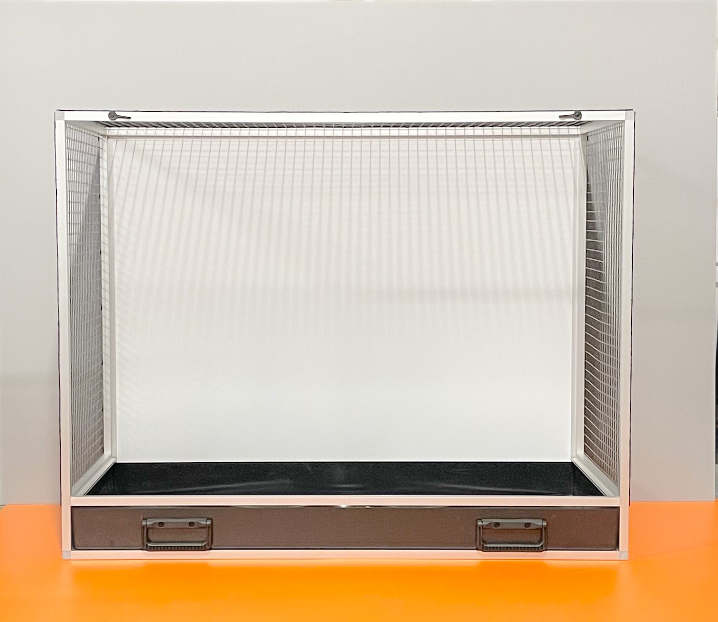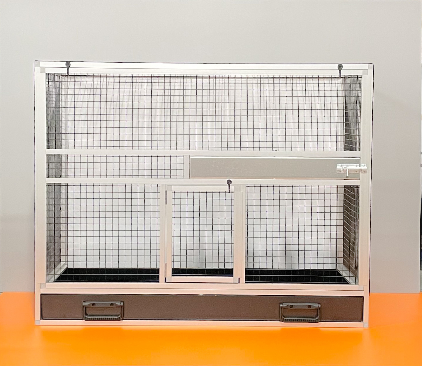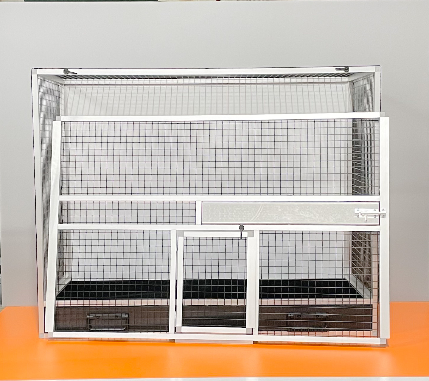 Bednová klec o rozměru šířka 99 cm, hloubka 50 cm a výška 78,5 cm má hliníkovou konstrukci tvořenou z profilu 15x15mm s povrchovou úpravu stříbrný elox. Výplně klece jsou z hliníkového sendviče (hliník-plast-hliník). Jedná se o velice pevný a kvalitní materiál. Může být v barvě bílé, šedé, tmavě zelené a antracitové. Na přání i v barvě černé. Strop je potažen pletivem, na přání lze udělat strop plný. V přední stěně je umístěný otočný krmný pult označený jako KMP03. Jedná se o krmný pult se třemi miskami o obsahu 0,35 l. Součástí klece není napáječka. Doplňky lze přiobjednat https://www.aluhobby.cz/ptactvo/doplnky-pro-bednove-klece/. Velkou předností této bednové klece je především nízká váha (14 kg) a vysoká pevnost. Díky nízké váze a použitým materiálům se velmi snadno udržuje v chovu hygiena.