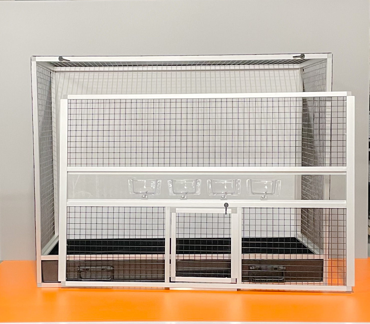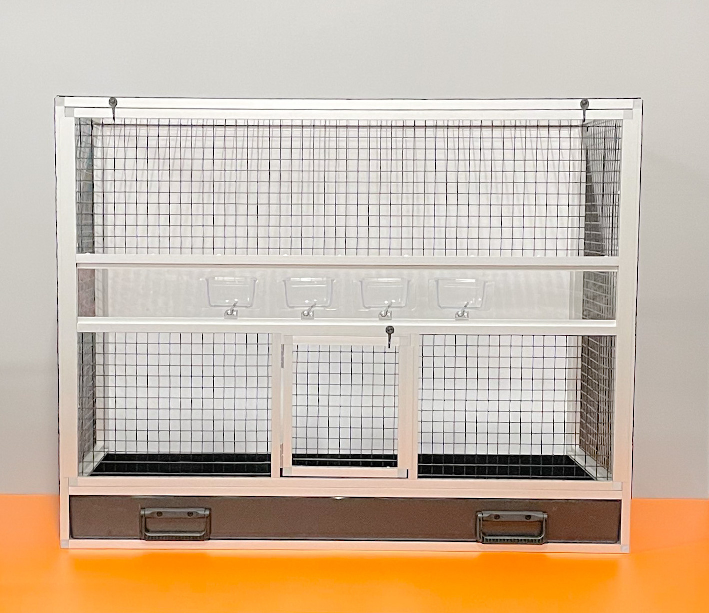 Bednová klec o rozměru šířka 99 cm, hloubka 50 cm a výška 78,5 cm má hliníkovou konstrukci tvořenou z profilu 15x15 mm s povrchovou úpravou stříbrný elox. Výplně klece jsou z hliníkového sendviče (hliník-plast-hliník). Jedná se o velice pevný a kvalitní materiál. Může být v barvě bílé, šedé, tmavě zelené a antracitové. Na přání i v barvě černé. Strop je potažen pletivem, na přání lze udělat strop plný. Přední stěna je tvořena vyjímatelnou mřížkou se čtyřmi krmítky. Součástí klece není napáječka. Doplňky lze přiobjednat https://www.aluhobby.cz/ptactvo/doplnky-pro-bednove-klece/. Velkou předností této bednové klece je především nízká váha (14kg) a vysoká pevnost. Díky nízké váze a použitým materiálům se velmi snadno udržuje v chovu hygiena.