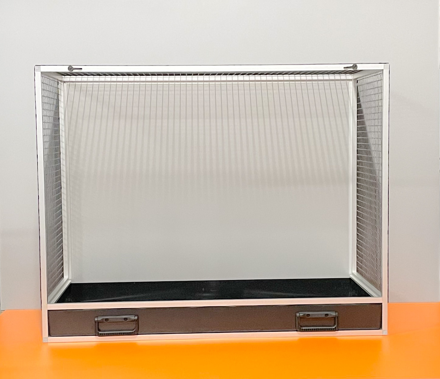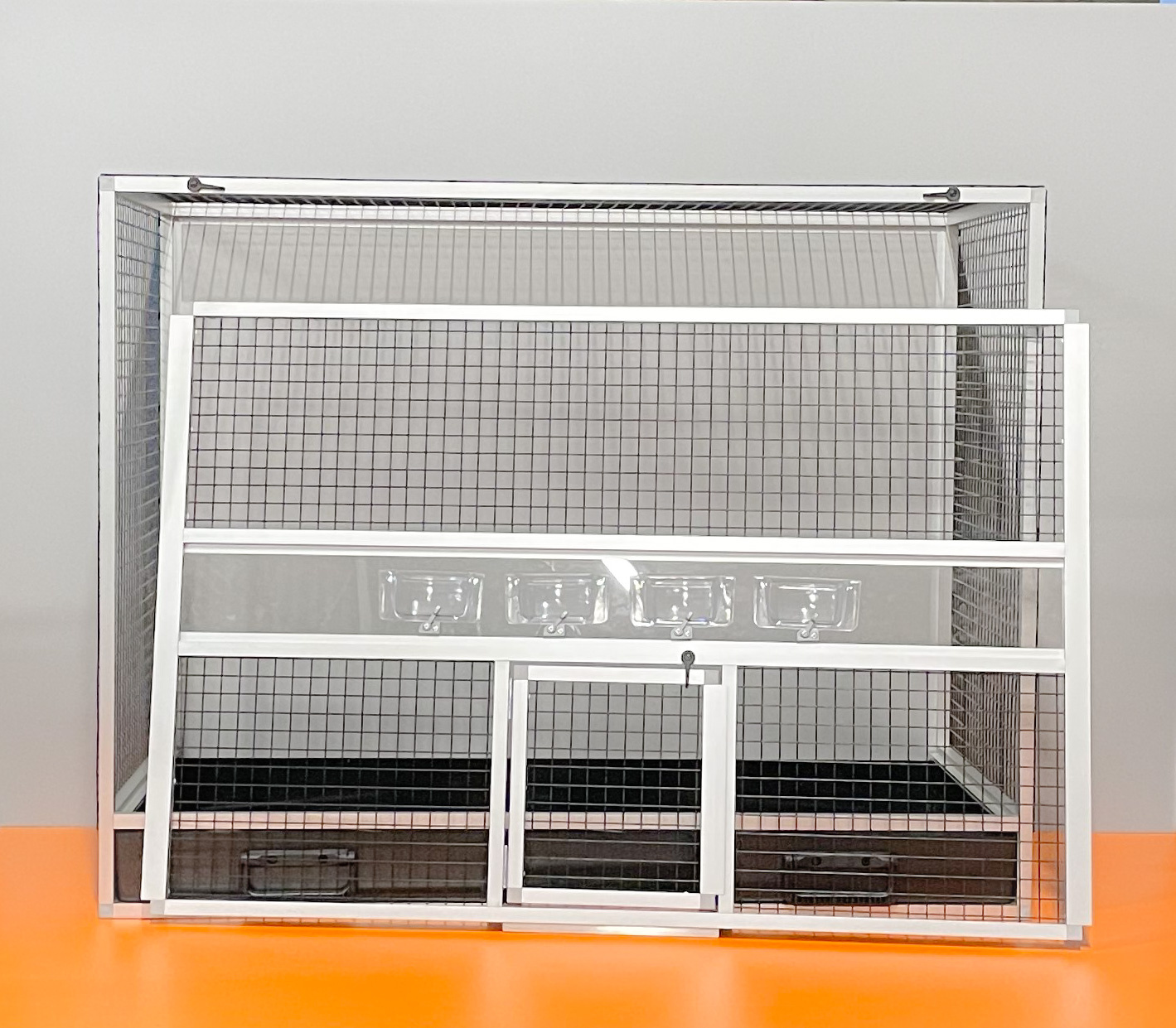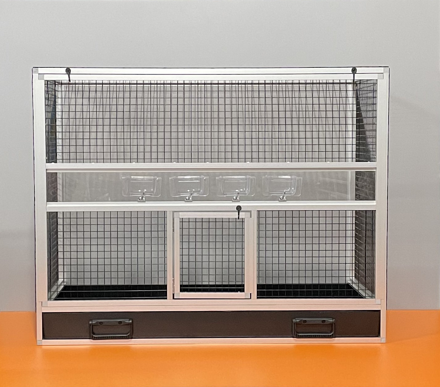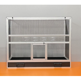 Bednová klec o rozměru šířka 99 cm, hloubka 50 cm a výška 78,5 cm má hliníkovou konstrukci tvořenou z profilu 15x15mm s povrchovou úpravou stříbrný elox. Výplně klece jsou z hliníkového sendviče (hliník-plast-hliník). Jedná se o velice pevný a kvalitní materiál. Může být v barvě bílé, šedé, tmavě zelené a antracitové. Na přání i v barvě černé. Strop je potažen pletivem, na přání lze udělat strop plný. Přední stěna je tvořena vyjímatelnou mřížkou se čtyřmi krmítky. Součástí klece není napáječka. Doplňky lze přiobjednat https://www.aluhobby.cz/ptactvo/doplnky-pro-bednove-klece/. Velkou předností této bednové klece je především nízká váha (14 kg) a vysoká pevnost. Díky nízké váze a použitým materiálům se velmi snadno udržuje v chovu hygiena.