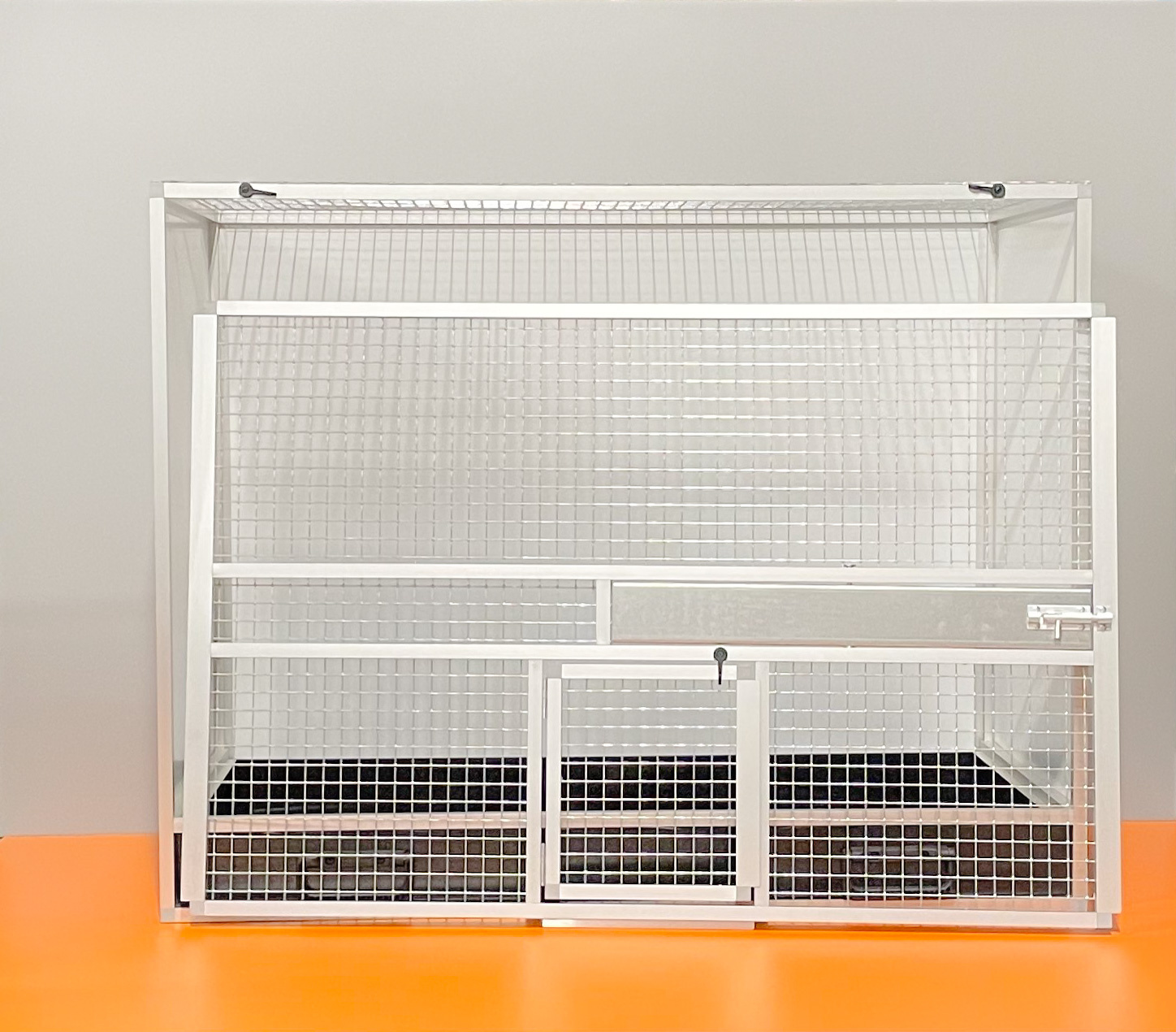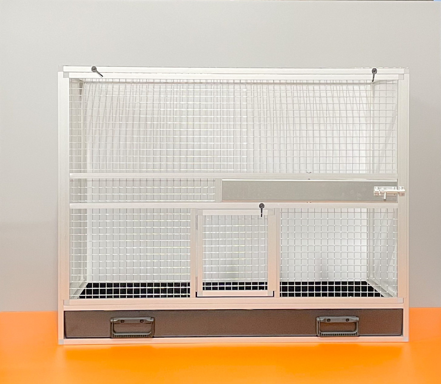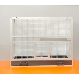 Bednová klec o rozměru šířka 99 cm, hloubka 50 cm a výška 78,5 cm má hliníkovou konstrukci tvořenou z profilu 15x15mm s povrchovou úpravou stříbrný elox. Výplně klece jsou z hliníkového sendviče (hliník-plast-hliník). Jedná se o velice pevný a kvalitní materiál. Může být v barvě bílé, šedé, tmavě zelené a antracitové. Na přání i v barvě černé. Strop je potažen pletivem, na přání lze udělat strop plný. V přední stěně je umístěný otočný krmný pult označený jako KMP03. Jedná se o krmný pult se třemi miskami o obsahu 0,35 l. Součástí klece není napáječka. Doplňky lze přiobjednat https://www.aluhobby.cz/ptactvo/doplnky-pro-bednove-klece/. Velkou předností této bednové klece je především nízká váha 14 kg a vysoká pevnost. Díky nízké váze a použitým materiálům se velmi snadno udržuje v chovu hygiena.