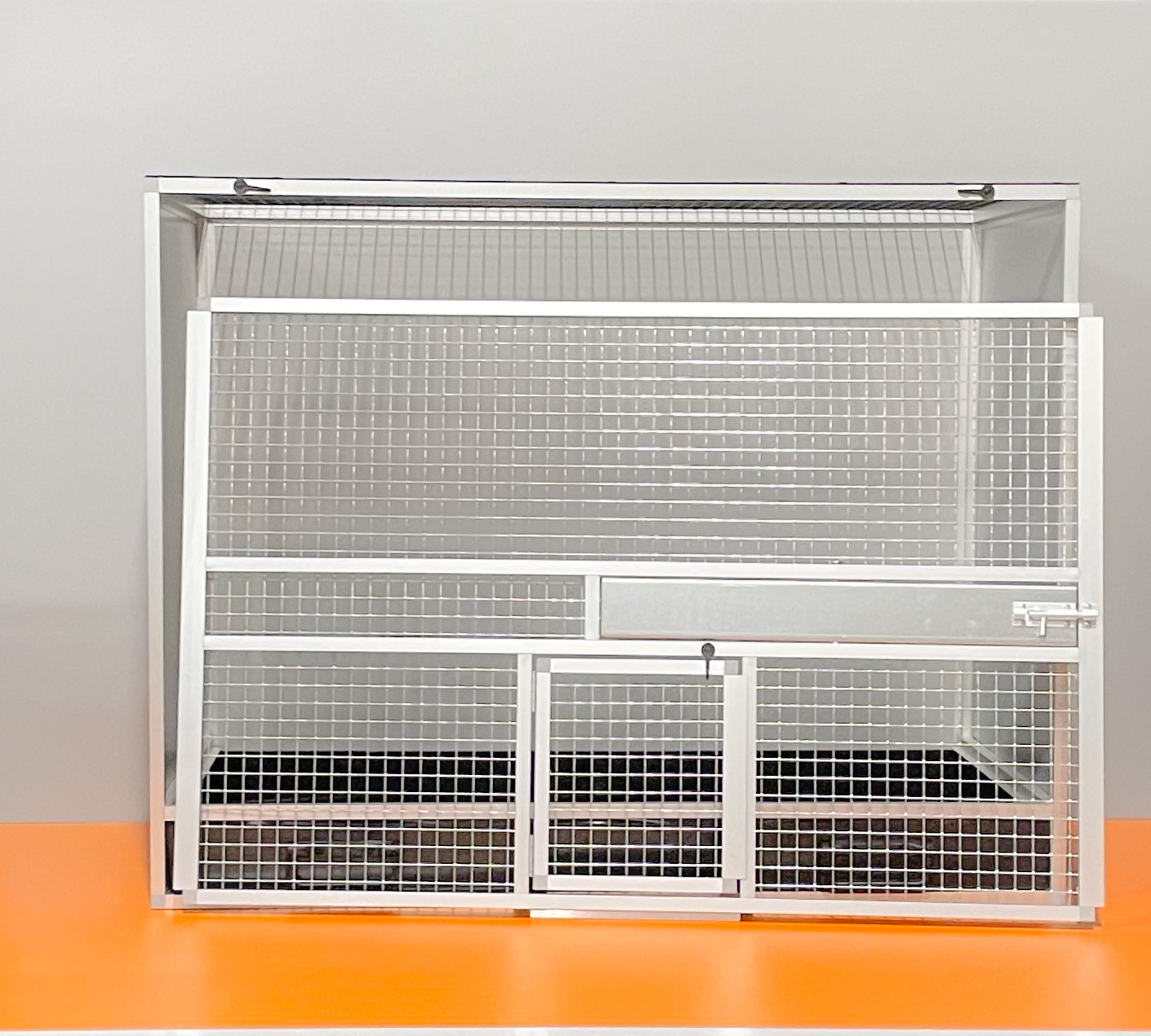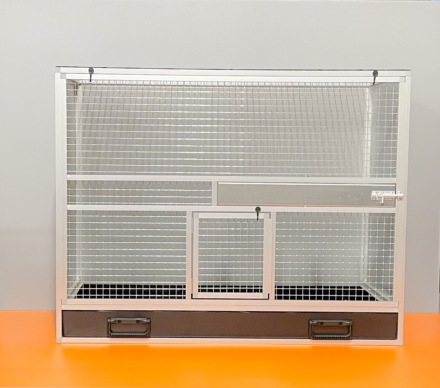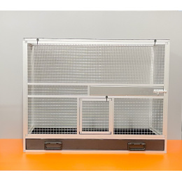Bednová klec o rozměru šířka 99 cm, hloubka 50 cm a výška 78,5 cm má hliníkovou konstrukci tvořenou z profilu 15x15mm s povrchovou úpravou stříbrný elox. Výplně klece jsou z hliníkového sendviče (hliník-plast-hliník). Jedná se o velice pevný a kvalitní materiál. Může být v barvě bílé, šedé, tmavě zelené a antracitové. Na přání i v barvě černé. Strop je potažen pletivem, na přání lze udělat strop plný. V přední stěně je umístěný otočný krmný pult u nás označený jako KMP03. Jedná se o krmný pult se třemi miskami o obsahu 0,35 l. Součástí klece není napáječka. Doplňky lze přiobjednat https://www.aluhobby.cz/ptactvo/doplnky-pro-bednove-klece/. Velkou předností této bednové klece je především nízká váha (14 kg) a vysoká pevnost. Díky nízké váze a použitým materiálům se velmi snadno udržuje v chovu hygiena.