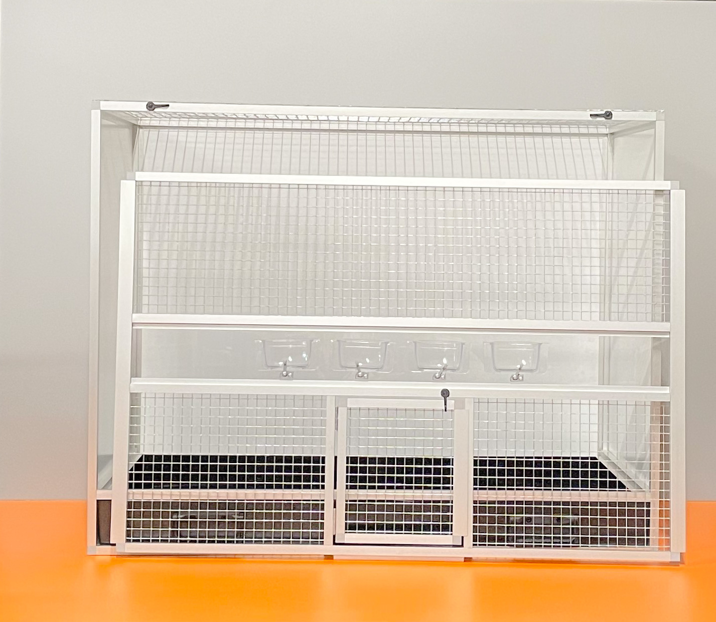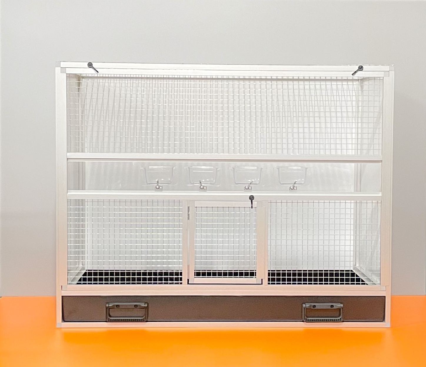 Bednová klec o rozměru šířka 99 cm, hloubka 50 cm a výška 78,5 cm má hliníkovou konstrukci tvořenou z profilu 15x15mm s povrchovou úpravou stříbrný elox. Výplně klece jsou z hliníkového sendviče (hliník-plast-hliník). Jedná se o velice pevný a kvalitní materiál. Může být v barvě bílé, šedé, tmavě zelené a antracitové. Na přání i v barvě černé. Strop je potažen pletivem, na přání lze udělat strop plný. Přední stěna je tvořena vyjímatelnou mřížkou se čtyřmi krmítky. Součástí klece není napáječka. Doplňky lze přiobjednat https://www.aluhobby.cz/ptactvo/doplnky-pro-bednove-klece/. Velkou předností této bednové klece je především nízká váha 14 kg a vysoká pevnost. Díky nízké váze a použitým materiálům se velmi snadno udržuje v chovu hygiena.