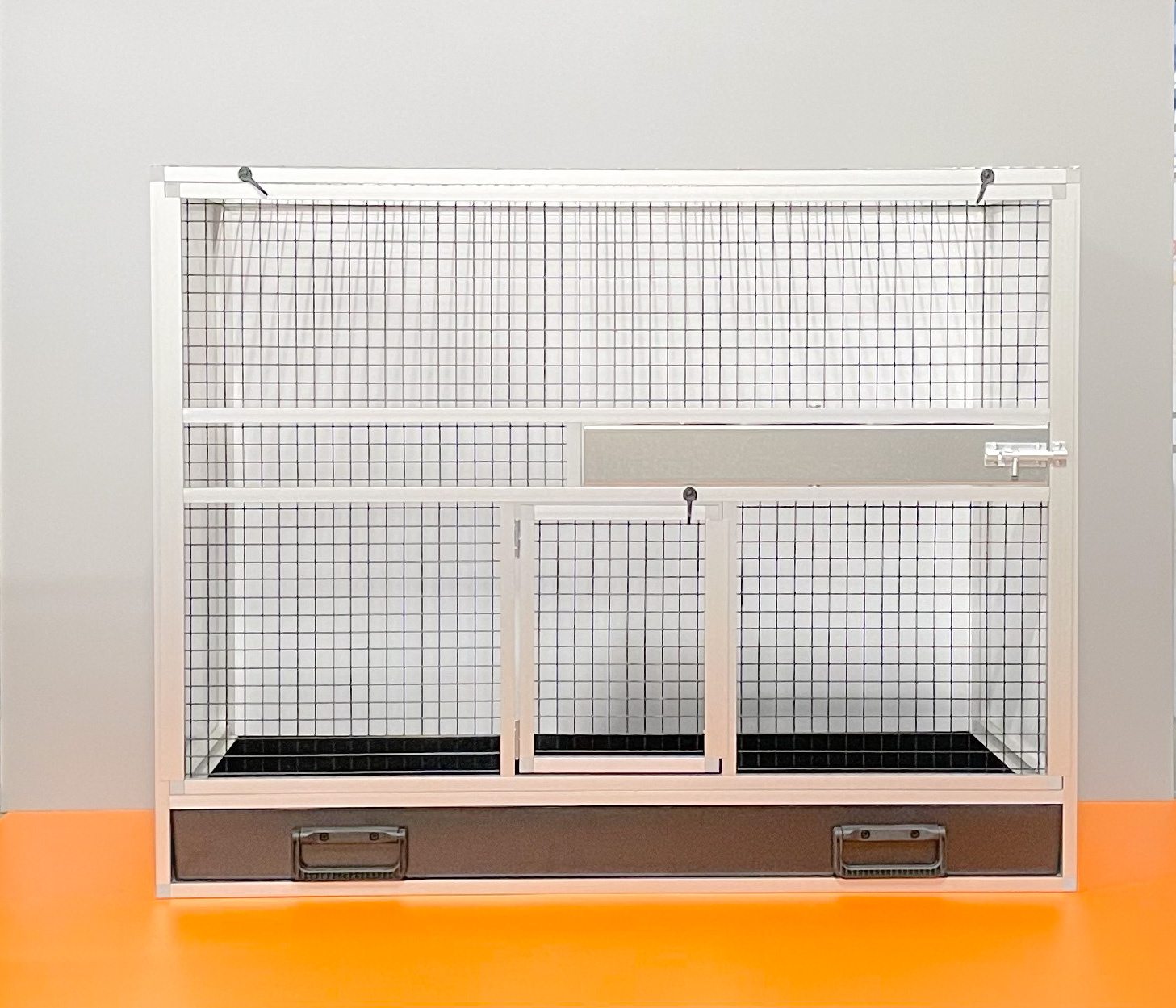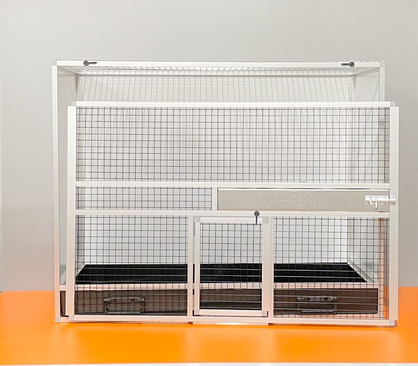 Zajímavostí u této klece je černé pletivo, jedná se o lakované pletivo značky Esafort oko 19x19, drát 1,45 mm, černý mat. Nejedná se o poplastované pletivo!! Z tohoto důvodu nedokážou zvířata lak narušit. Pohled na zvířata přes tento typ pletiva je velmi příjemný a nerušený stříbrným odleskem.