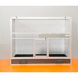 Bednová klec o rozměru šířka 99 cm, hloubka 50 cm a výška 78,5 cm má hliníkovou konstrukci tvořenou z profilu 15x15mm s povrchovou úpravou stříbrný elox. Výplně klece jsou z hliníkového sendviče (hliník-plast-hliník). Jedná se o velice pevný a kvalitní materiál. Může být v barvě bílé, šedé, tmavě zelené a antracitové. Na přání i v barvě černé. Strop je potažen pletivem, na přání lze udělat strop plný. V přední stěně je umístěný otočný krmný pult označený jako KMP03. Jedná se o krmný pult se třemi miskami o obsahu 0,35 l. Součástí klece není napáječka. Doplňky lze přiobjednat https://www.aluhobby.cz/ptactvo/doplnky-pro-bednove-klece/. Velkou předností této bednové klece je především nízká váha 14 kg a vysoká pevnost. Díky nízké váze a použitým materiálům se velmi snadno udržuje v chovu hygiena.