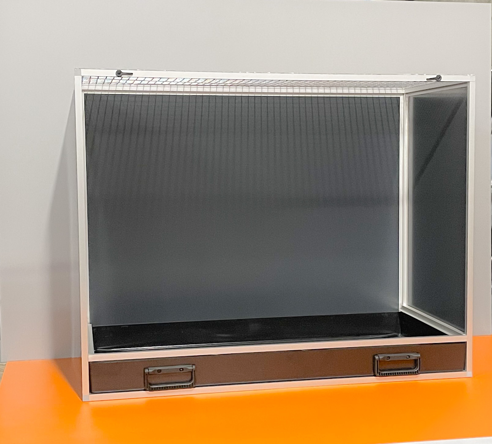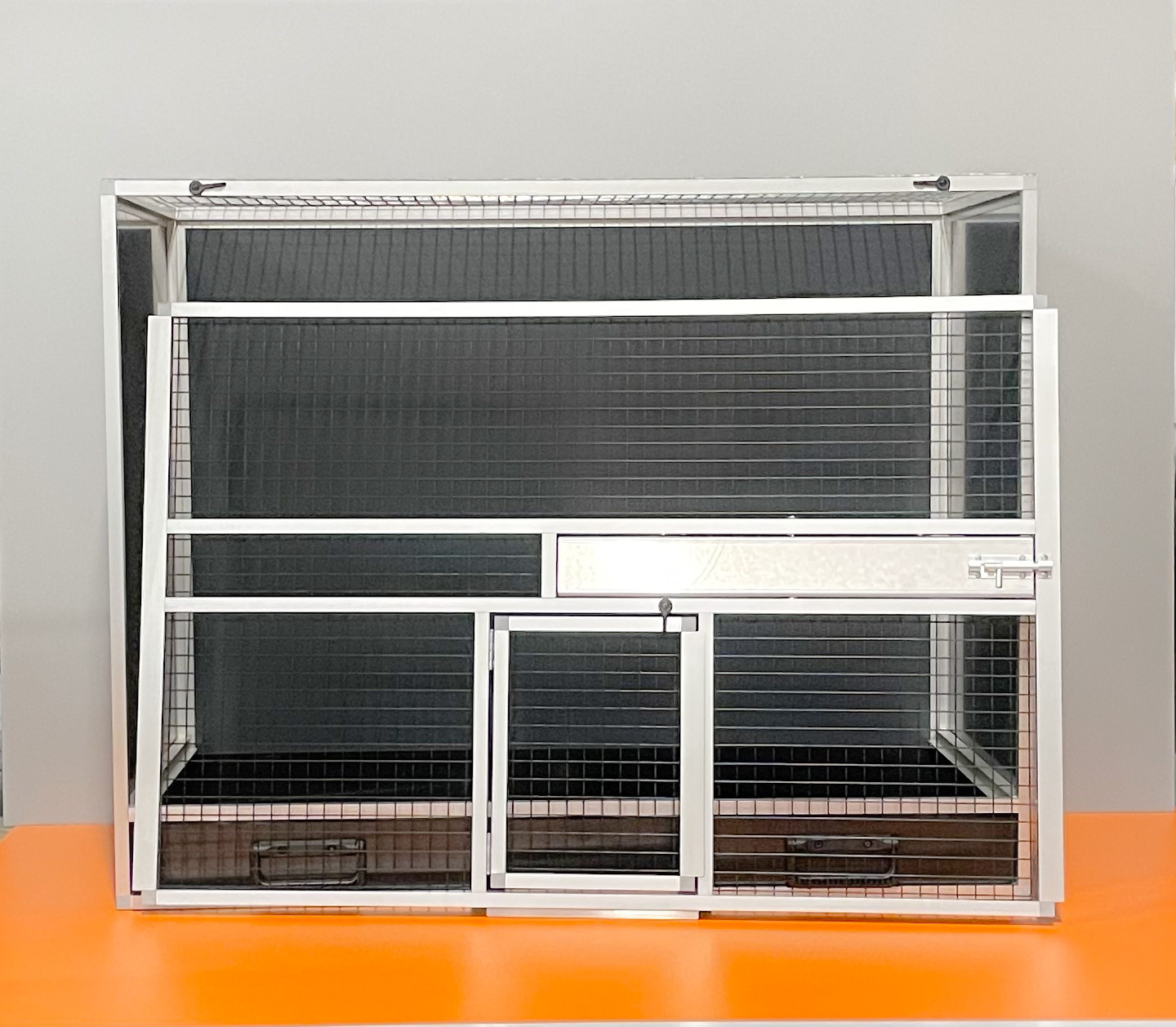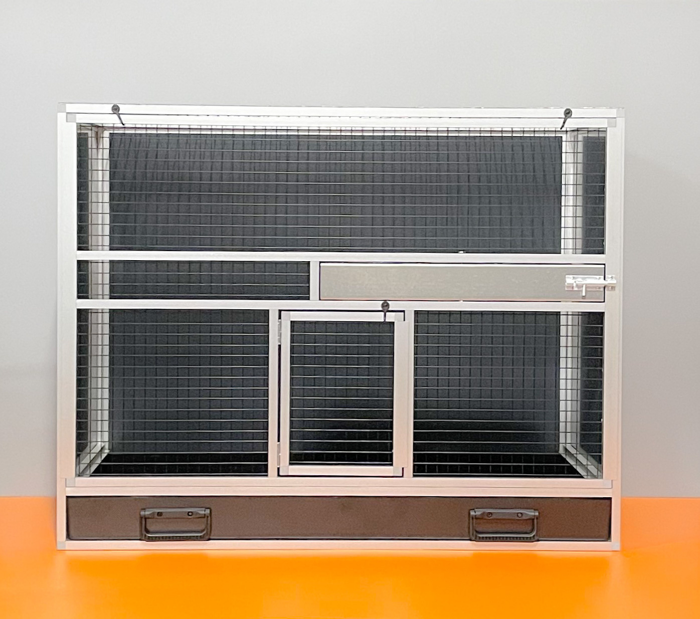 Bednová klec o rozměru šířka 99 cm, hloubka 50 cm a výška 78,5 cm má hliníkovou konstrukci tvořenou z profilu 15x15 mm s povrchovou úpravu stříbrný elox. Výplně klece jsou z hliníkového sendviče (hliník-plast-hliník). Jedná se o velice pevný a kvalitní materiál. Může být v barvě bílé, šedé, tmavě zelené a antracitové. Na přání i v barvě černé. Strop je potažen pletivem, na přání lze udělat strop plný. V přední stěně je umístěný otočný krmný pult u nás označený jako KMP03. Jedná se o krmný pult se třemi miskami o obsahu 0,35 l. Součástí klece není napáječka. Doplňky lze přiobjednat https://www.aluhobby.cz/ptactvo/doplnky-pro-bednove-klece/. Velkou předností této bednové klece je především nízká váha 14 kg a vysoká pevnost. Díky nízké váze a použitým materiálům se velmi snadno udržuje v chovu hygiena.