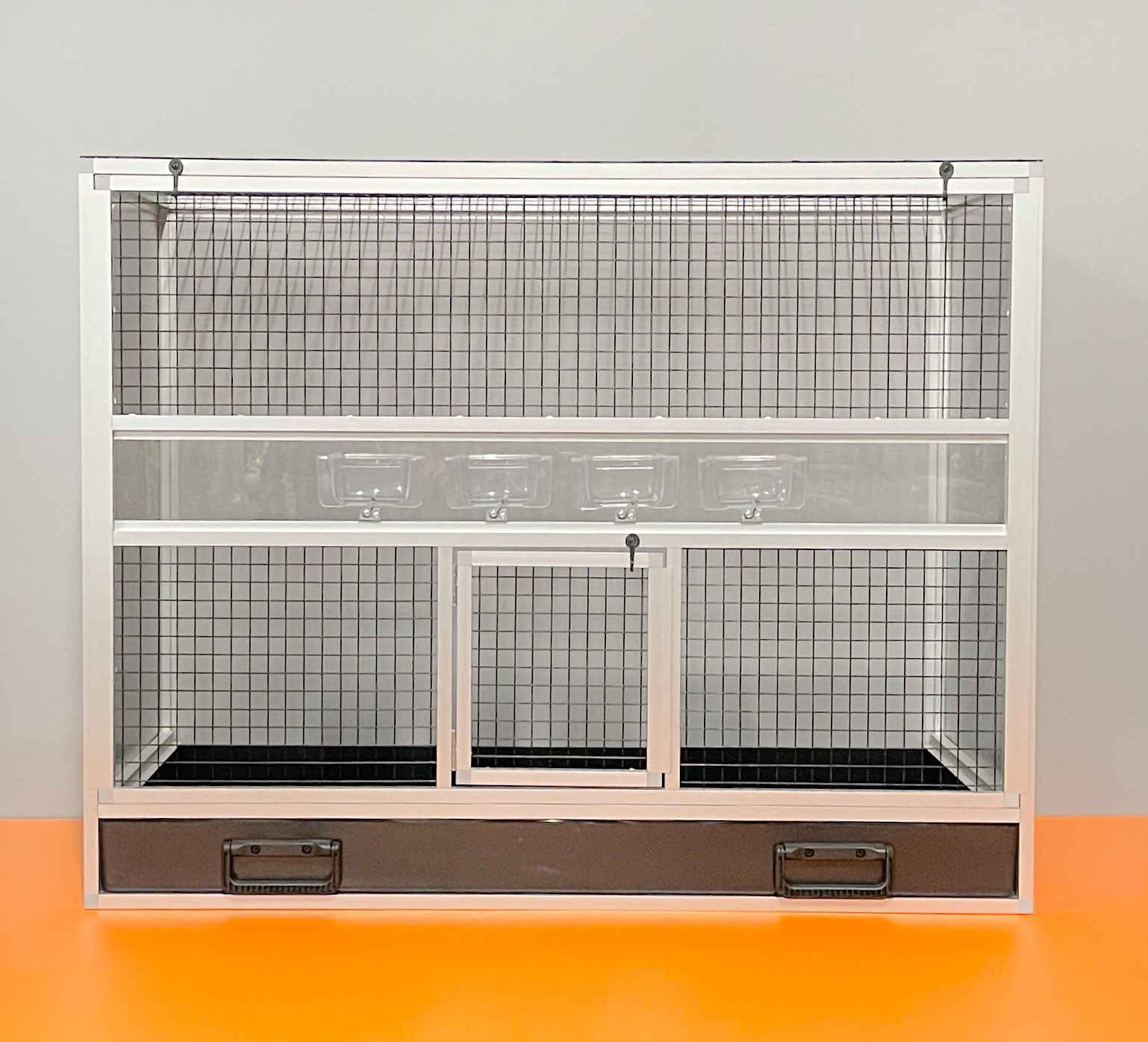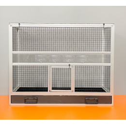 Bednová klec o rozměru šířka 99 cm, hloubka 50 cm a výška 78,5 cm má hliníkovou konstrukci tvořenou z profilu 15x15 mm s povrchovou úpravou stříbrný elox. Výplně klece jsou z hliníkového sendviče (hliník-plast-hliník). Jedná se o velice pevný a kvalitní materiál. Může být v barvě bílé, šedé, tmavě zelené a antracitové. Na přání i v barvě černé. Strop je potažen pletivem, na přání lze udělat strop plný. Přední stěna je tvořena vyjímatelnou mřížkou se čtyřmi krmítky. Součástí klece není napáječka. Doplňky lze přiobjednat https://www.aluhobby.cz/ptactvo/doplnky-pro-bednove-klece/. Velkou předností této bednové klece je především nízká váha (14 kg) a vysoká pevnost. Díky nízké váze a použitým materiálům se velmi snadno udržuje v chovu hygiena.
