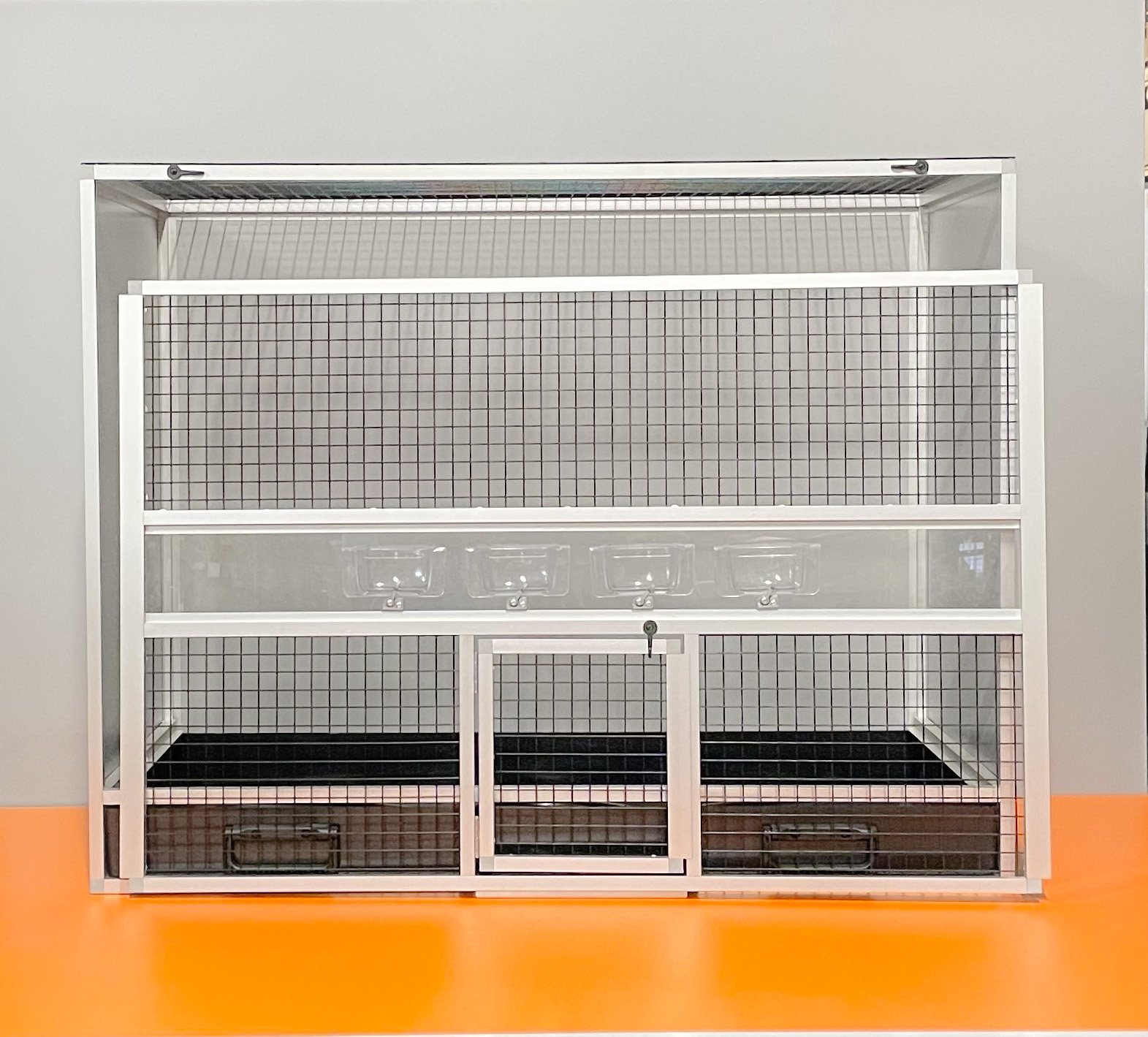Zajímavostí u této klece je černé pletivo, jedná se o lakované pletivo značky Esafort oko 19x19, drát 1,45 mm, černý mat. Nejedná se o poplastované pletivo!! Z toho důvodu nedokážou zvířata lak narušit. Pohled na zvířata přes tento typ pletiva je velmi příjemný a nerušený stříbrným odleskem.