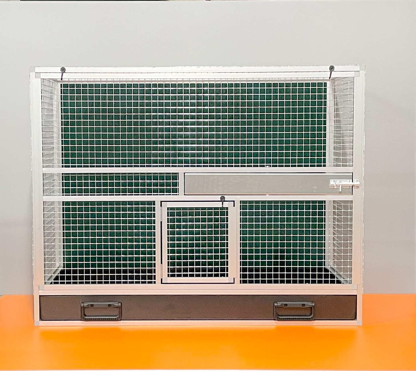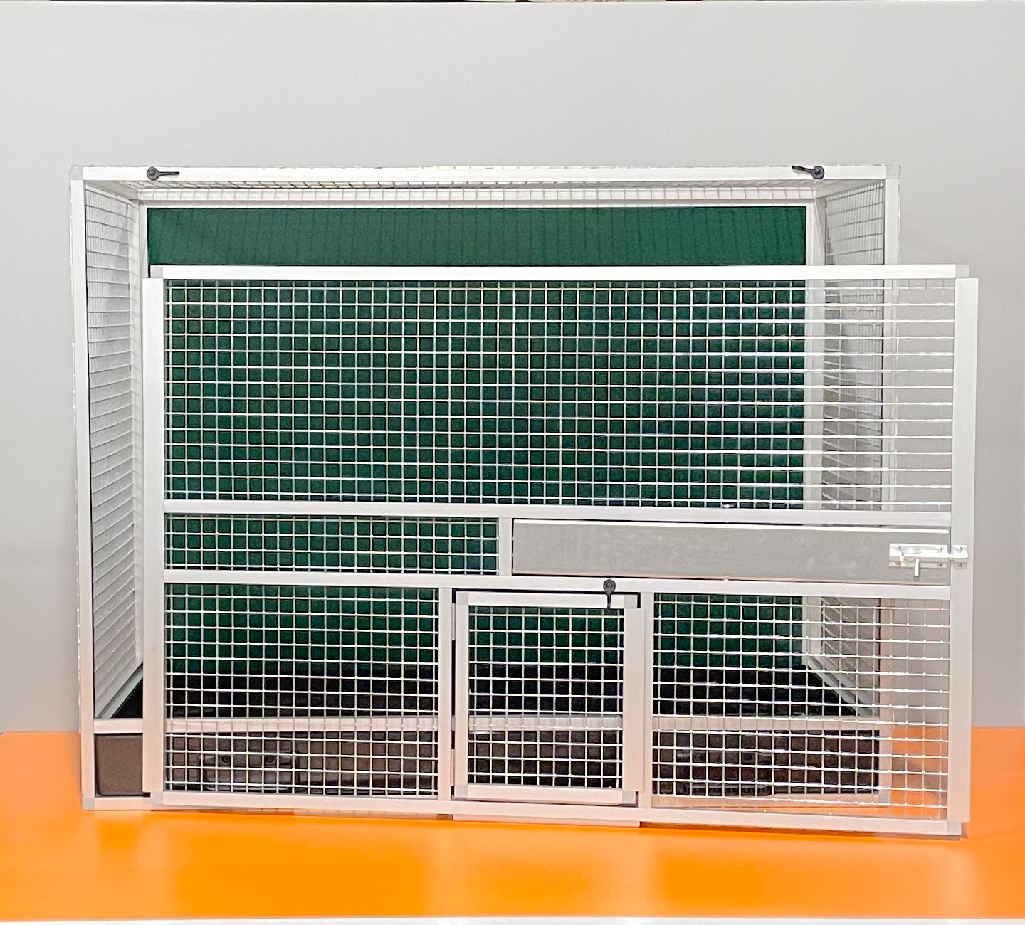 Výplně klece jsou z hliníkového sendviče (hliník-plast-hliník). Jedná se o velice pevný a kvalitní materiál. Může být v barvě bílé, šedé, tmavě zelené a antracitové. Na přání i v barvě černé. Strop je potažen pletivem, na přání lze udělat strop plný. V přední stěně je umístěný otočný krmný pult u nás označený jako KMP03. Jedná se o krmný pult se třemi miskami o obsahu 0,35 l. Součástí klece není napáječka. Doplňky lze přiobjednat https://www.aluhobby.cz/ptactvo/doplnky-pro-bednove-klece/. Velkou předností této bednové klece je především nízká váha 14 kg a vysoká pevnost. Díky nízké váze a použitým materiálům se velmi snadno udržuje v chovu hygiena.