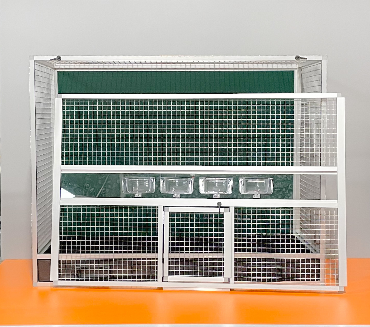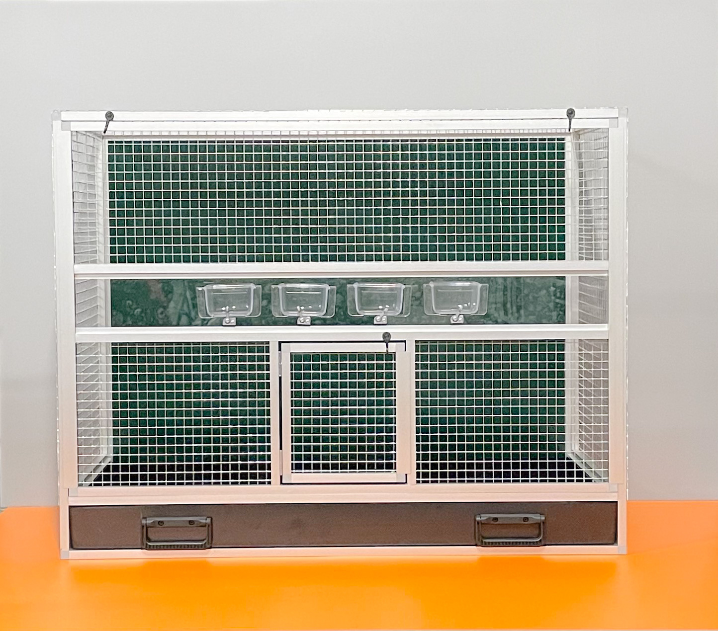Bednová klec o rozměru šířka 99 cm, hloubka 50 cm a výška 78,5 cm má hliníkovou konstrukci tvořenou z profilu 15x15mm s povrchovou úpravou stříbrný elox. Výplně klece jsou z hliníkového sendviče (hliník-plast-hliník). Jedná se o velice pevný a kvalitní materiál. Může být v barvě bílé, šedé, tmavě zelené a antracitové. Na přání i v barvě černé. Strop je potažen pletivem, na přání lze udělat strop plný. Přední stěna je tvořena vyjímatelnou mřížkou se čtyřmi krmítky. Součástí klece není napáječka. Doplňky lze přiobjednat https://www.aluhobby.cz/ptactvo/doplnky-pro-bednove-klece/. Velkou předností této bednové klece je především nízká váha 14 kg a vysoká pevnost. Díky nízké váze a použitým materiálům se velmi snadno udržuje v chovu hygiena.