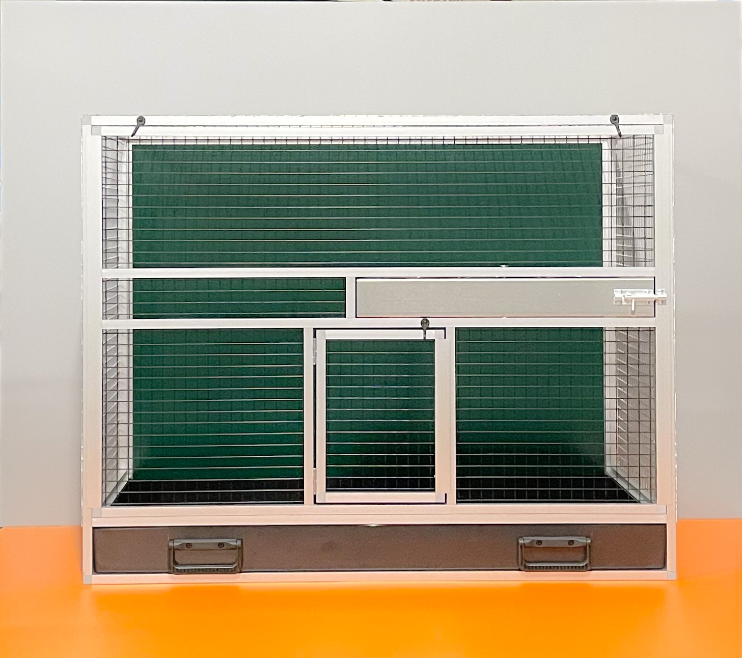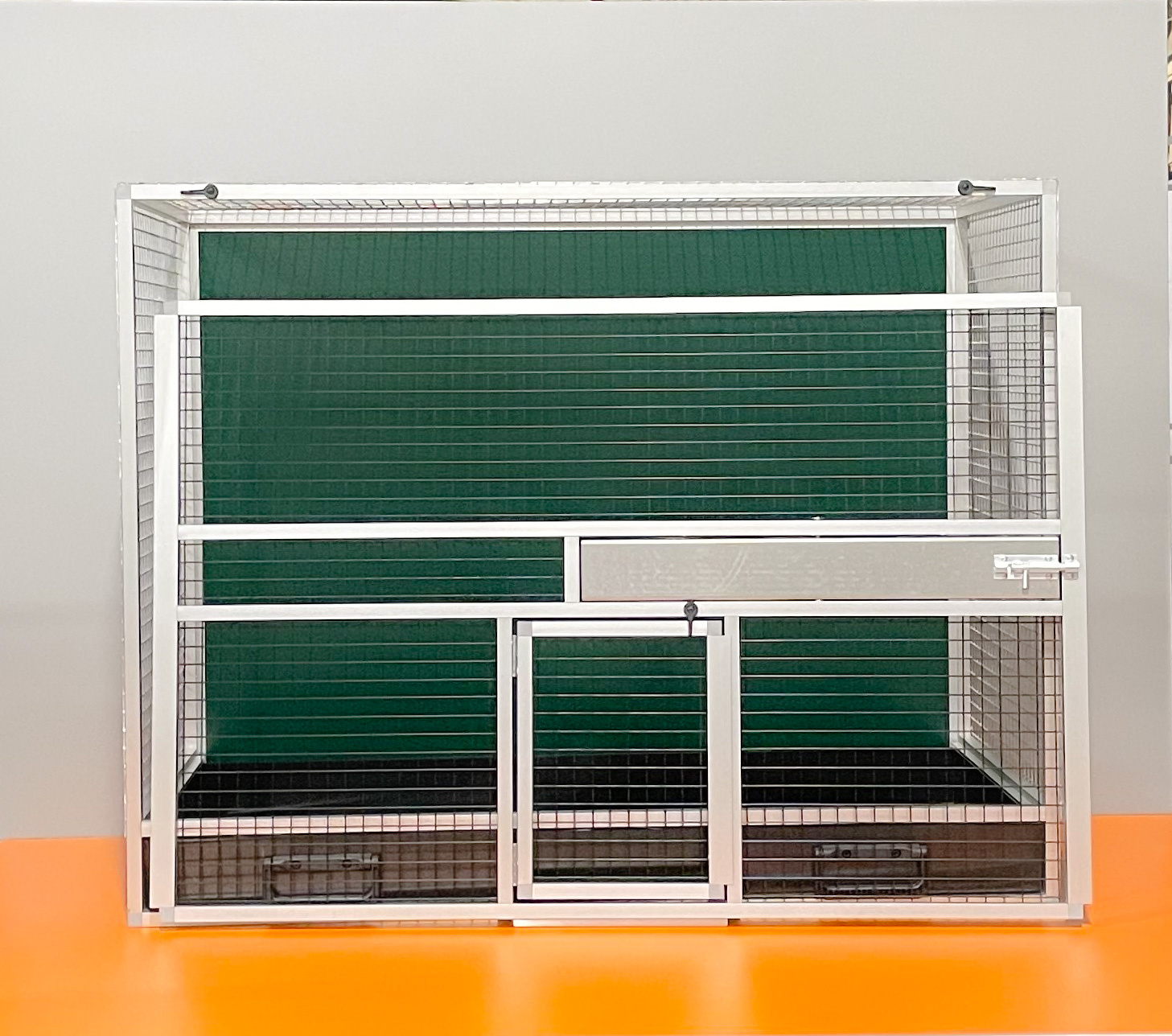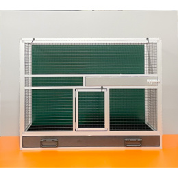 Bednová klec o rozměru šířka 99 cm, hloubka 50 cm a výška 78,5 cm má hliníkovou konstrukci tvořenou z profilu 15x15 mm s povrchovou úpravou stříbrný elox. Výplně klece jsou z hliníkového sendviče (hliník-plast-hliník). Jedná se o velice pevný a kvalitní materiál. Může být v barvě bílé, šedé, tmavě zelené a antracitové. Na přání i v barvě černé. Strop je potažen pletivem, na přání lze udělat strop plný. V přední stěně je umístěný otočný krmný pult u nás označený jako KMP03. Jedná se o krmný pult se třemi miskami o obsahu 0,35 l. Součástí klece není napáječka. Doplňky lze přiobjednat https://www.aluhobby.cz/ptactvo/doplnky-pro-bednove-klece/. Velkou předností této bednové klece je především nízká váha 14 kg a vysoká pevnost. Díky nízké váze a použitým materiálům se velmi snadno udržuje v chovu hygiena.