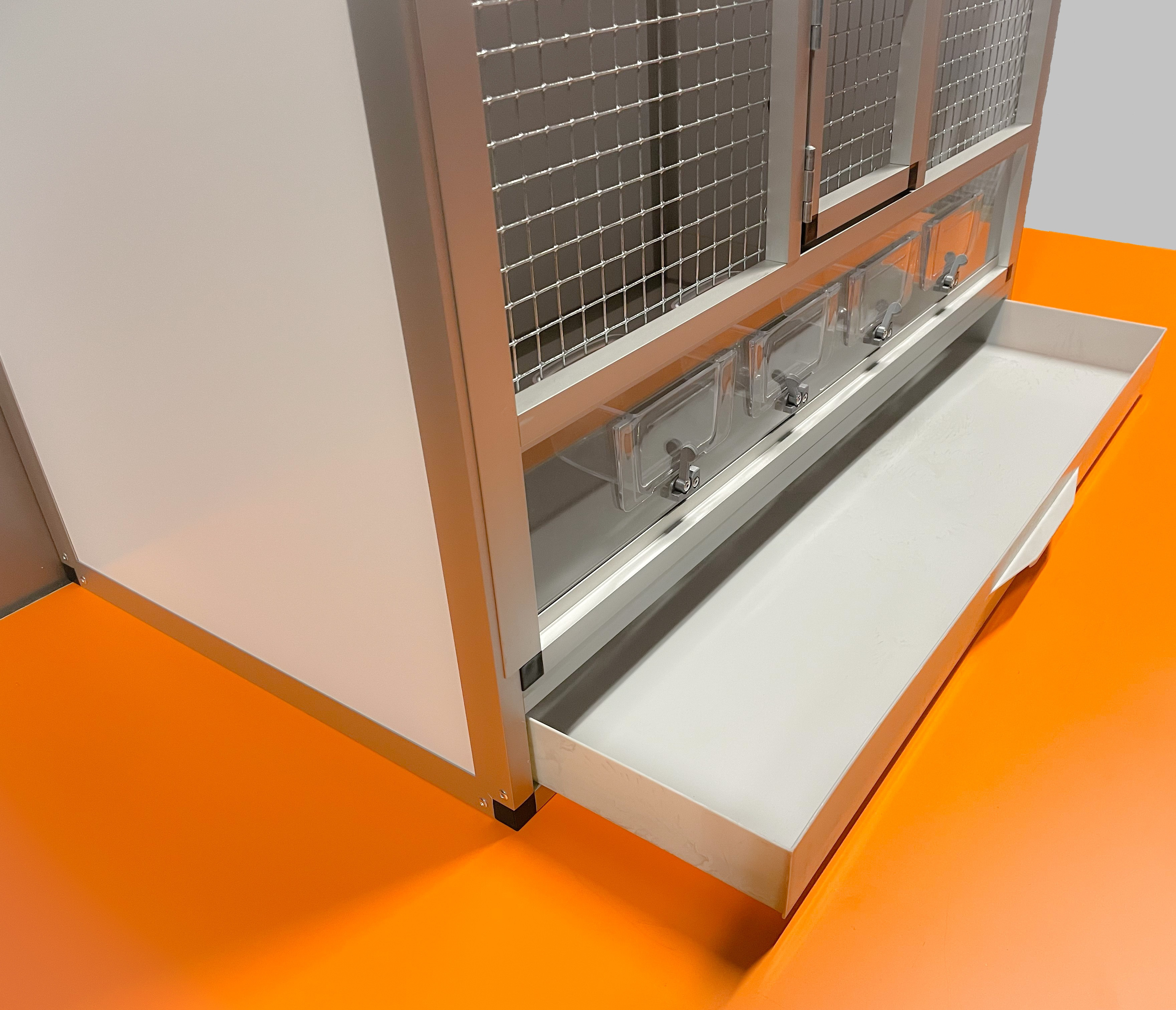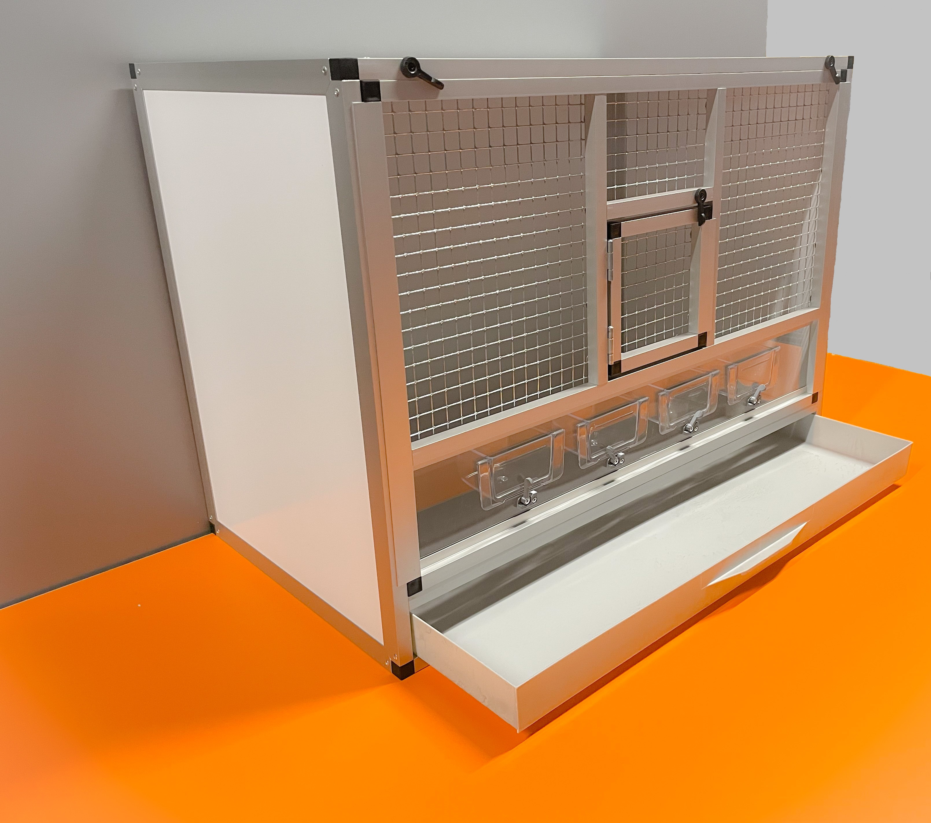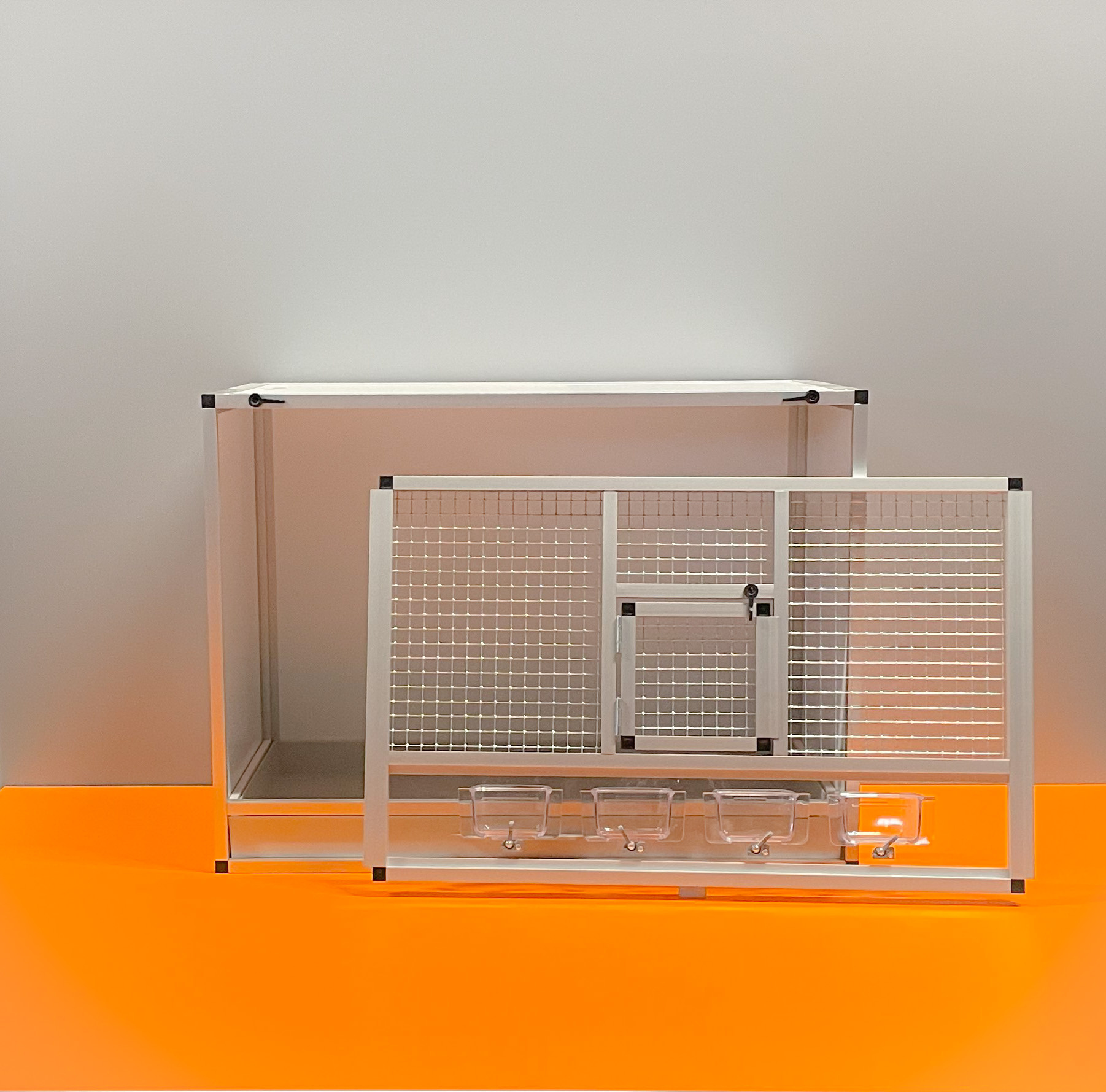 Přední stěnu lze vyjmout. Je to především z důvodu kvalitní údržby celé klece. Stěny této bednové klece jsou z velmi kvalitního materiálů hliníkový sendvič. Do toho materiálu lze řezat, vrtat. Přední stěny nabízíme pouze s italskými pletivy, a to v černé matné barvě, oko 19x19, drát 1,5 mm a stříbrné, oko 16x16x1,2 mm. Na přání zákazníka můžeme vyrobit bednovou klec, kde bude strop rovněž potažen pletivem. Pokud si zákazník objedná více než čtyři klece najednou, bude doprava těchto klecí zdarma. Pokud si zákazník přijede osobně, bude mu poskytnuta sleva 8 % na čtyři a více klecí v tomto provedení.