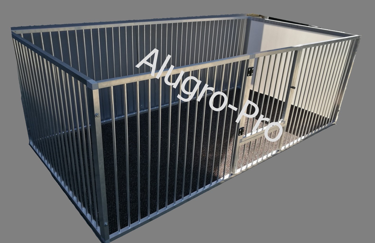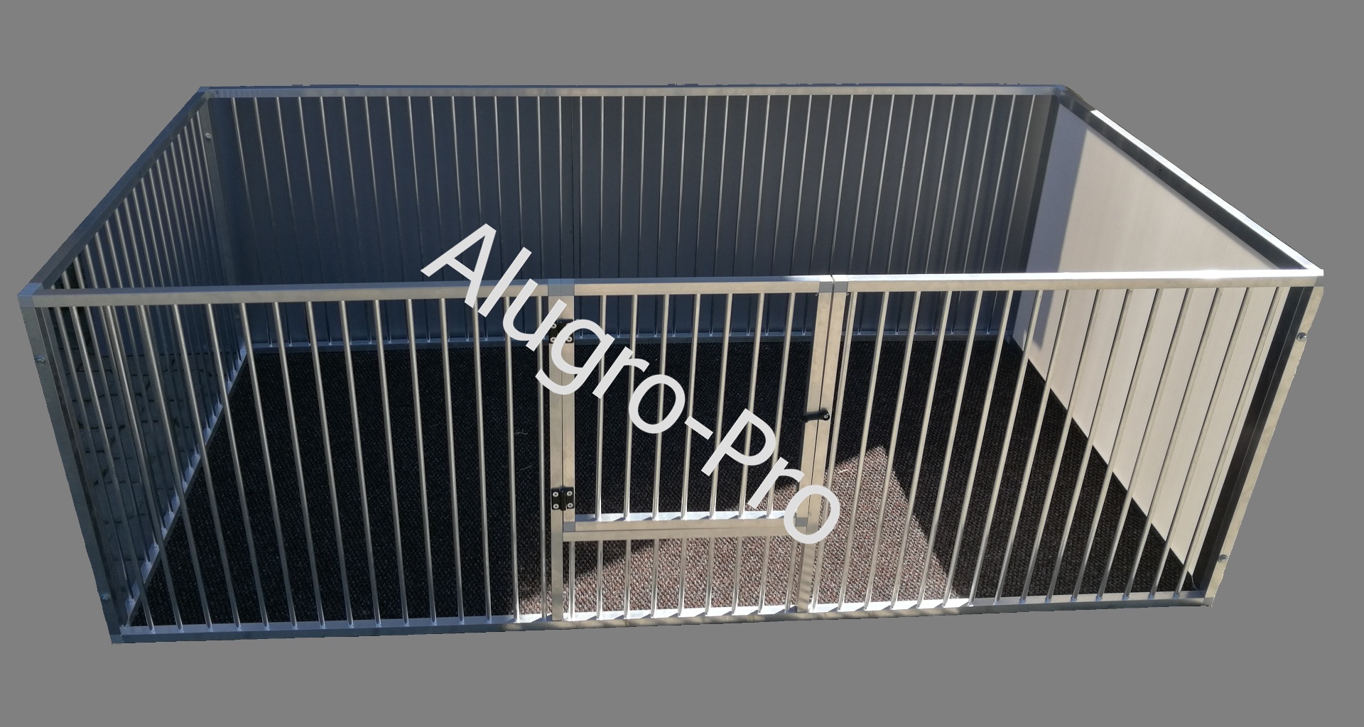 Ohrádky jsou určeny především pro odchov štěňat. Jsou určeny pro venkovní i vnitřní použití. Ohrádka je složena ze čtyř rámů, je lehce smontovatelná i demontovatelná. Zákazník má možnost zvolit velikost půdorysu i výšku ohrádky. Sokl pod ohrádkou může být do výšky upraven dle požadavků zákazníka. Cena a velikost ohrádky je pouze pro tento uvedený typ, kdy jedna boční stěna a zadní stěna je z plného materiálu, kterému říkáme hliníkový sendvič. Jestliže má zákazník požadavek na jinou velikost ohrádky, případně požaduje ohrádku v eloxovaném provedení, mohou být také výplně v jiné barvě, než je bílá. Je potřeba dotázat se na cenu přes e-mail: info@alugro-pro.cz (cena v eloxovaném provedení 16200,-).