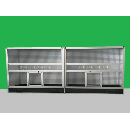 Po vyjmutí propojovací příčky vznikne proletovací klec s rozměry: šířka 198 cm, hloubka 50 cm, výška 78,5 cm. Přední stěny lze vyjmout u každé klece samostatně. Je to z důvodů snadné údržby klece. K zavěšení budky do klece, pokud je větší než samotná dvířka. Stěny této bednové klece jsou z velmi kvalitních materiálů, kterému říkáme hliníkový sendvič. Tyto výplně mohou být v barvě bílé, stříbrné, antracitové, černé, zelené nebo žluté. Do toho materiálu lze řezat, vrtat. Přední stěny nabízíme pouze s italskými pletivy, a to v černé matné barvě oko 19x19, drát 1,5 mm a stříbrné oko 16x16x1,2 mm. Na přání zákazníka můžeme vyrobit bednovou klec, ve které bude strop rovněž potažen pletivem. Pokud si zákazník objedná více než čtyři klece najednou, bude doprava těchto klecí zdarma. Pokud si zákazník přijede osobně, bude mu poskytnuta sleva 8 % na čtyři a více klecí v tomto provedení.