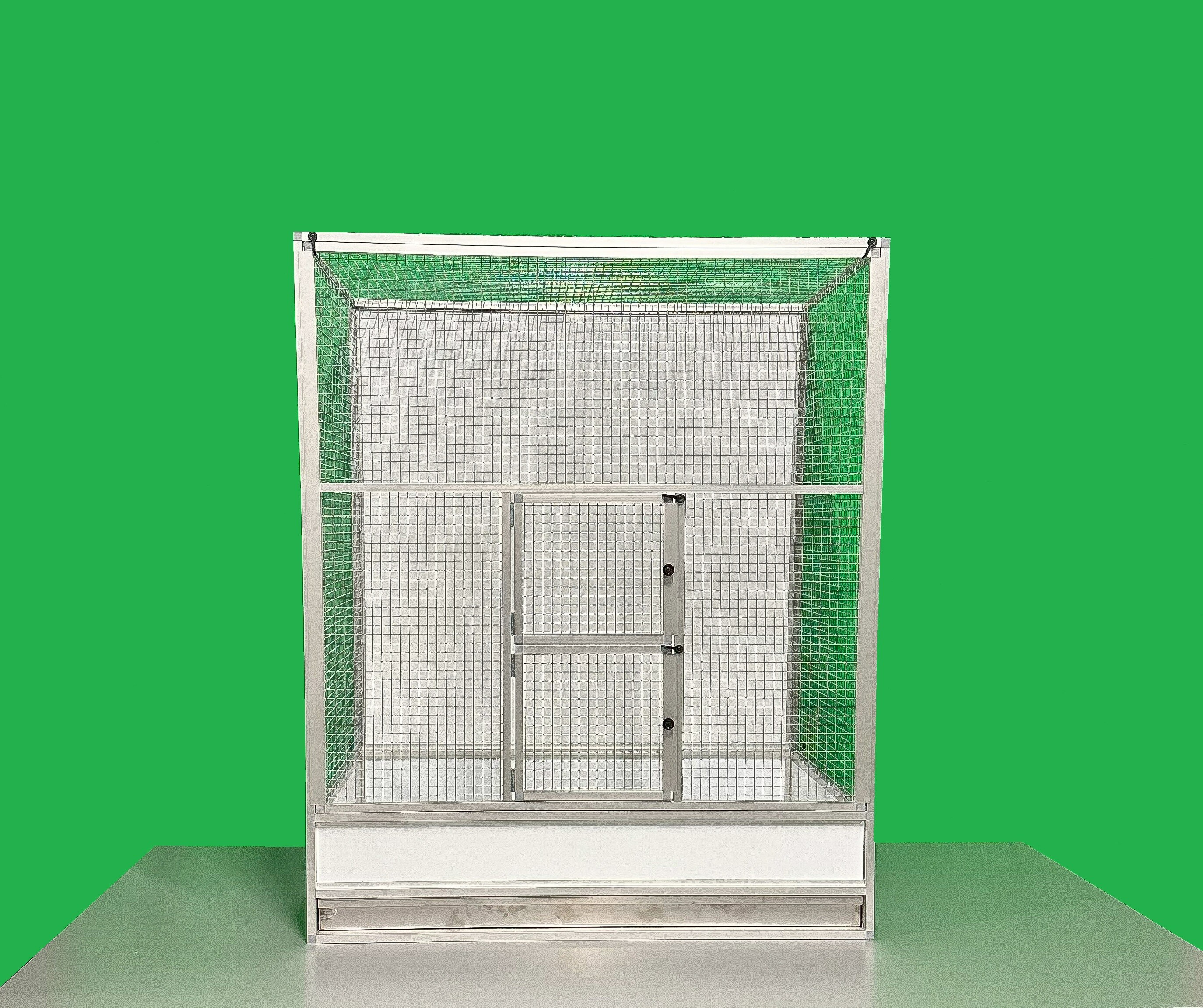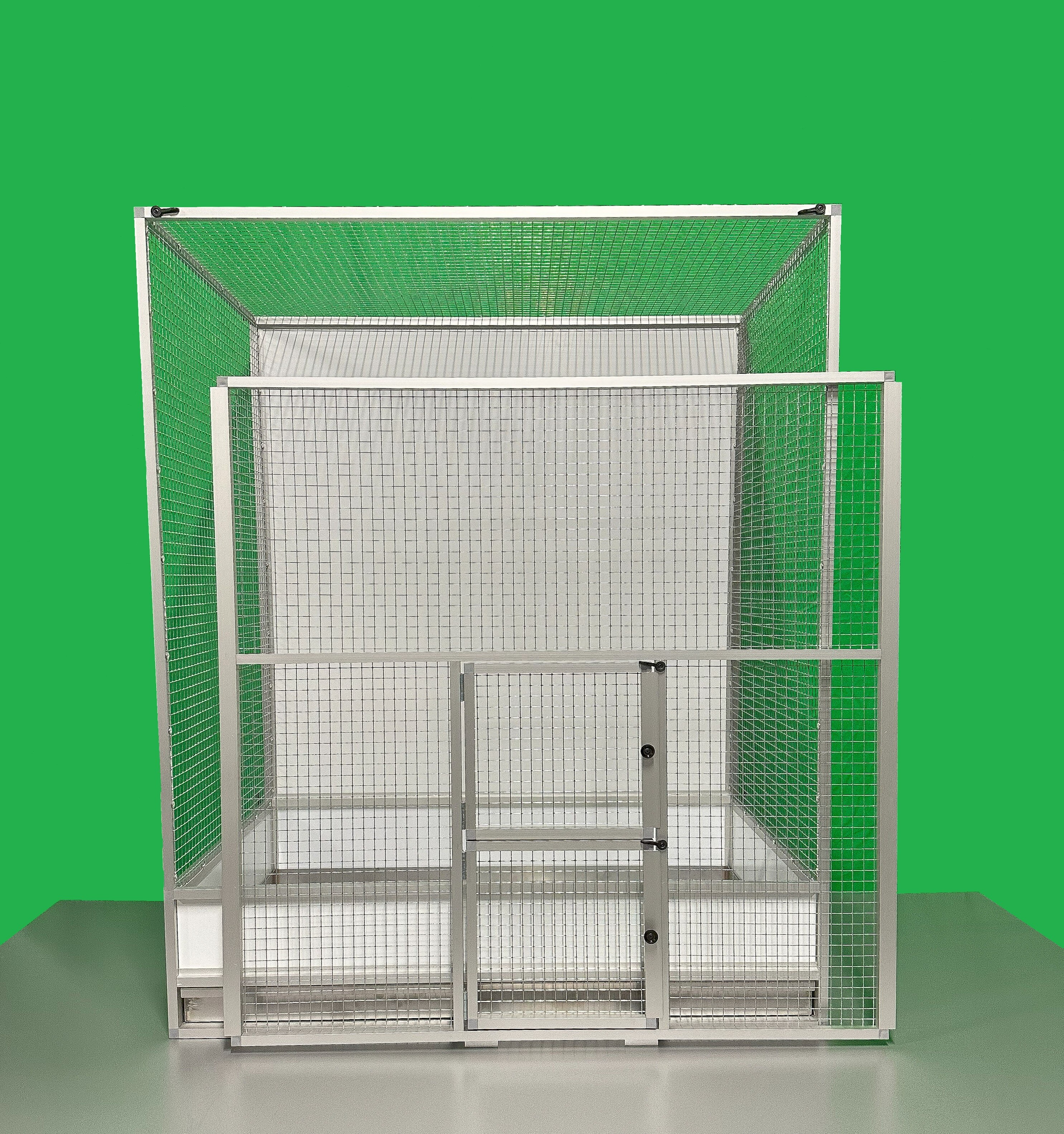 Klec je vyrobena z eloxovaných hliníkových profilů. Zadní stěna je plná a jako výplň je použit hliníkový sendvič. Pletivo je kvalitní italské pletivo značky Esafort, oko 16x16, drát 1,2 mm.
