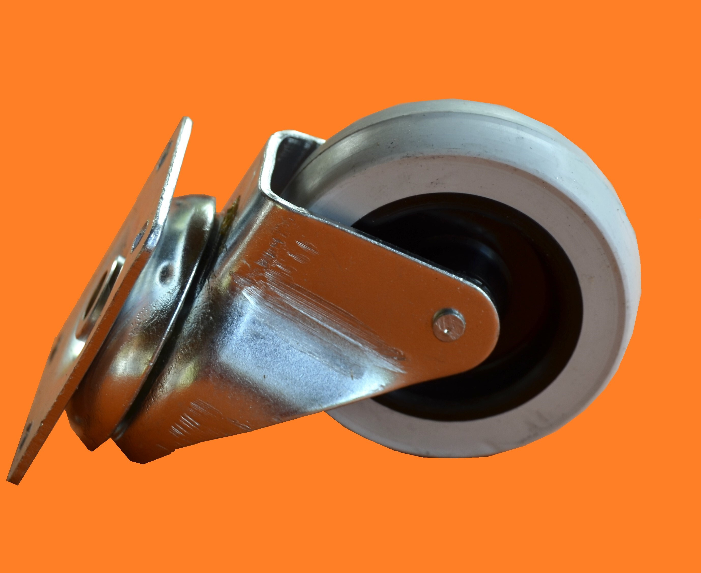 Kolečko s otočnou vidlicí a upínací deskou. Materiál kola polyamid, běhoun kolečka šedá pryž.