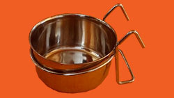 Závěsná nerezová miska do klecí pro ptáky. Průměr: 8,3 cm, výška 4,4 cm, objem 210 ml.
