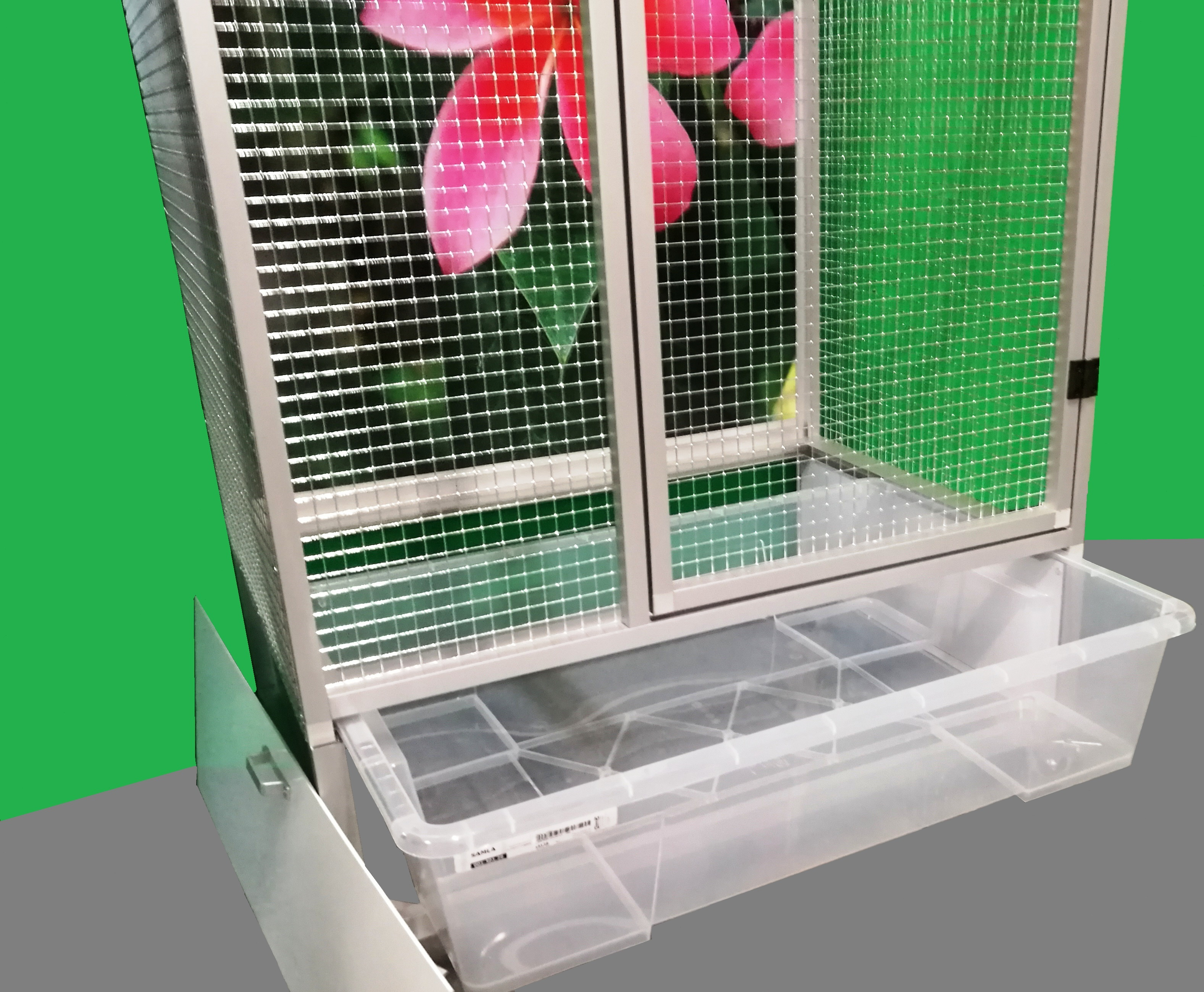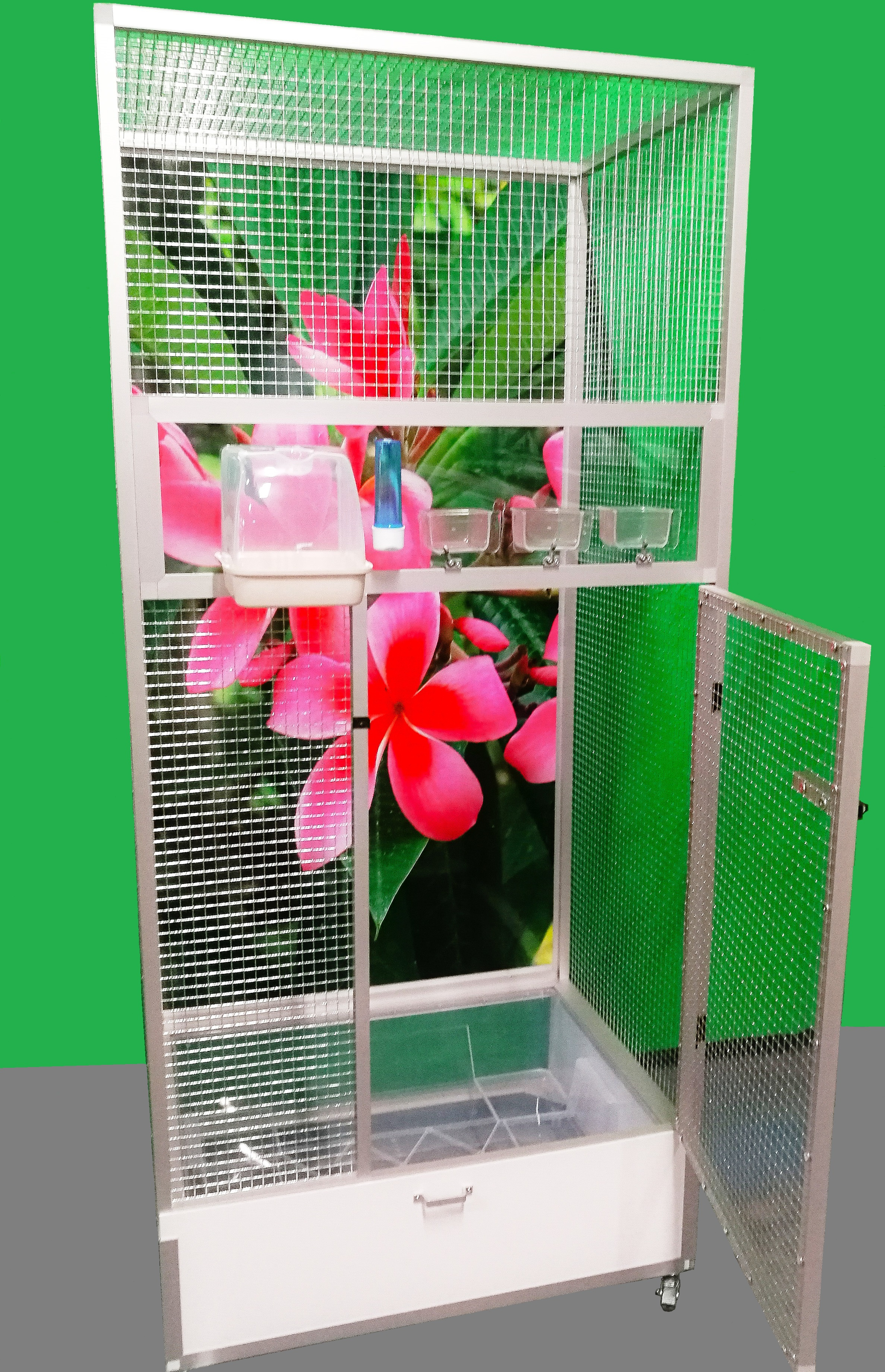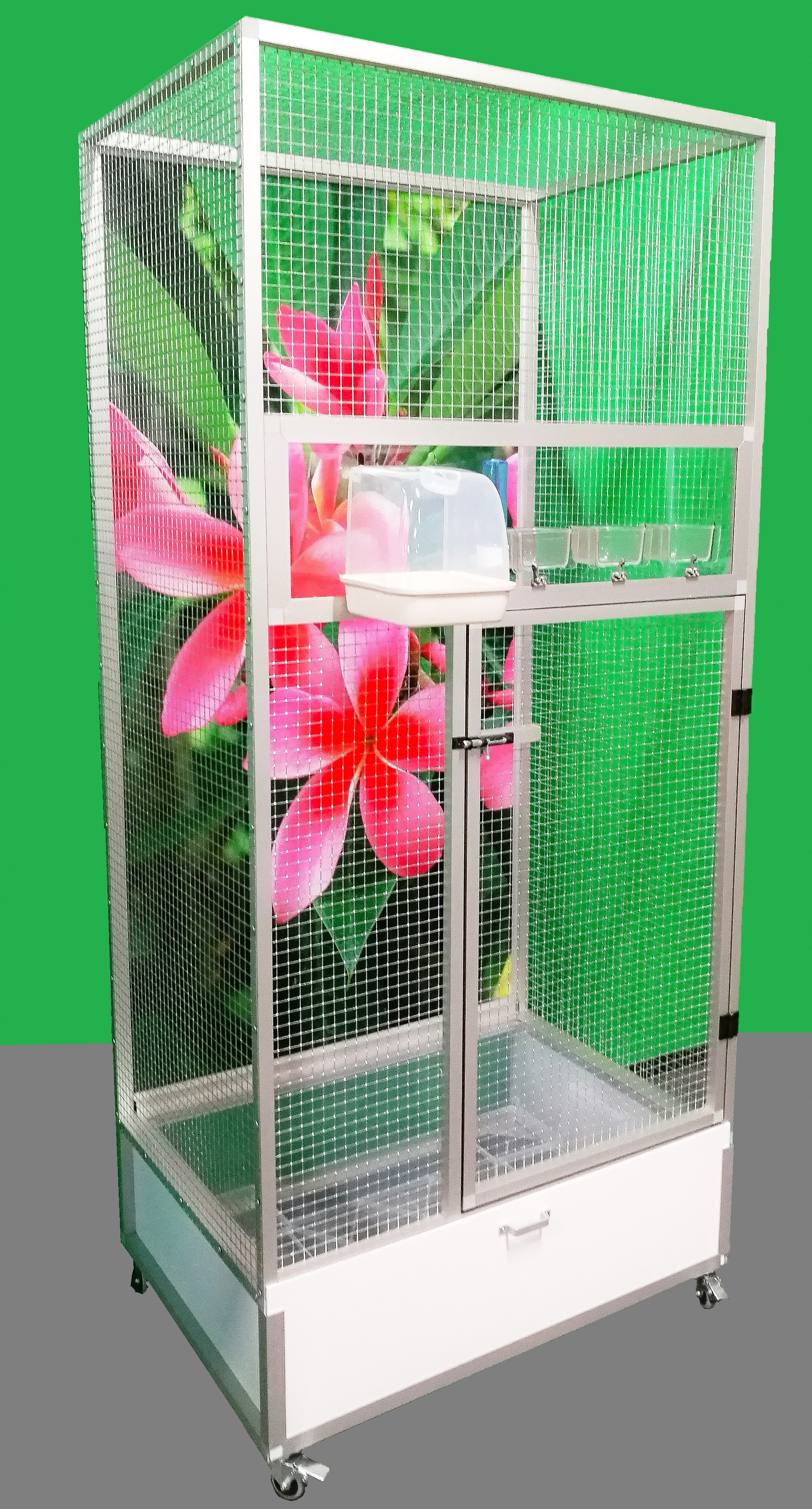 Wymiary to szerokość 83 cm, głębokość 58 cm, wysokość 180 cm. Klatka nie jest rozbieralna – składana. Przy zakupie należy pamiętać o wymiarach drzwi pomieszczenia, do którego będzie umieszczana klatka. Tylna ściana może być za dodatkową opłatą pokryta tapetą według wyboru z pięciu oferowanych wariantów. Tapeta jest laminowana i tym samym chroniona przed ścieraniem. Klatka jest umieszczona na oddzielnym podwoziu, które jest wyposażone w plastikową wanienkę, którą bardzo łatwo się manipuluje podczas czyszczenia klatki. Wanienka ma głębokość 18 cm, co wystarczająco umożliwia utrzymanie porządku wokół woliery.Przednia ściana jest wyposażona w plastikową łazienkę od włoskiego producenta, trzy wsuwane karmniki M007 i poidło. Karmniki są zabezpieczone obrotami aluhobby z blokadą. Karmniki są zaprojektowane tak, aby uniemożliwić zwierzęciu wyciągnięcie i wysypanie miski z karmą.Konstrukcja klatki jest wykonana z profili aluminiowych z powłoką Elox. Użyto bardzo wysokiej jakości sprawdzonej siatki marki Esafort 16x16x1,20mm. Na życzenie można wyposażyć klatkę w ruszt nad wanienką.Mieszkanie w klatce jest odpowiednie do nowoczesnych wnętrz. Klatka jest wyposażona w kółka, łatwo można ją przenieść na taras domu lub mieszkania.