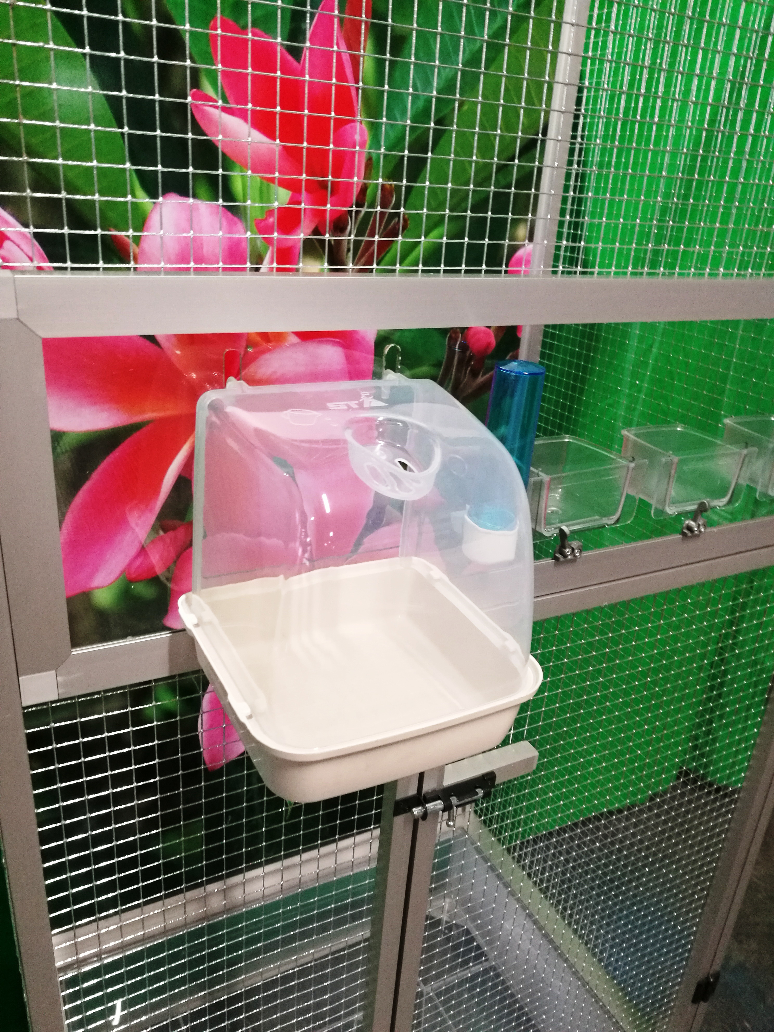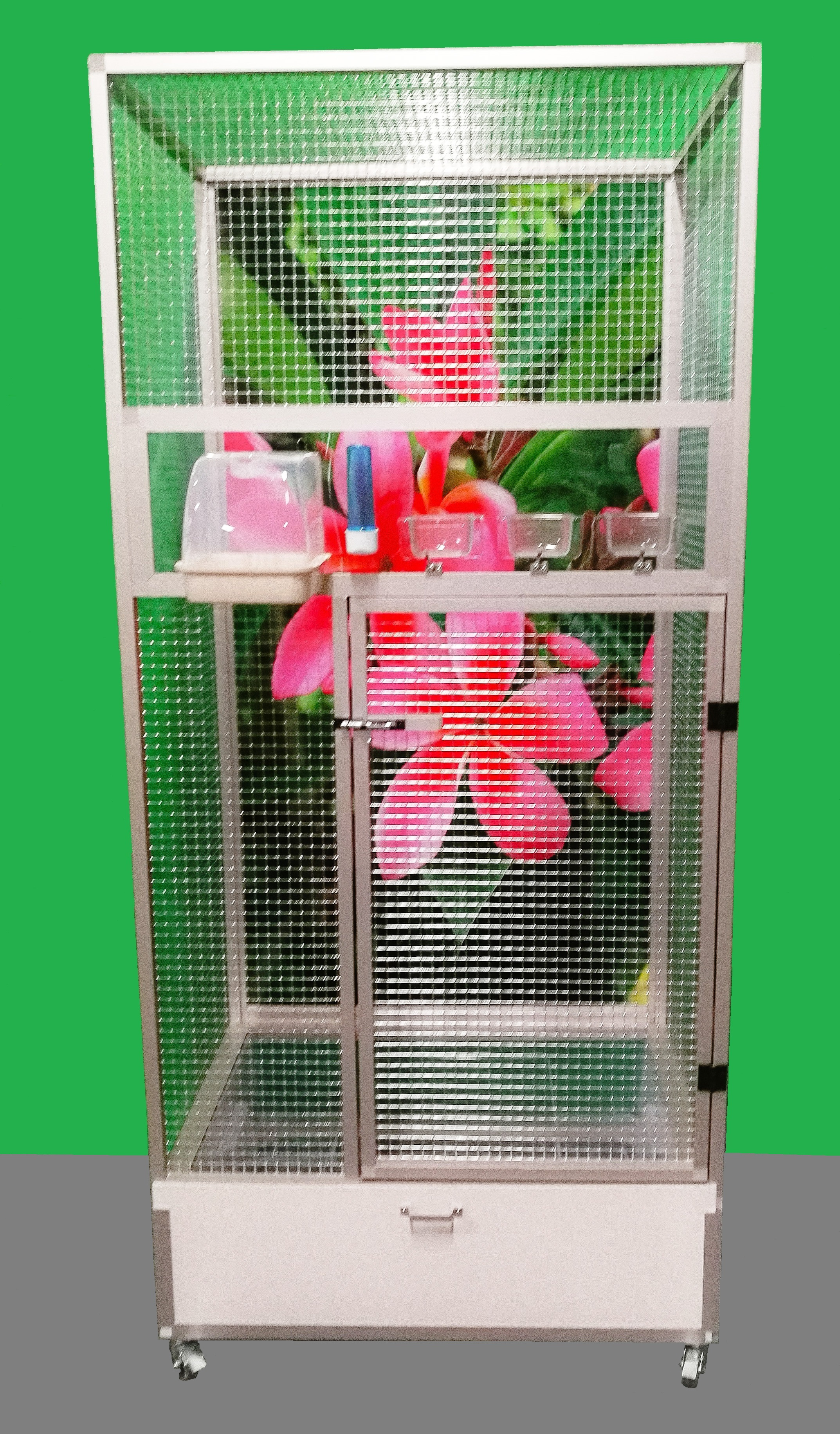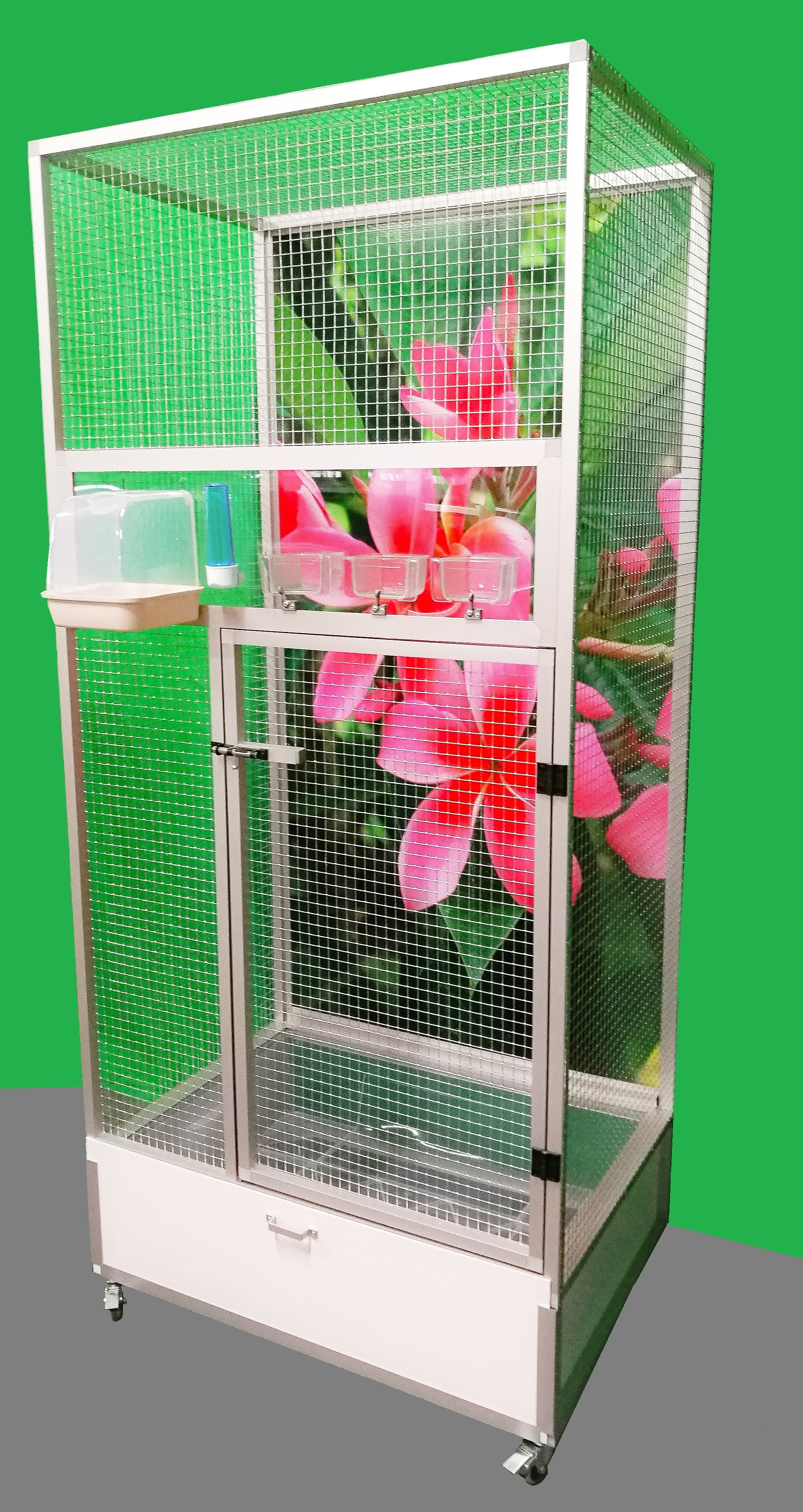 Wymiary to szerokość 83 cm, głębokość 58 cm, wysokość 180 cm. Klatka nie jest rozbieralna – składana. Przy zakupie należy pamiętać o wymiarach drzwi pomieszczenia, do którego będzie umieszczana klatka. Tylna ściana może być za dodatkową opłatą pokryta tapetą według wyboru z pięciu oferowanych wariantów. Tapeta jest laminowana i tym samym chroniona przed ścieraniem. Klatka jest umieszczona na oddzielnym podwoziu, które jest wyposażone w plastikową wanienkę, którą bardzo łatwo się manipuluje podczas czyszczenia klatki. Wanienka ma głębokość 18 cm, co wystarczająco umożliwia utrzymanie porządku wokół woliery.Przednia ściana jest wyposażona w plastikową łazienkę od włoskiego producenta, trzy wsuwane karmniki M007 i poidło. Karmniki są zabezpieczone obrotami aluhobby z blokadą. Karmniki są zaprojektowane tak, aby uniemożliwić zwierzęciu wyciągnięcie i wysypanie miski z karmą.Konstrukcja klatki jest wykonana z profili aluminiowych z powłoką Elox. Użyto bardzo wysokiej jakości sprawdzonej siatki marki Esafort 16x16x1,20mm. Na życzenie można wyposażyć klatkę w ruszt nad wanienką.Mieszkanie w klatce jest odpowiednie do nowoczesnych wnętrz. Klatka jest wyposażona w kółka, łatwo można ją przenieść na taras domu lub mieszkania.
