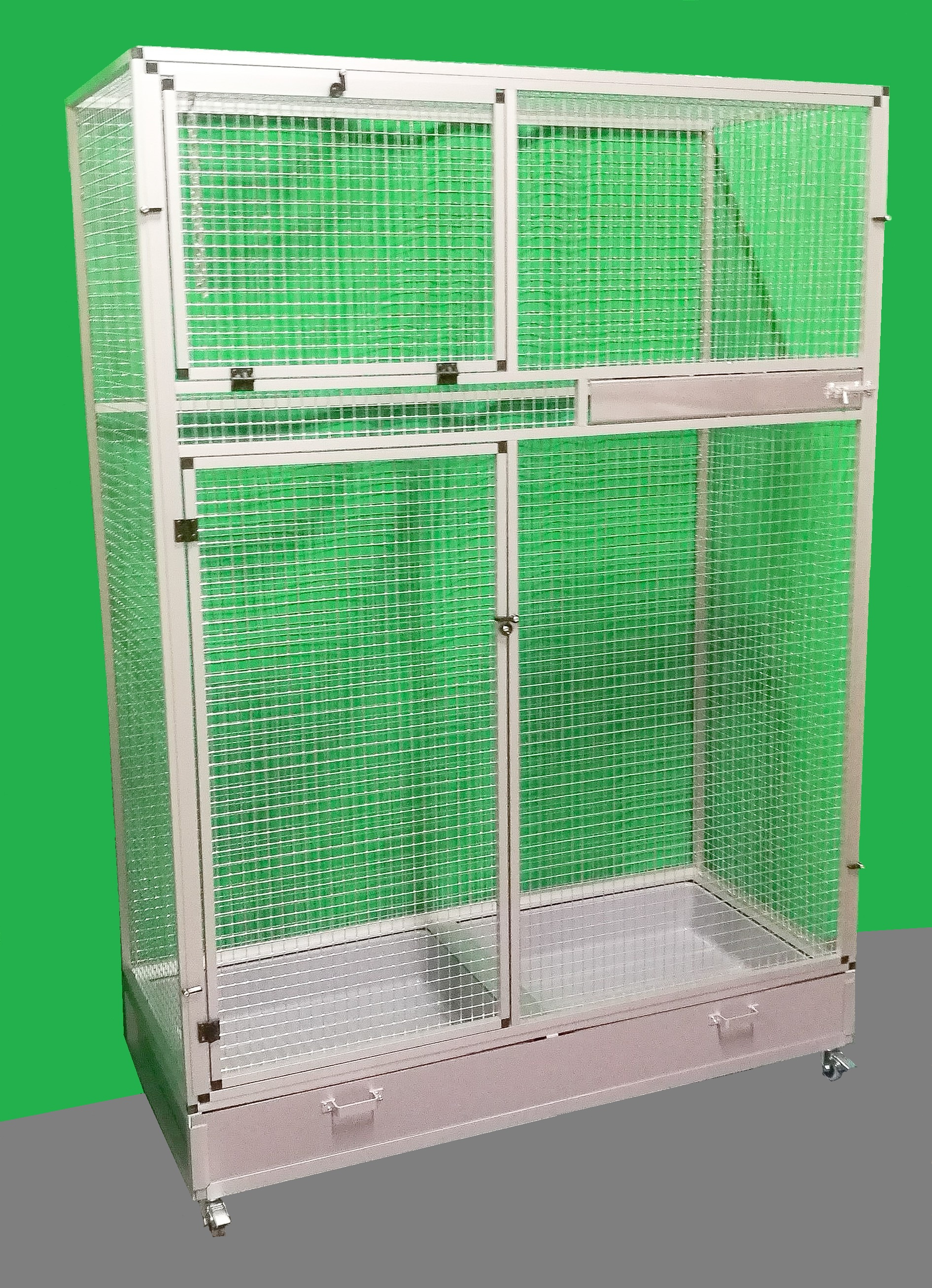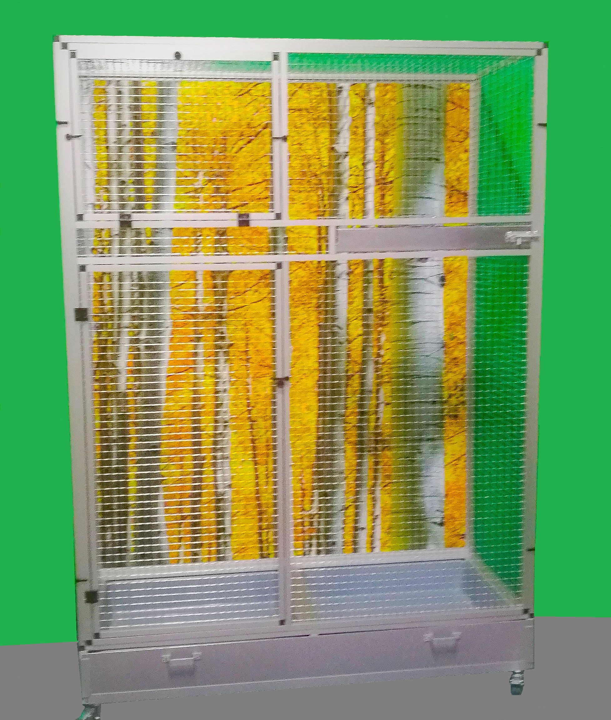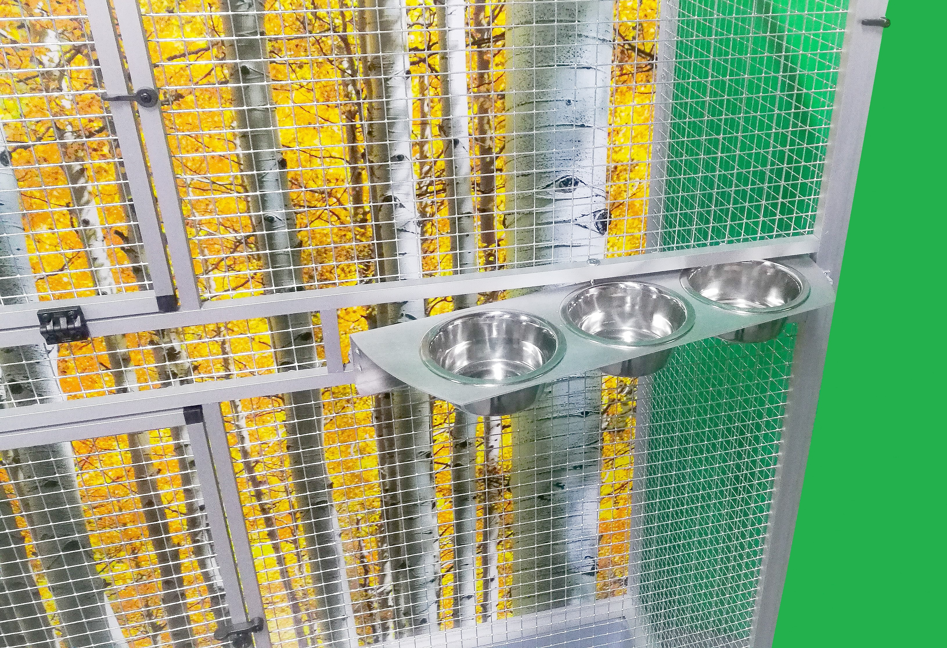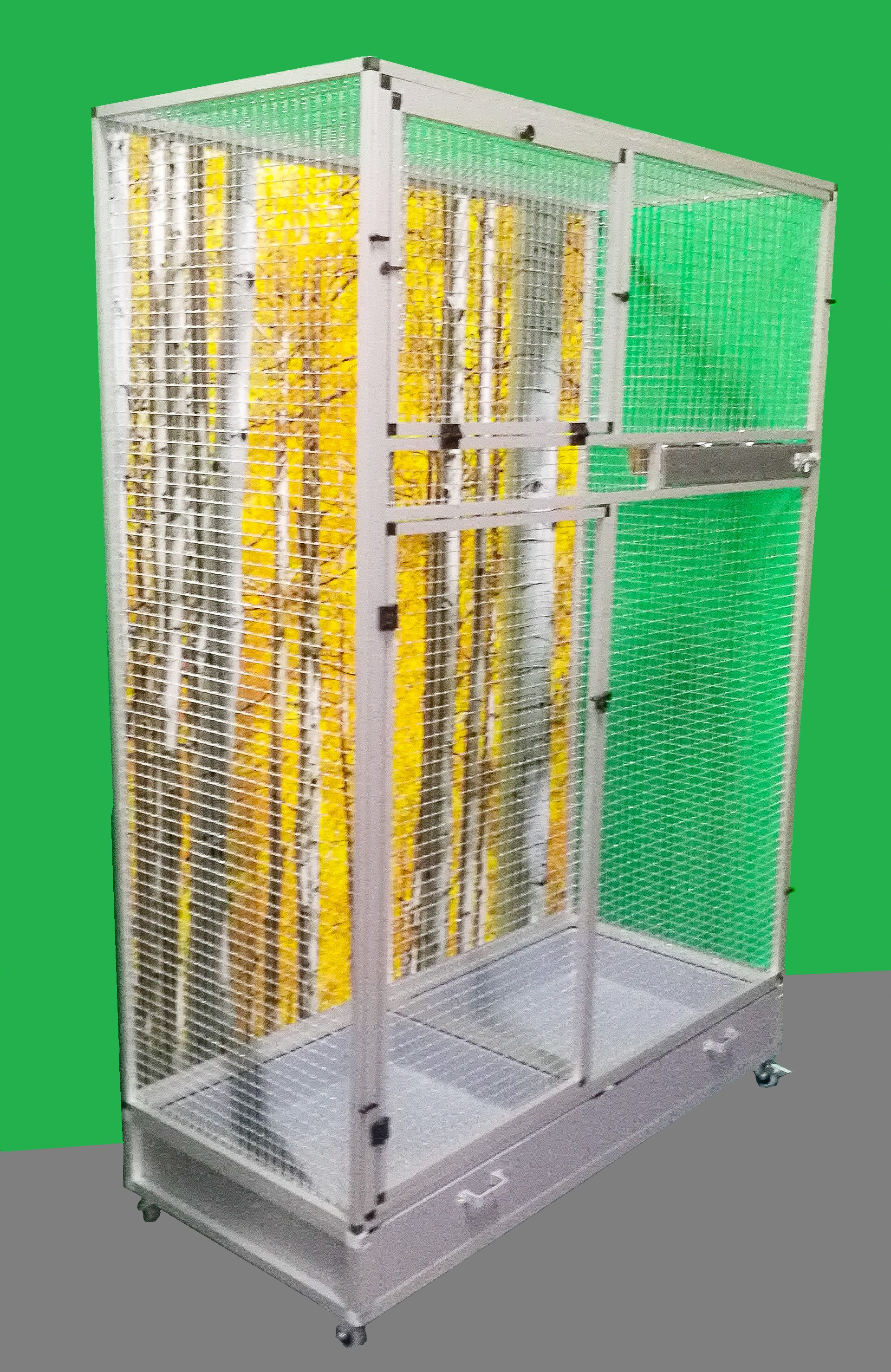 Manipulacja wanienkami podczas czyszczenia klatki jest bardzo łatwa. Wanienka ma głębokość 18 cm, co wystarczająco umożliwia utrzymanie porządku wokół woliery. Przednia ściana jest wyposażona w obrotowy stół do karmienia z trzema miskami o pojemności 0,35 l. Na naszej stronie ma oznaczenie KPM03. Konstrukcja klatki jest wykonana z aluminiowych profili z powłoką anodowaną. Użyto bardzo wysokiej jakości sprawdzonej siatki marki Esafort 16x16x1,20 mm. Jest wyposażona w kółka, łatwo można ją przenieść na taras domu lub mieszkania. Waga klatki ok. 20 kg. Na życzenie klienta możemy uzupełnić klatkę o tak zwane pokrywy. Te pokrywy umieszcza się w ramach klatki. Są to oddzielne ramy z pleksi. Plexi są umieszczone w ramie tak, aby umożliwiały zwierzęciu wspinanie się po siatce, a jednocześnie większość zanieczyszczeń pozostawała wewnątrz klatki.