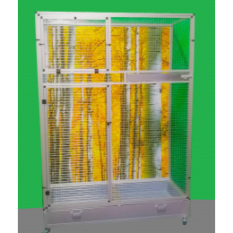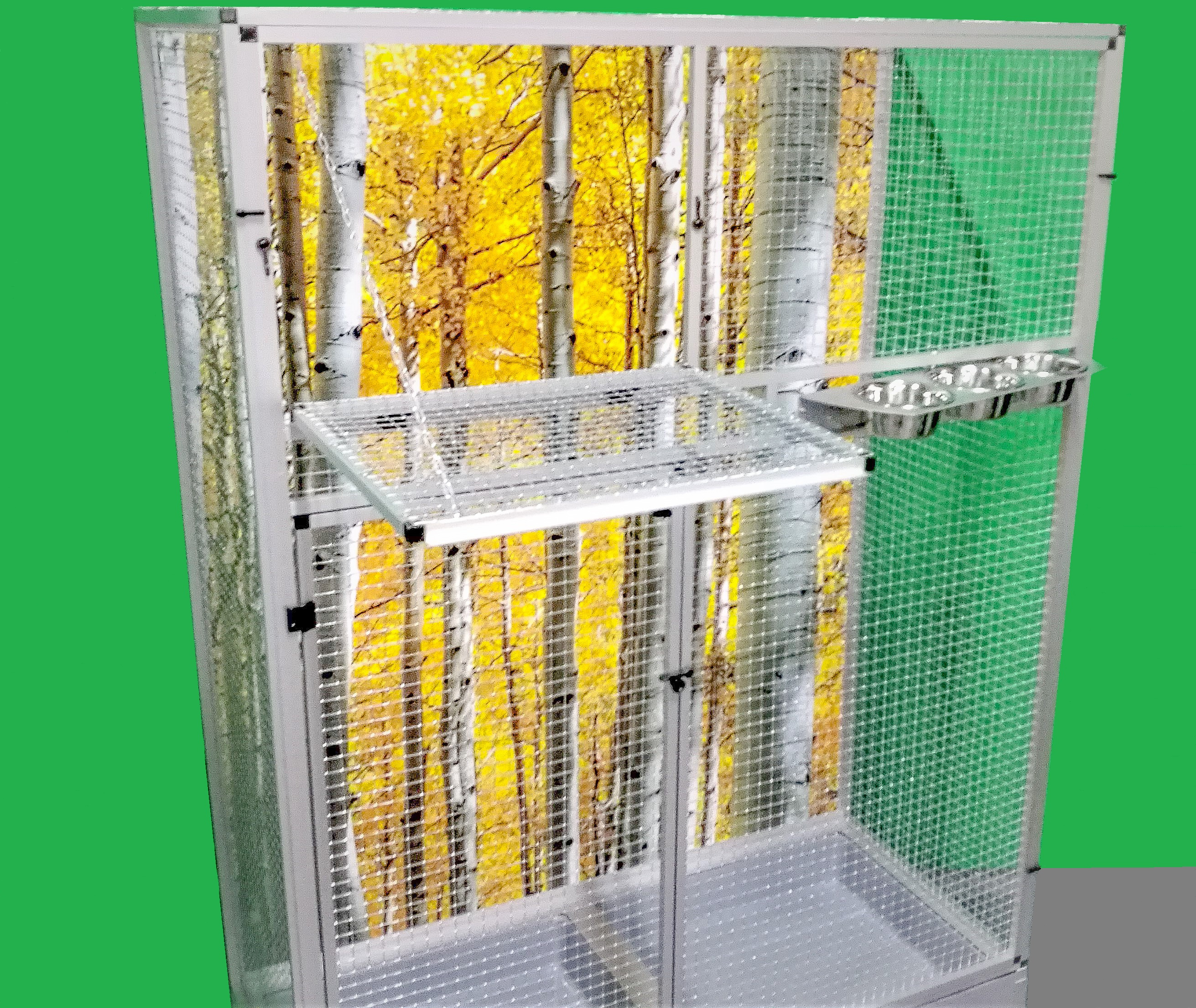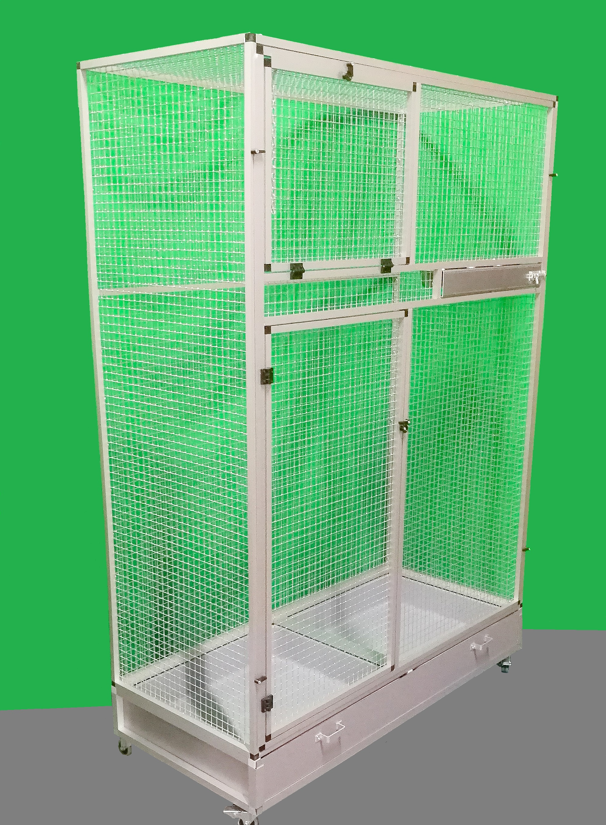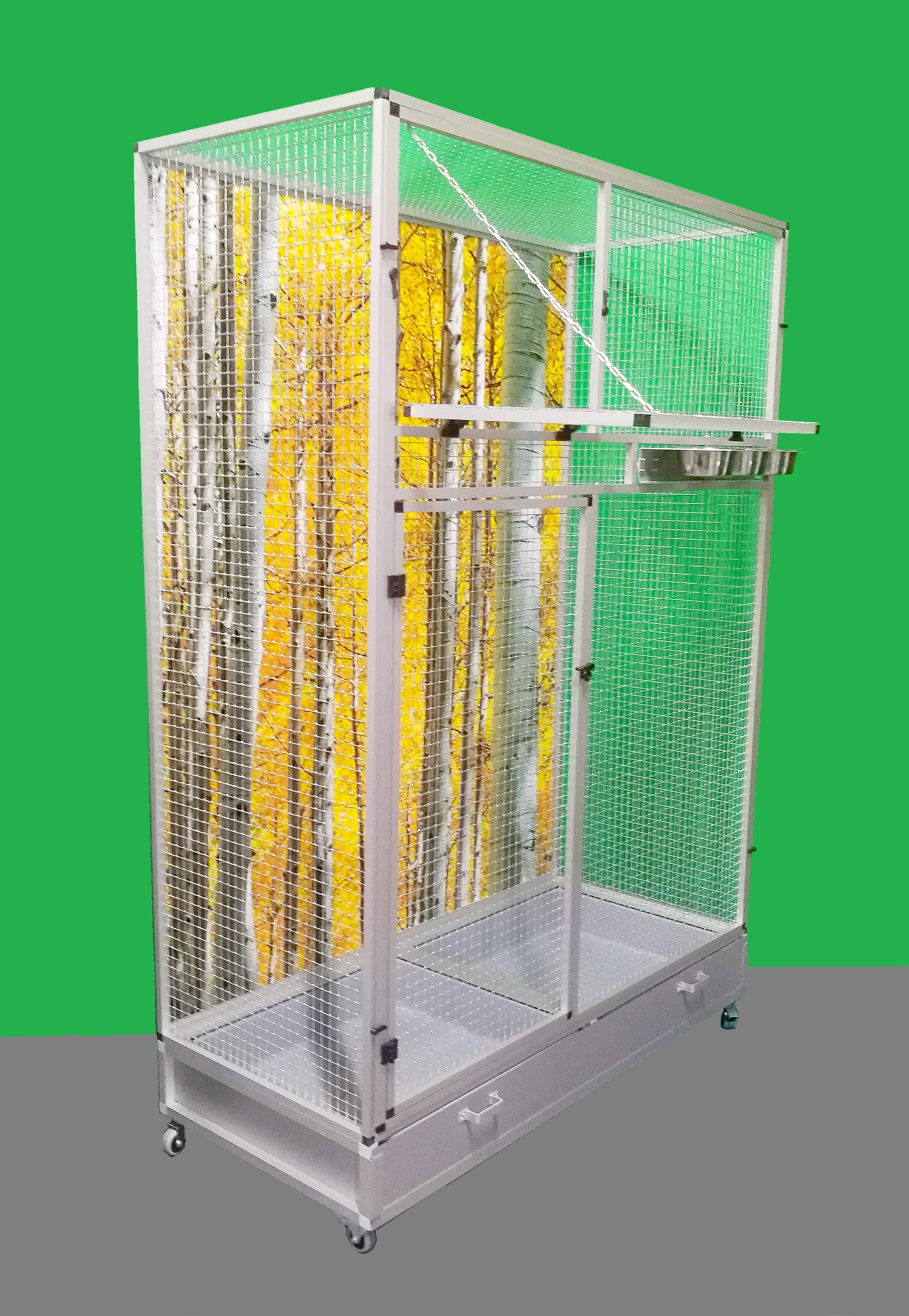 Manipulacja wanienkami podczas czyszczenia klatki jest bardzo łatwa. Wanienka ma głębokość 18 cm, co wystarczająco umożliwia utrzymanie porządku wokół woliery. Przednia ściana jest wyposażona w obrotowy stół do karmienia z trzema miskami o pojemności 0,35 l. Na naszej stronie ma oznaczenie KPM03. Konstrukcja klatki jest wykonana z aluminiowych profili z powłoką anodowaną. Użyto bardzo wysokiej jakości sprawdzonej siatki marki Esafort 16x16x1,20 mm. Jest wyposażona w kółka, łatwo można ją przenieść na taras domu lub mieszkania. Waga klatki ok. 20 kg. Na życzenie klienta możemy uzupełnić klatkę o tak zwane pokrywy. Te pokrywy umieszcza się w ramach klatki. Są to oddzielne ramy z pleksi. Plexi są umieszczone w ramie tak, aby umożliwiały zwierzęciu wspinanie się po siatce, a jednocześnie większość zanieczyszczeń pozostawała wewnątrz klatki.
