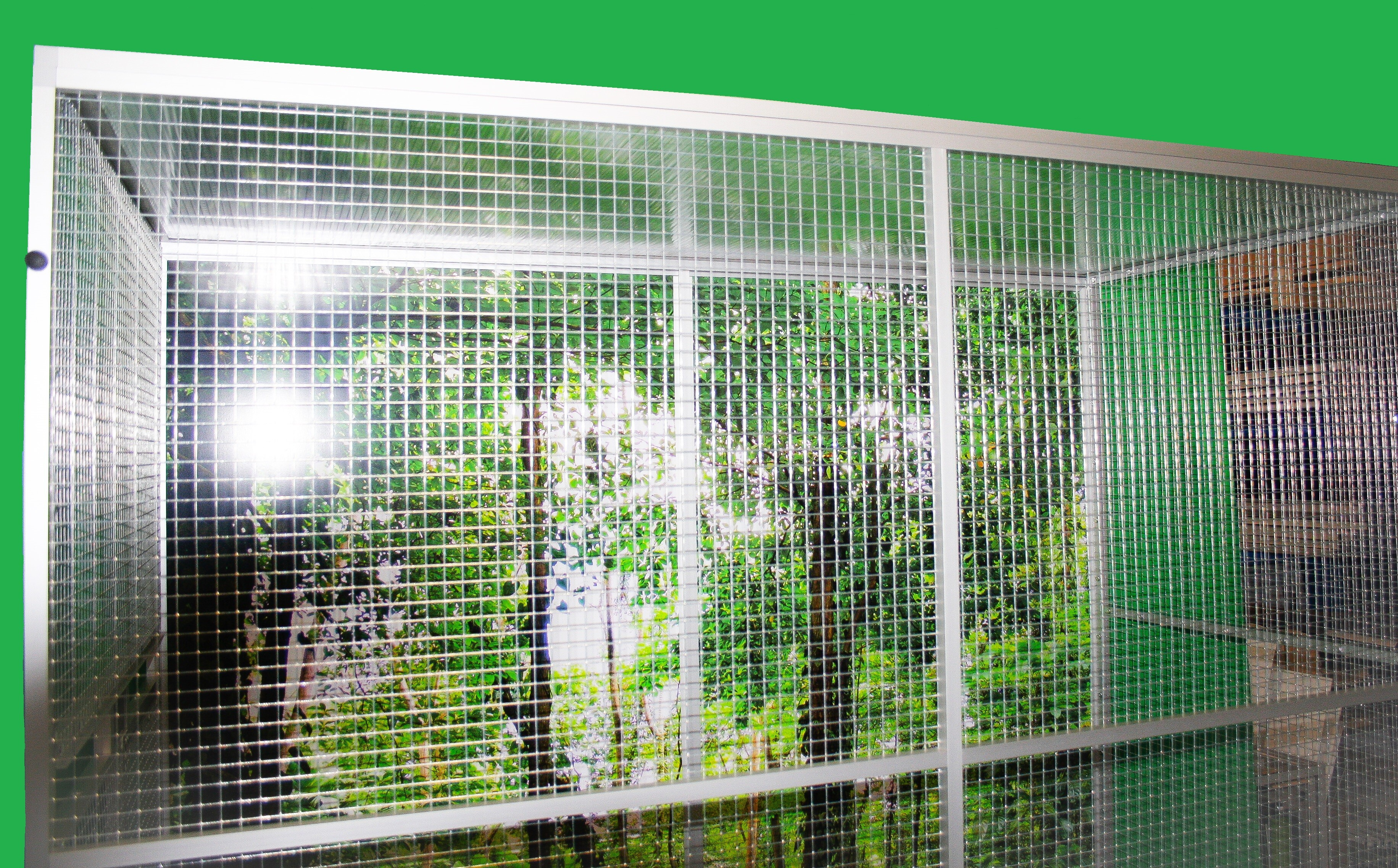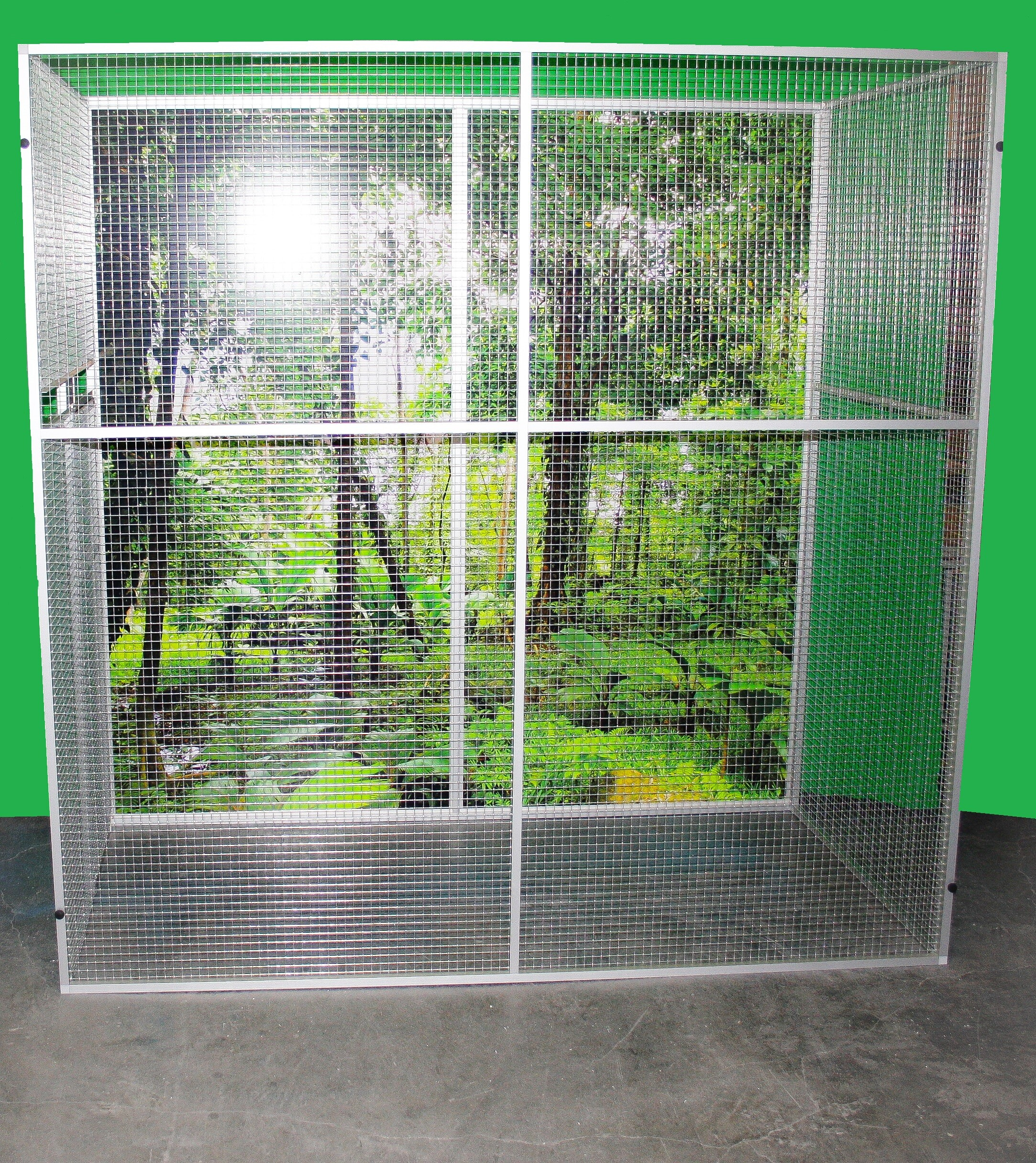 Woliera składa się z pięciu oddzielnych ram. Tę wolierę oferujemy tylko z powierzchnią prawdziwego srebrnego eloksalu. Na życzenie za dopłatą 1200,- Kč możemy wykonać w czarnym anodowanym wykończeniu. Tylna ściana tej woliery jest wykonana z materiału, który nazywamy aluminiowym sandwich'em i zawsze jest pokryta fototapetą z motywem dżungli. Tapeta jest wykonana z materiału nieszkodliwego dla zdrowia, z zastosowaniem laminacji chroniącej przed ścieraniem. Wypełnienia są wsunięte do profilu oznaczonego jako HJ20V. W ten sposób uniemożliwia się zwierzęciu dotarcie do krawędzi deski, a tym samym chroni się również tapetę. Ta tapeta jest w cenie woliery. Konstrukcja woliery jest pokryta włoską markową siatką Esafort o oczkach 19x19 i grubości drutu 1,45 mm. Na żądanie możemy zamienić tę siatkę na inną tej samej marki.Voliera jest wyposażona w dwa niezależne obrotowe stoły do karmienia. Jeden karmnik przeznaczony na wodę wyposażony w miskę o pojemności 0,75l. Drugi karmnik jest wyposażony w dwie miski o pojemności 0,35l.Voliery nie są całkowicie idealne dla dużych papug.Jednak jest to spowodowane siatką, a także obrotowymi stołami paszowymi.Obrotowe stoły do karmienia mają zabezpieczenie przed wyciągnięciem przez papugę, ale papuga wielkości Żako czasami potrafi sobie z tym systemem poradzić.Woliera ze względu na swoje rozmiary nie ma wysuwanych szuflad.