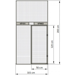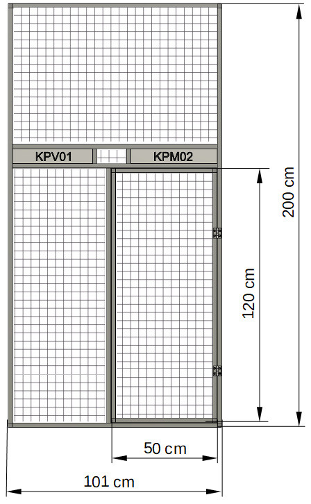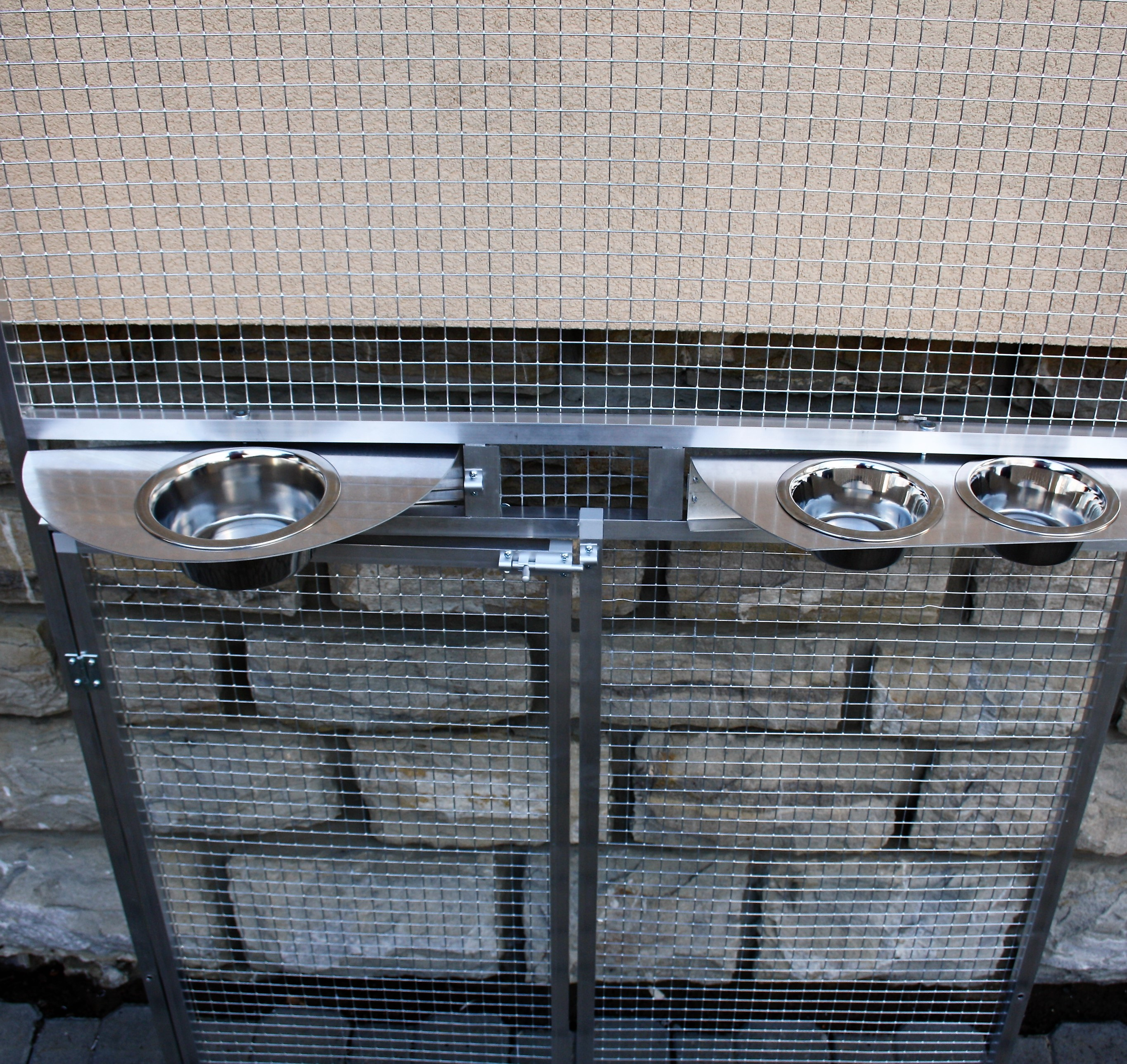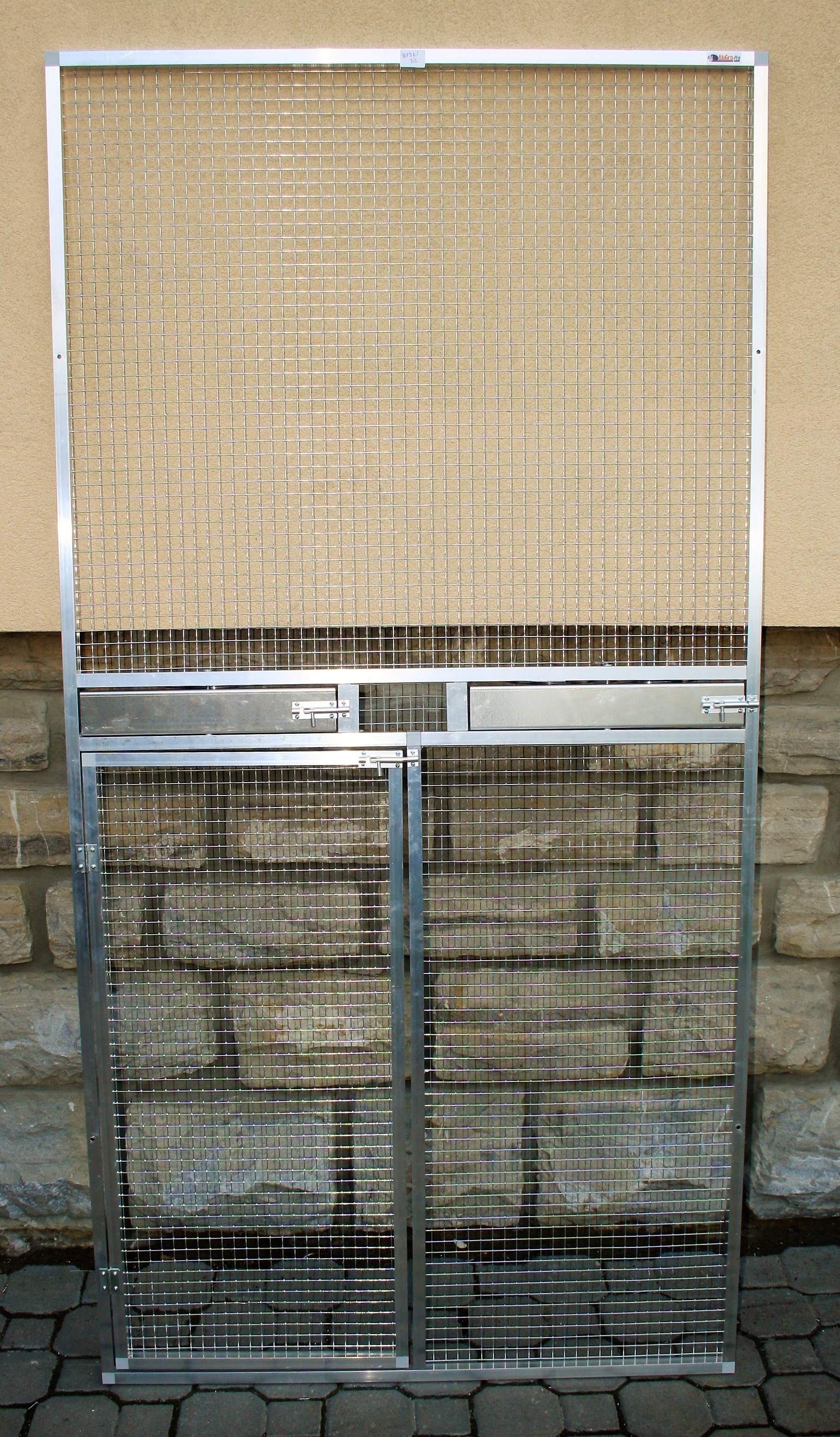 Přední stěna se dvěma krmnými pulty je potažena pletivem Esafort 19x19x1,45mm. Na přání zákazníka lze použit i jiná pletiva z naší nabídky. Jeden krmný pult je určen na vodu (nerezová miska má obsah 750ml) a je samostatný. Druhý krmný pult je tvořen dvěma nerezovými miskami o obsahu 350ml. Desky krmných pultů jsou hliníkové, síla materiálu 2mm. Jedná se o přední stěnu, která je velmi žádaná. I my tuto sestavu používáme do stavebnic konstrukcí voliér.