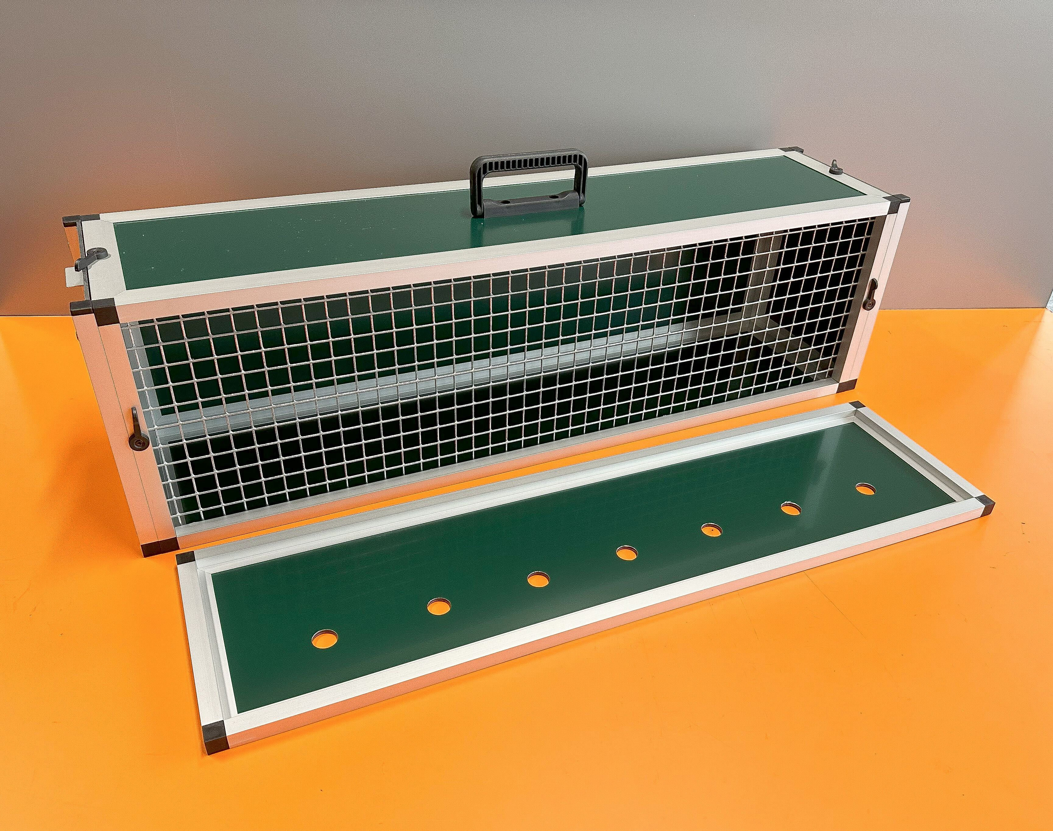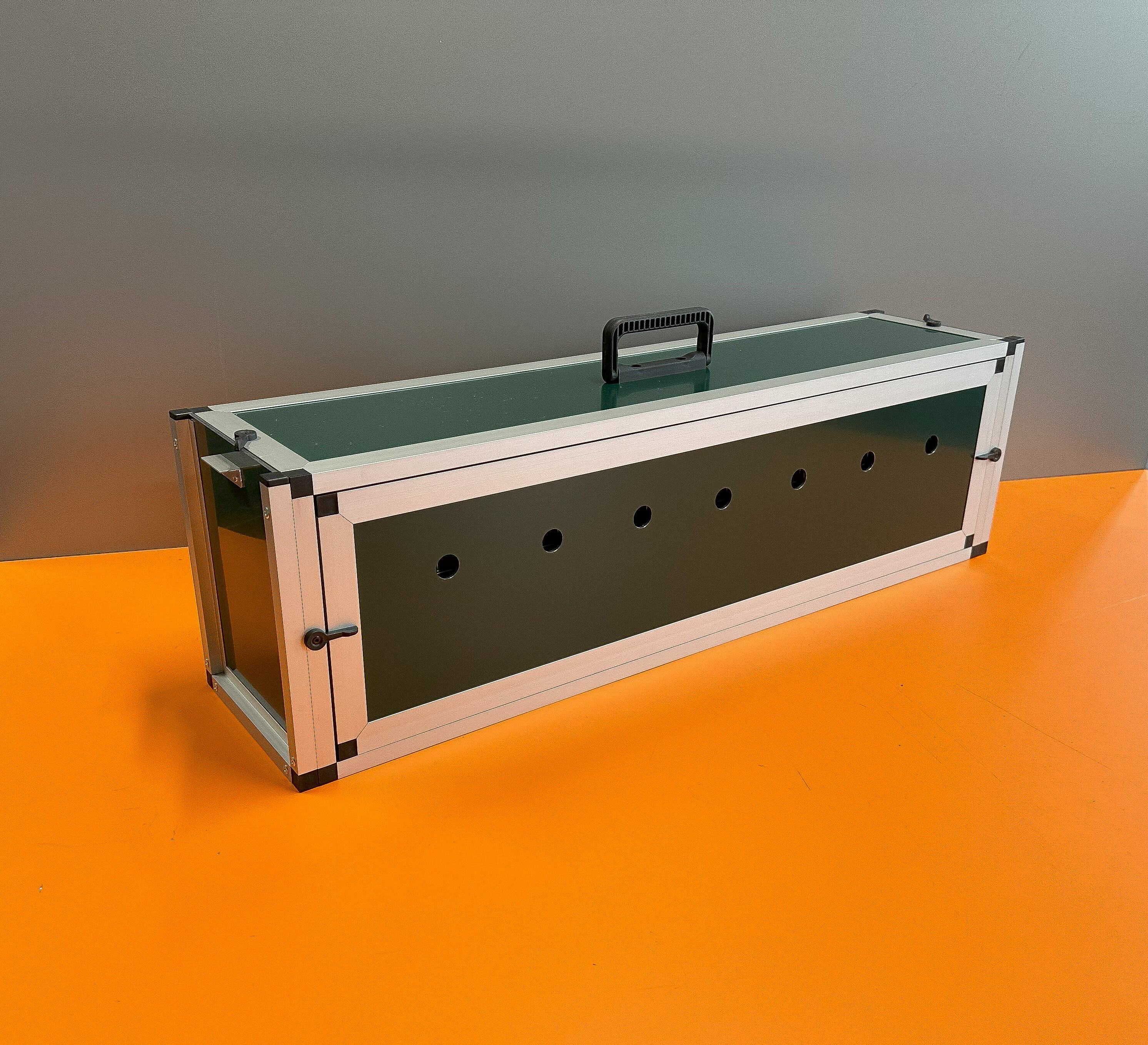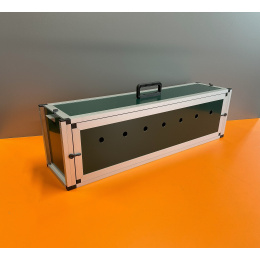 Přepravní box – tubus je určen pro přepravu papoušku druhu Ara. Použité materiály jsou velice kvalitní a omyvatelné. Použité pletivo oko 19x19 síla drátu 2mm Přední stěna, záklop jdou lehce vyjmout. Tubus je vyroben z profilu 15x15x1 mm s povrchovou úpravou elox. Rozměry přepravního tubusu jsou šířka 83 cm, hloubka 20 cm, výška 24 cm. Výplně přepravky jsou vyrobeny z hliníkového sendviče. Barva může být stříbrná, zelená, bílá, antracitová. Celková váha přepravky je pouze 4,5kg. Na přání může být přepravka delší případně i jiných rozměrů.