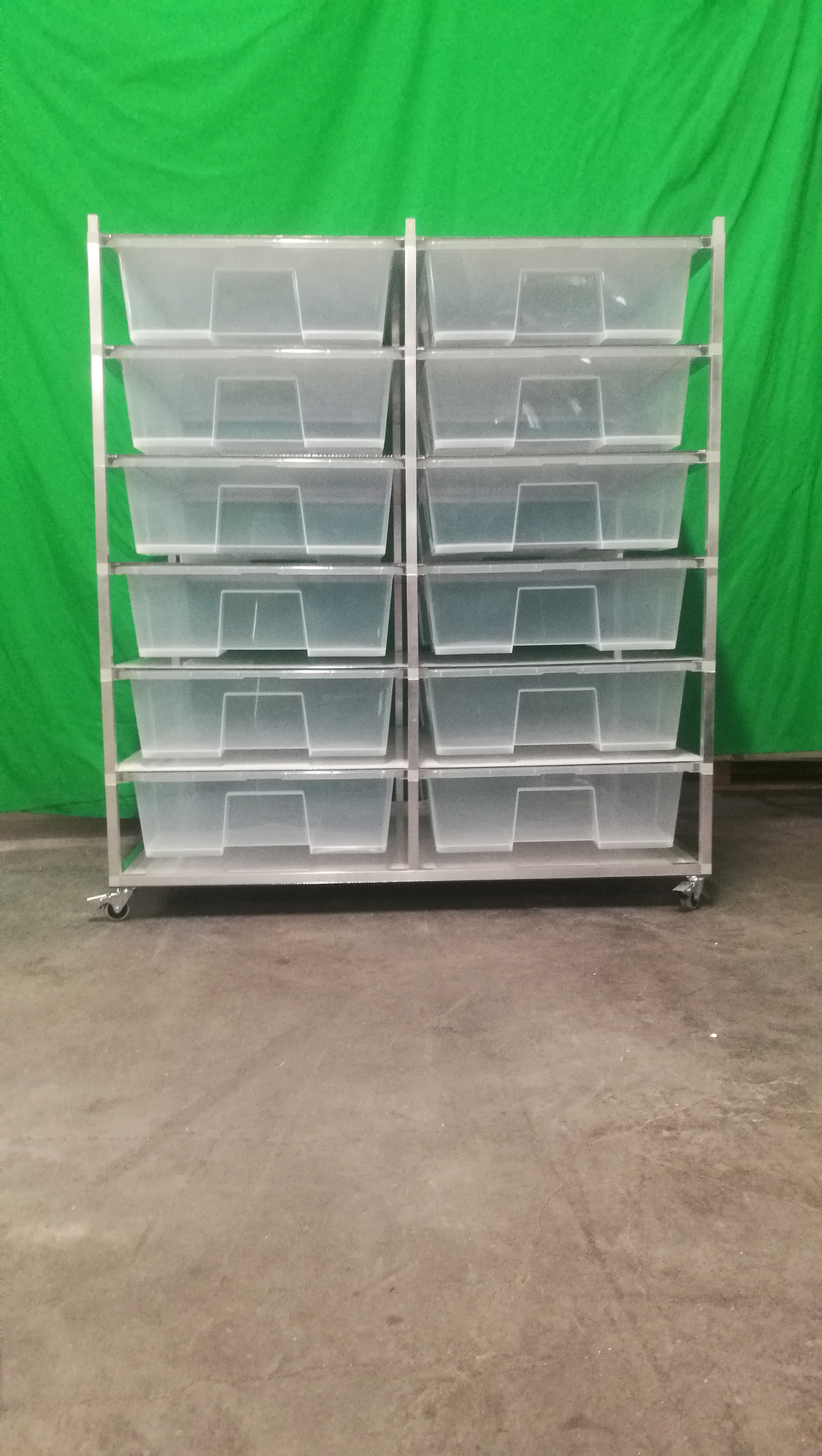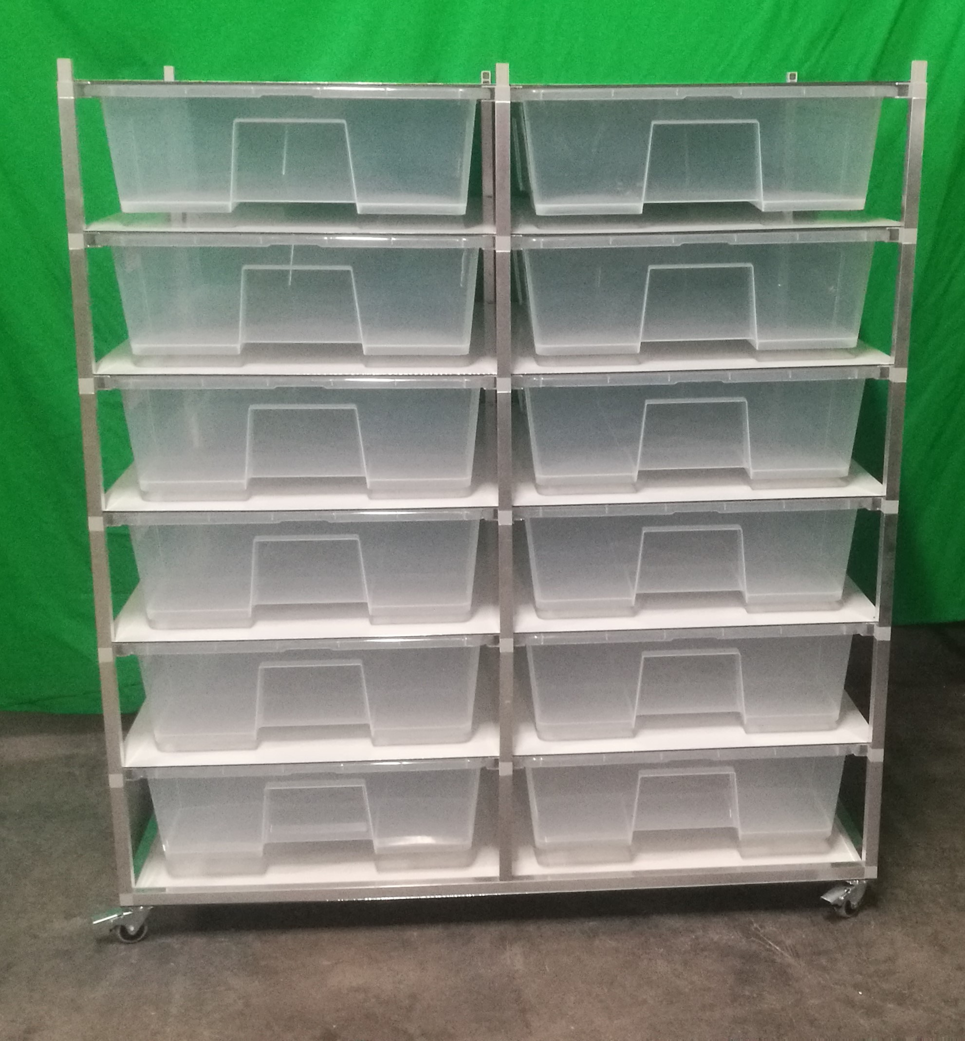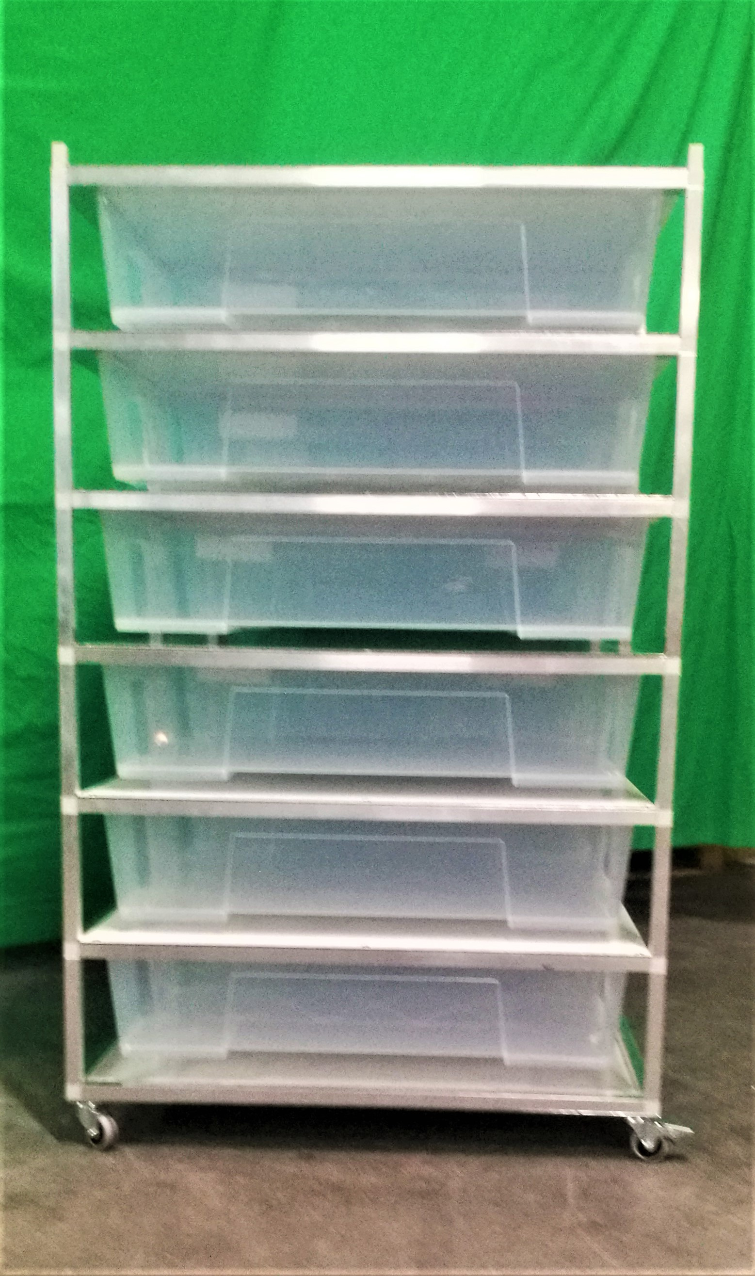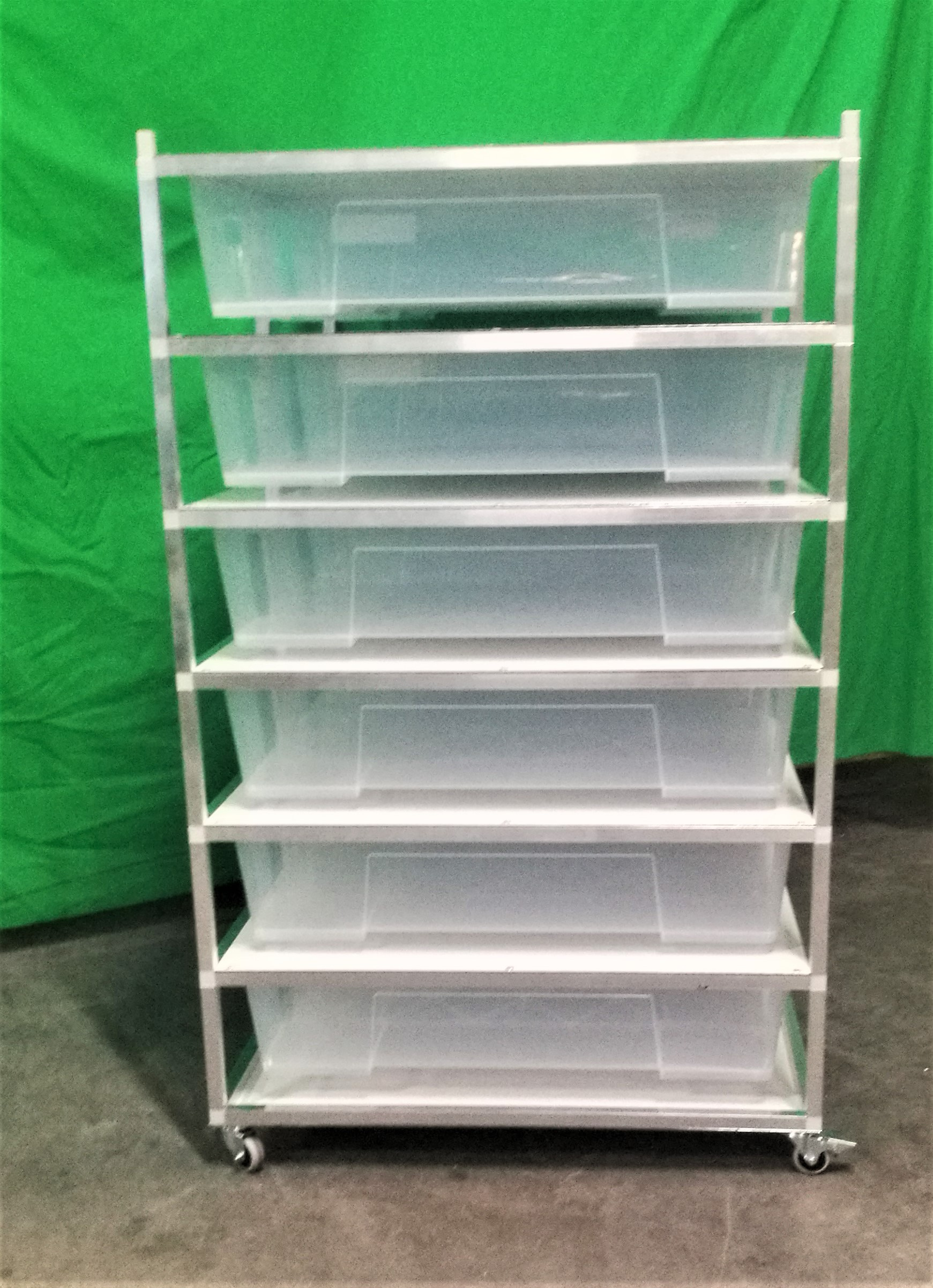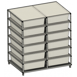 Chovatelský regálový Rack systém je často využíván ke komerčním ale i k hobby chovům. Regál je určeny pro plastové boxy o rozměru š 56, h 78, v 18 cm. Tyto boxy se taky nazývají Samla boxy. Pokud si zákazník boxy v prodejnách Ikea zajistí sám, je potřeba na nich udělat malou úpravu, a to odříznout po stranách malé výstupky tak, aby šly boxy do regálu lehce zasunout. Přepážky mezi patry jsou tvořeny deskami z tzv. hliníkového sendviče. Tato deska je velmi vhodná pro svoji pevnost, a přitom je váhově velmi příznivá. Kolečka s gumovou pryží a brzdou umožňují velmi jednoduchý a lehký pohyb s celým regálem. Kolečka mohou být nahrazena hliníkovými nožkami. Na přání zákazníka umíme Rack vyrobit na počet boxů jak do výšky, tak do šířky podle požadavků chovatele. Rovněž lze Rack zhotovit z profilů s eloxovaným povrchem, a to v barvě stříbrné a černé. Do každého patra lze vkládat topné fólie pod chovné boxy. Boxy jsou součástí Racku.