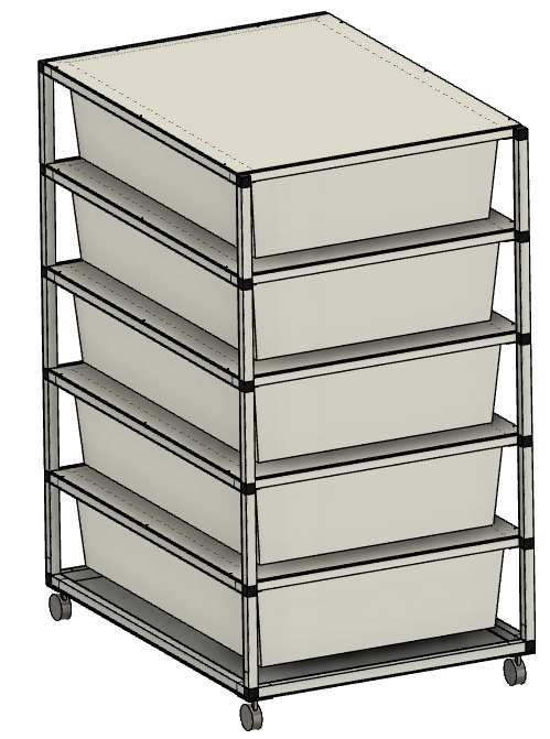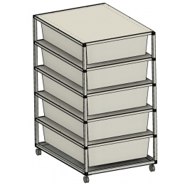 Chovatelský regálový Rack systém je často využíván ke komerčním ale i k hobby chovům. Regál je určeny pro plastové boxy o rozměru š 56, h 78, v 18 cm. Tyto boxy se taky nazývají Samla boxy. Pokud si zákazník boxy v prodejnách Ikea zajistí sám, je potřeba na nich udělat malou úpravu, a to odříznout po stranách malé výstupky tak, aby šly boxy do regálu lehce zasunout. Přepážky mezi patry jsou tvořeny deskami z tzv. hliníkového sendviče. Tato deska je velmi vhodná pro svoji pevnost, a přitom je váhově velmi příznivá. Kolečka s gumovou pryží a brzdou umožňují velmi jednoduchý a lehký pohyb s celým regálem. Kolečka mohou být nahrazena hliníkovými nožkami. Na přání zákazníka umíme Rack vyrobit na počet boxů jak do výšky, tak do šířky podle požadavků chovatele. Rovněž lze Rack zhotovit z profilů s eloxovaným povrchem, a to v barvě stříbrné a černé. Do každého patra lze vkládat topné fólie pod chovné boxy. Boxy jsou součástí Racku.