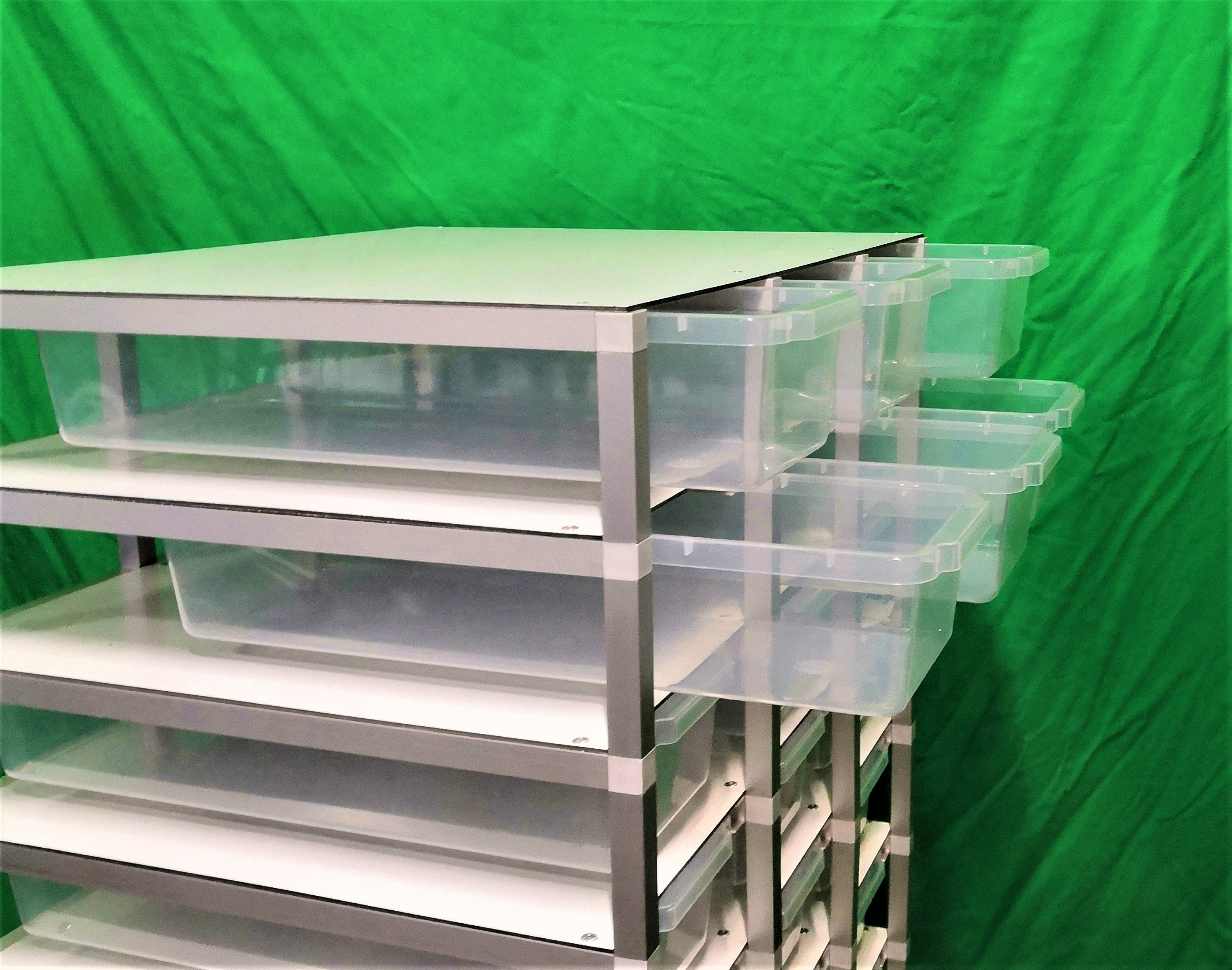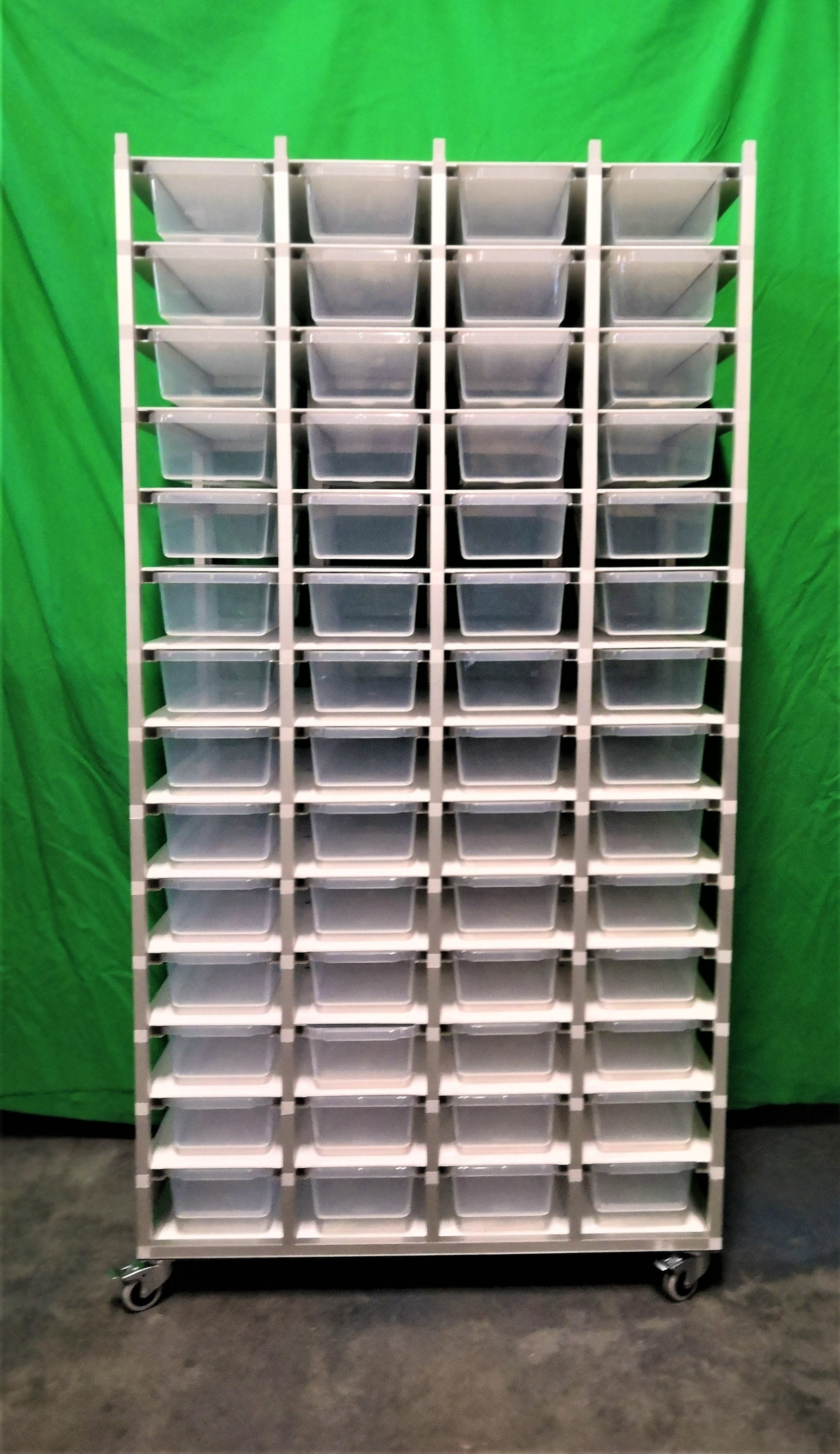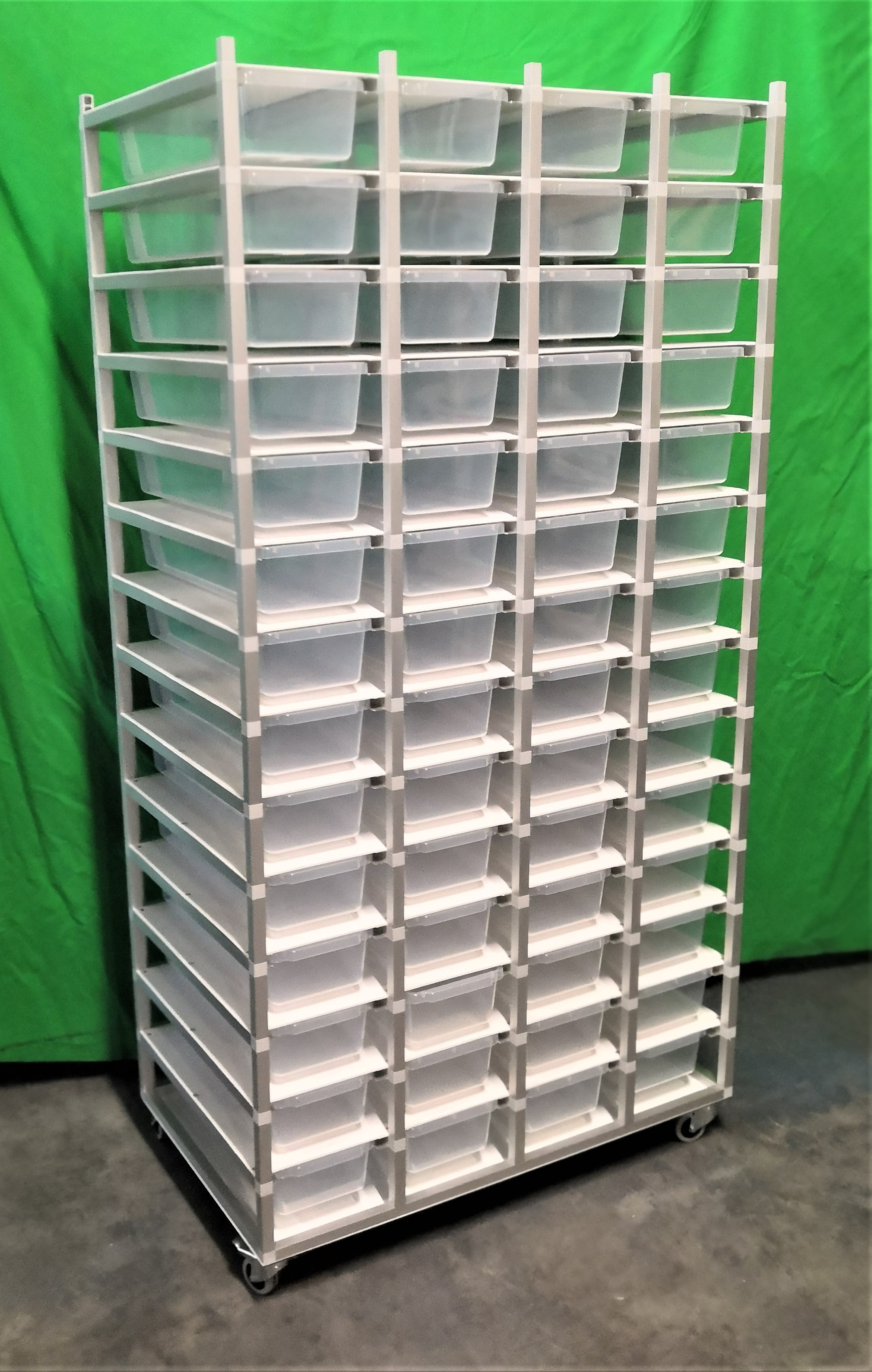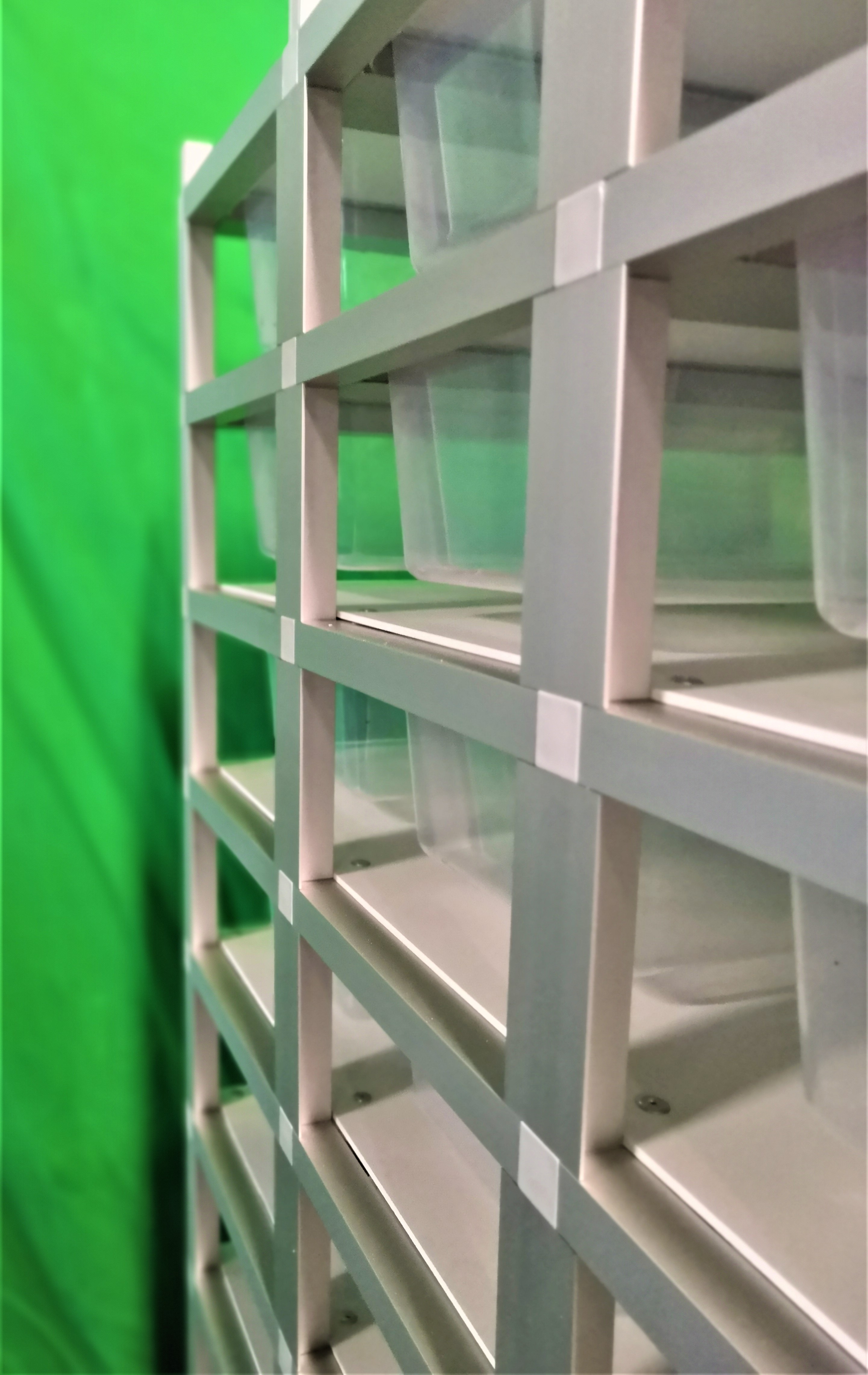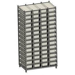 Chovatelský regálový Rack systém je často využíván ke komerčním ale i k hobby chovům. Regál je určeny pro plastové boxy o rozměru š 19, h 51, v 10 cm. Výška racku 56 beden včetně koleček je 180 cm, šířka 94 cm, hloubka 54,5cm. Kolečka s gumovou pryží a brzdou umožňují velmi jednoduchý a lehký pohyb s celým regálem. Váha regálů včetně beden 60 kg Na přání zákazníka umíme Rack vyrobit na počet boxů jak do výšky, tak do šířky podle požadavků chovatele. Rovněž lze Rack zhotovit z profilů s eloxovaným povrchem. Do každého patra lze vkládat topné fólie pod chovné boxy. Boxy jsou součástí Racku.