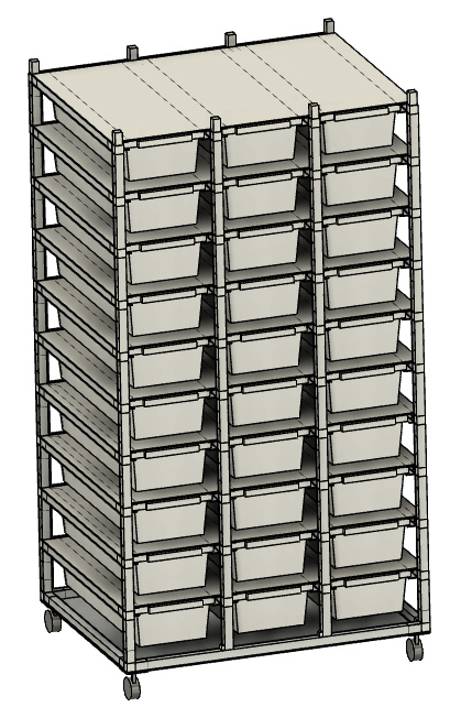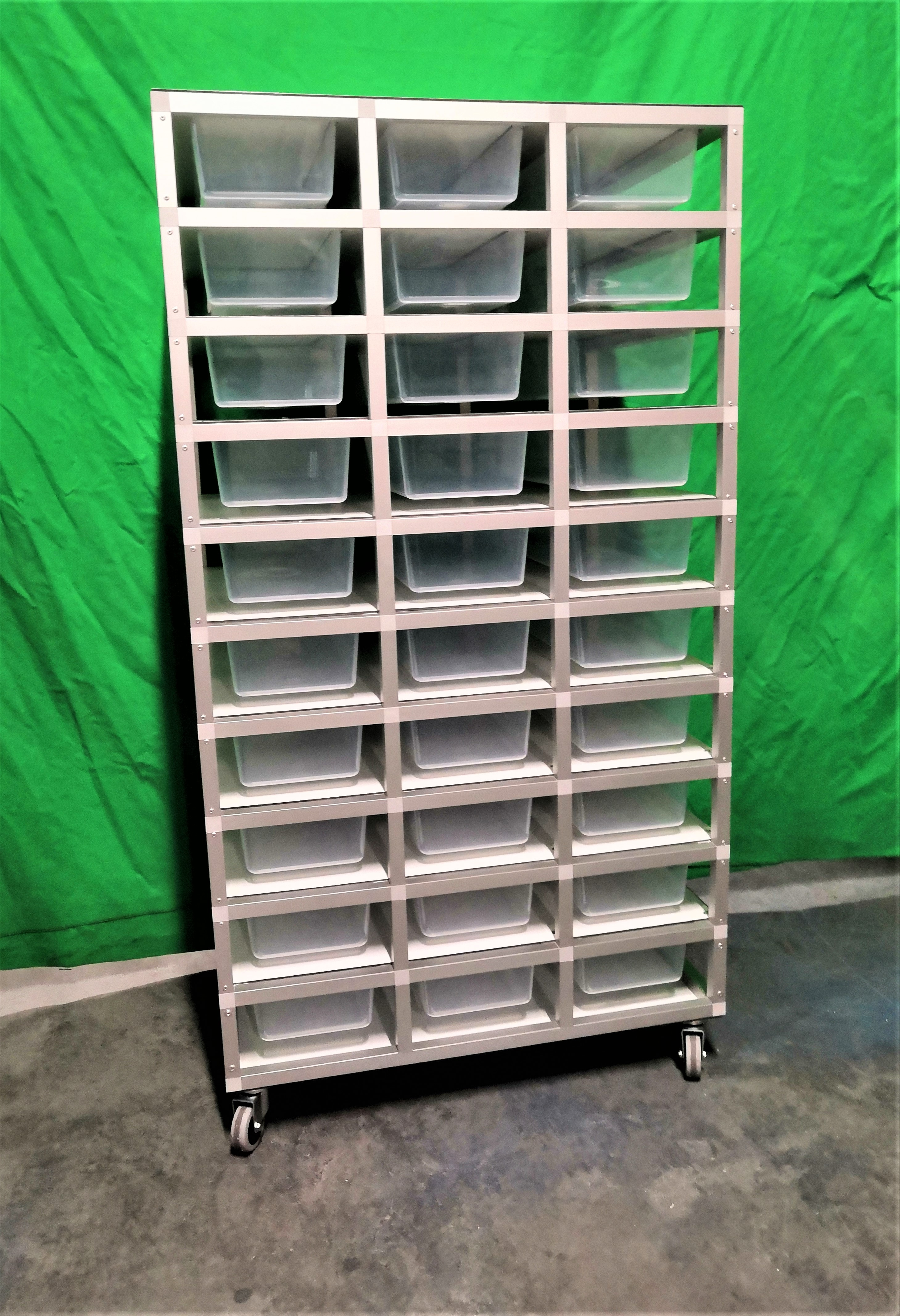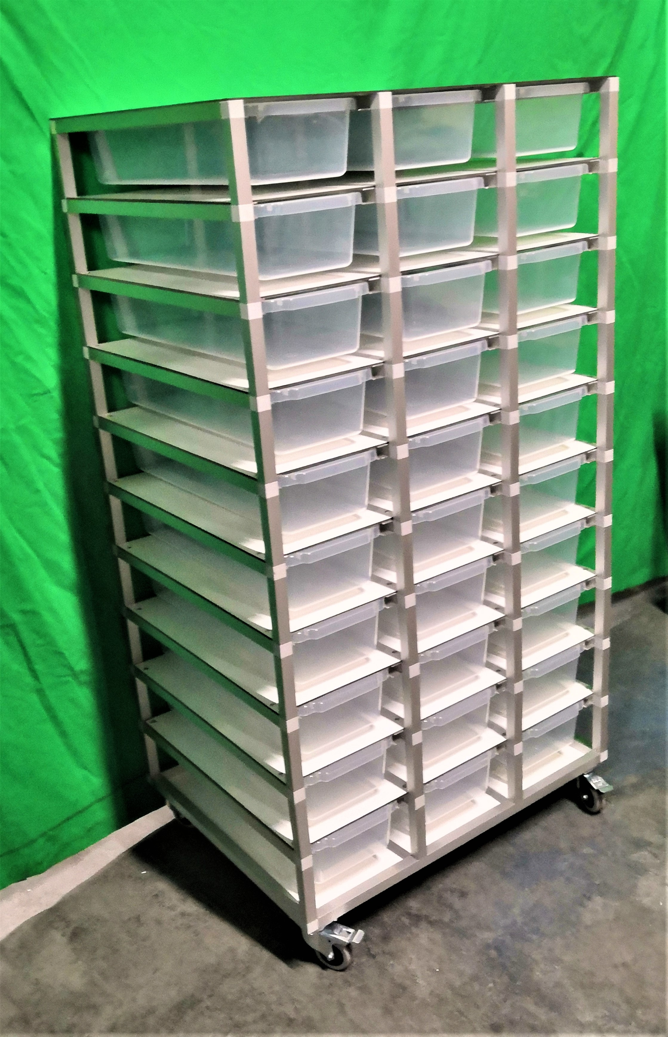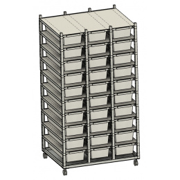 Chovatelský regálový Rack systém je často využíván ke komerčním ale i k hobby chovům. Regál je určeny pro plastové boxy o rozměru š 19, h 51, v 10 cm. Výška racku 30 beden včetně koleček je 132 cm, šířka 71 cm, hloubka 54,5cm. Kolečka s gumovou pryží a brzdou umožňují velmi jednoduchý a lehký pohyb s celým regálem. Váha regálů včetně beden 41 kg Na přání zákazníka umíme Rack vyrobit na počet boxů jak do výšky, tak do šířky podle požadavků chovatele. Rovněž lze Rack zhotovit z profilů s eloxovaným povrchem. Do každého patra lze vkládat topné fólie pod chovné boxy. Boxy jsou součástí Racku.