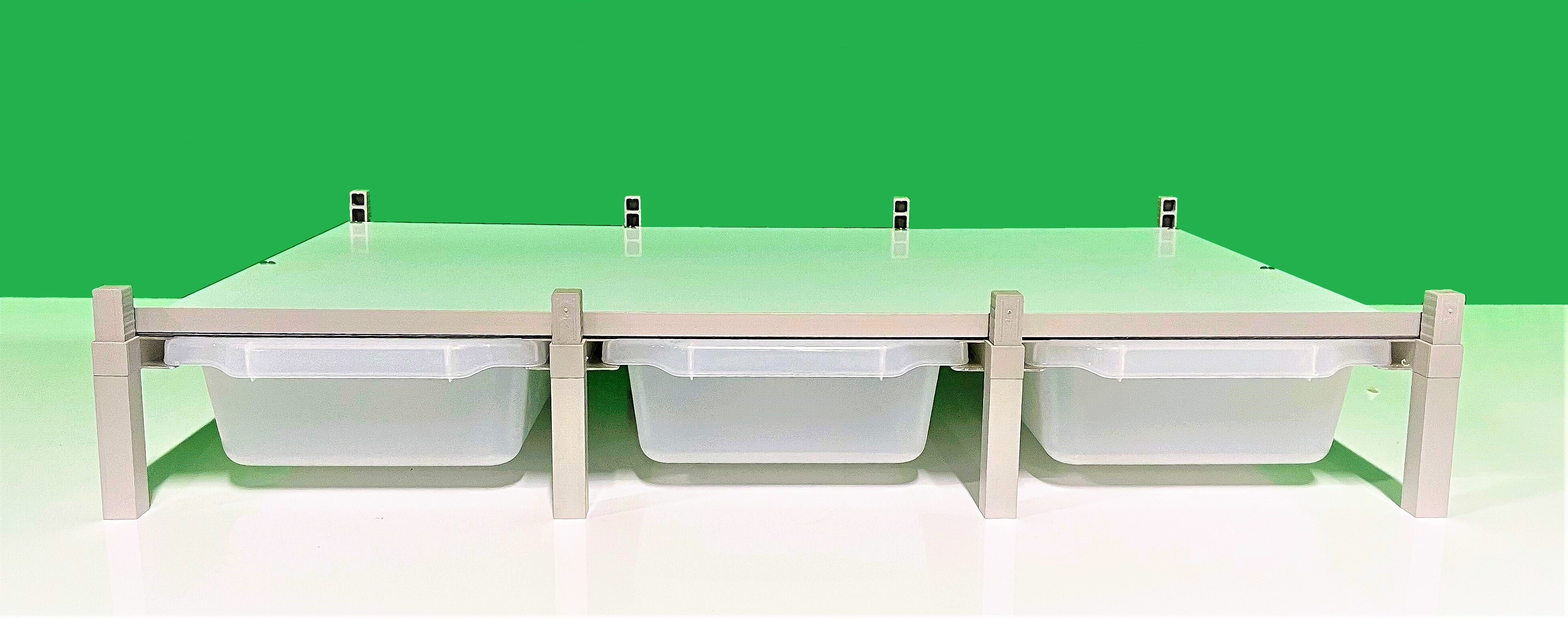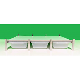 Rack je zhotoven z hliníkových profilů s eloxovanou úpravou. Do každého patra lze vkládat topné fólie pod chovné boxy. Boxy jsou součástí Racku. Při výběru boxů můžete vybírat z naší nabídky boxů v barvě šedé, mléčné. Po výběru boxů, prosím napište poznámku do objednávky, o které boxy máte zájem.