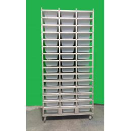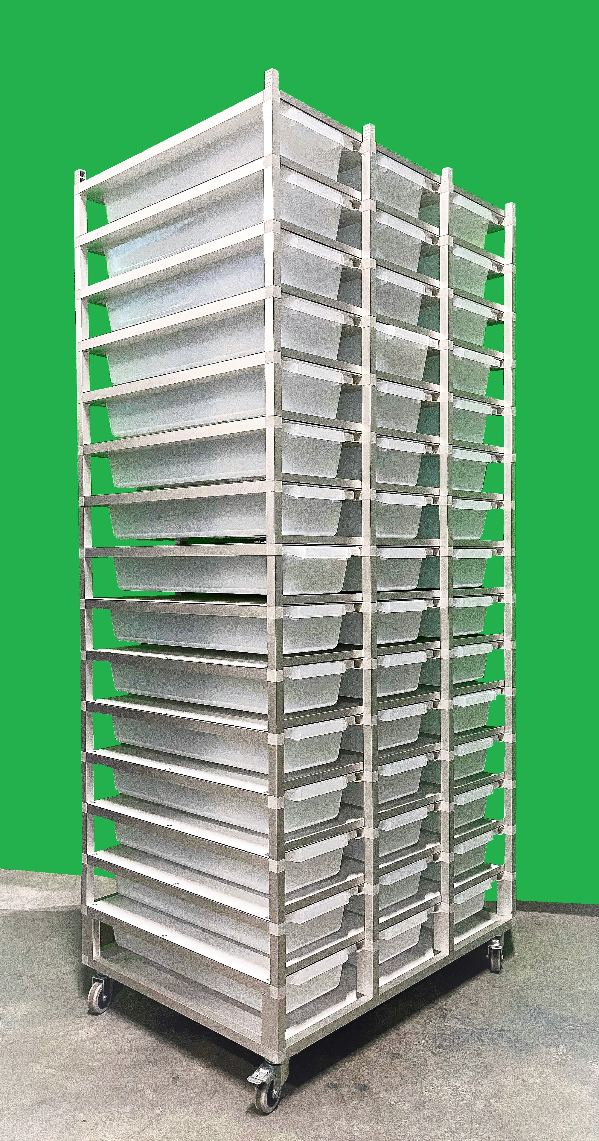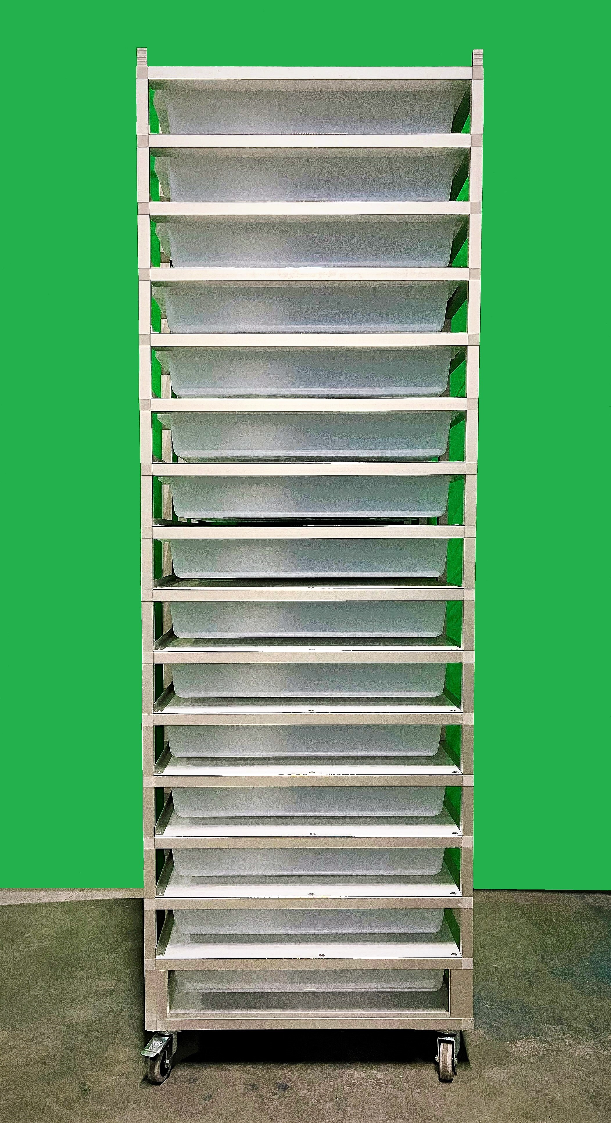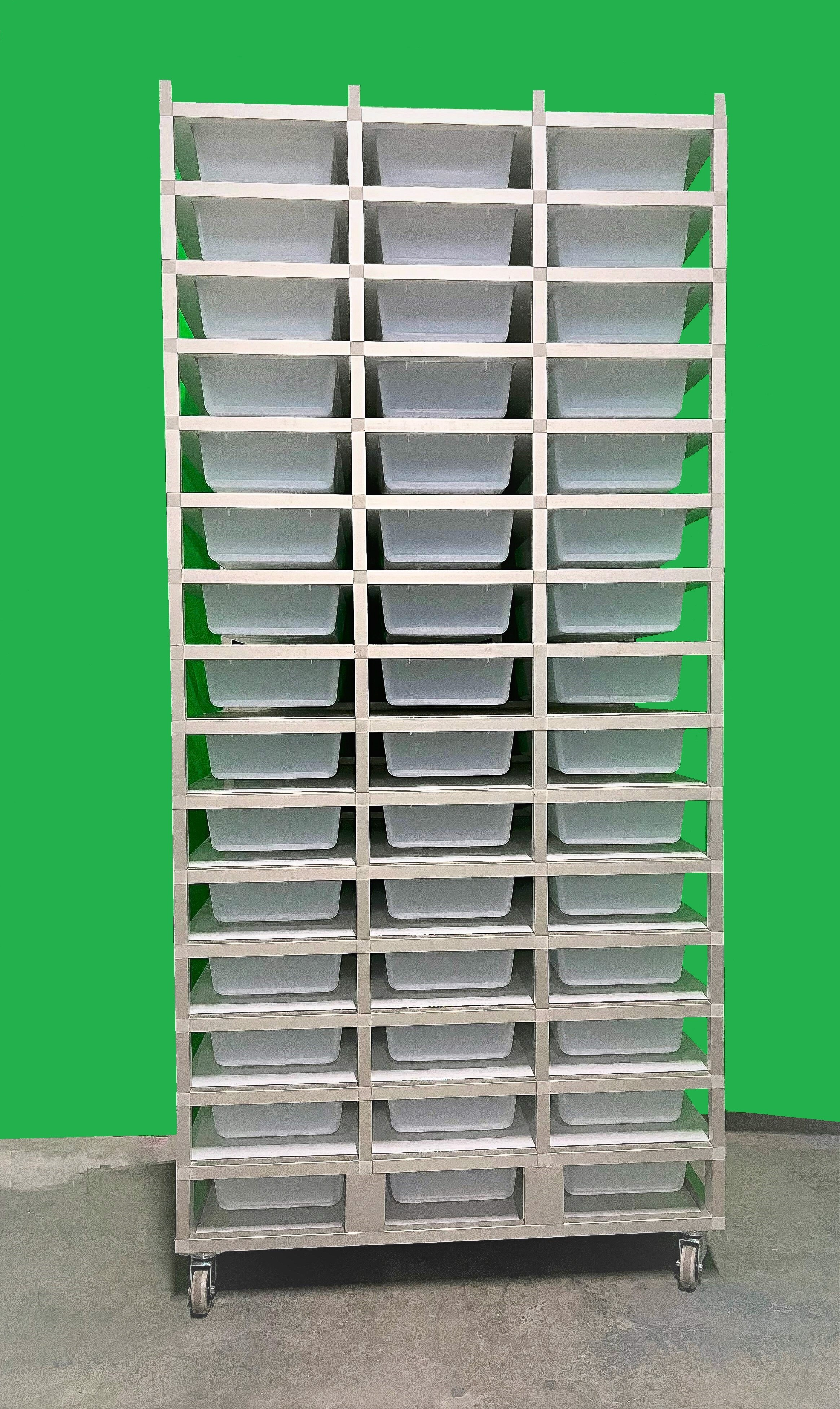 Chovatelský regálový Rack systém je často využíván ke komerčním ale i k hobby chovům. Jednotlivé bedny jsou zavěšeny v racku, jednotlivé stropy jsou z hliníkového sendviče. Jedná se o velmi odolný materiál. Do tohoto materiálů jdou odvrtat dírky různých průměrů pro odvětrání. Kolečka s gumovou pryží a brzdou umožňují velmi jednoduchý a lehký pohyb s celým regálem. Na přání zákazníka umíme Rack vyrobit jak do šíře, tak do výšky a počtu boxů, podle požadavků chovatele.