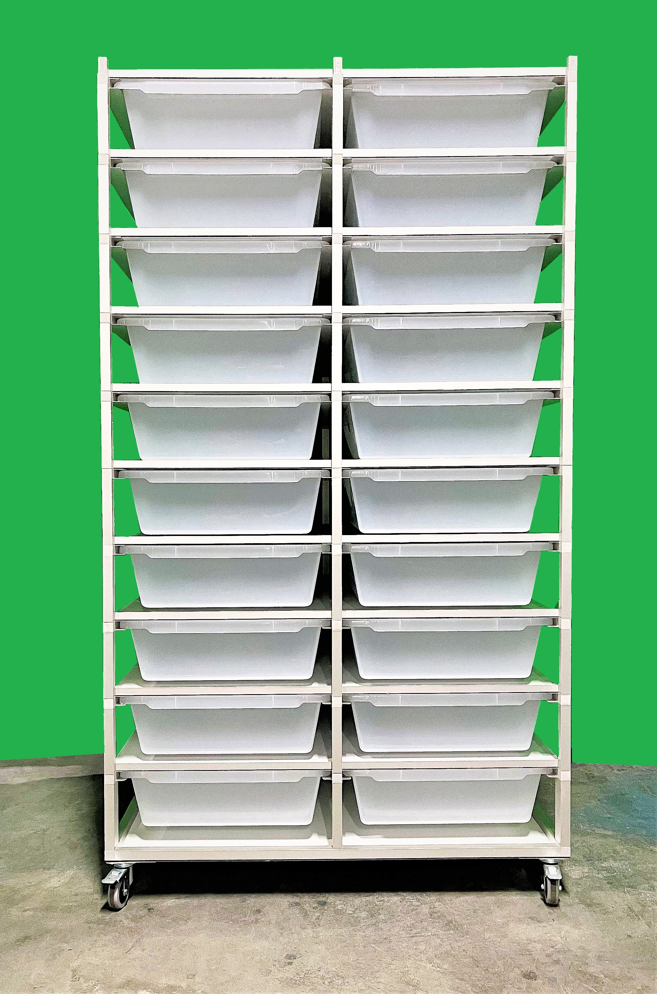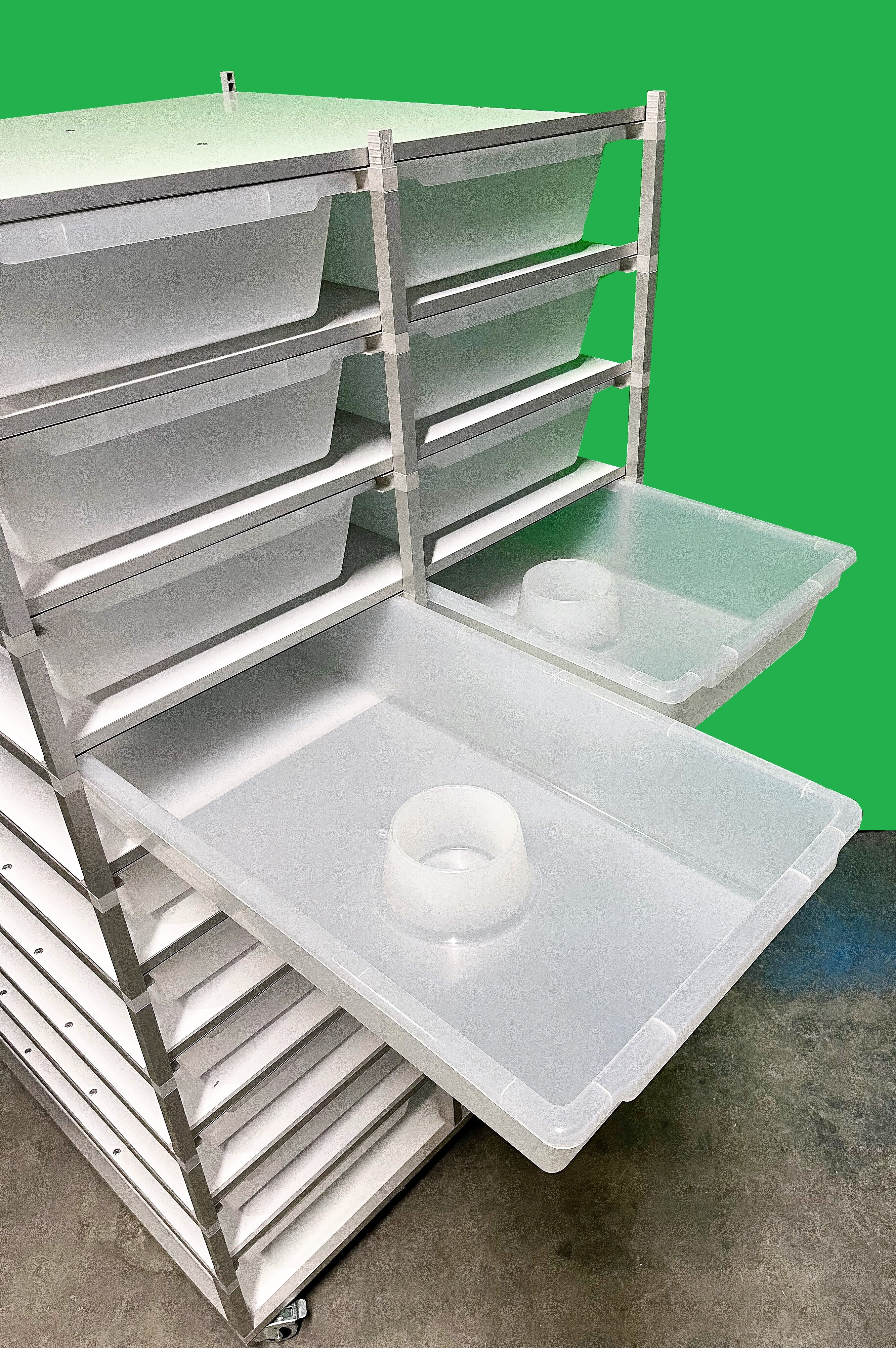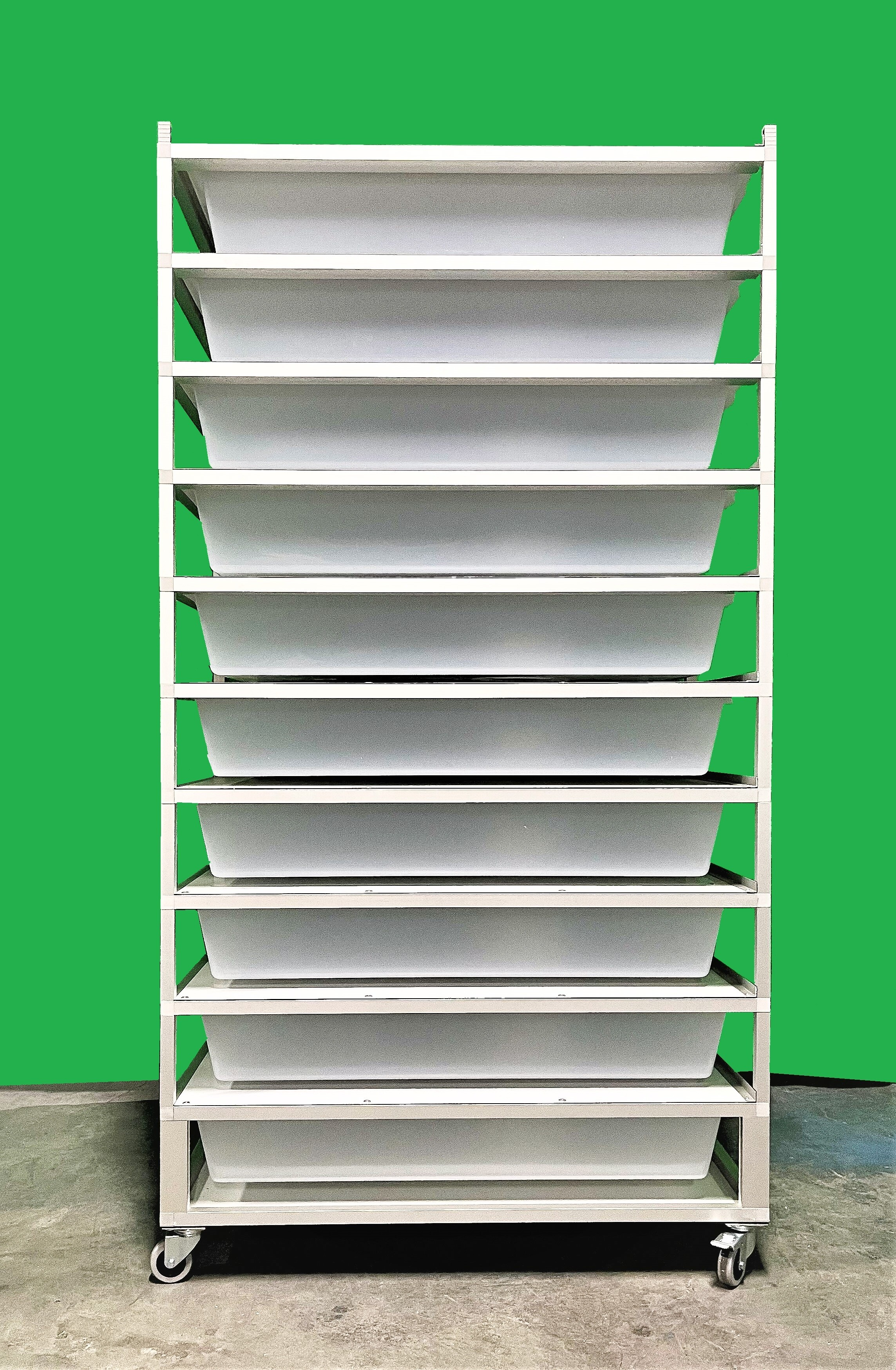 Chovatelský regálový Rack systém je často využíván ke komerčním ale i k hobby chovům. Jednotlivé bedny jsou zavěšeny v racku, jednotlivé stropy jsou z hliníkového sendviče. Jedná se o velmi odolný materiál. Do tohoto materiálů jdou odvrtat dírky různých průměrů pro odvětrání. Kolečka s gumovou pryží a brzdou umožňují velmi jednoduchý a lehký pohyb s celým regálem. Na přání zákazníka umíme Rack vyrobit jak do šíře, tak do výšky a počtu boxů, podle požadavků chovatele.