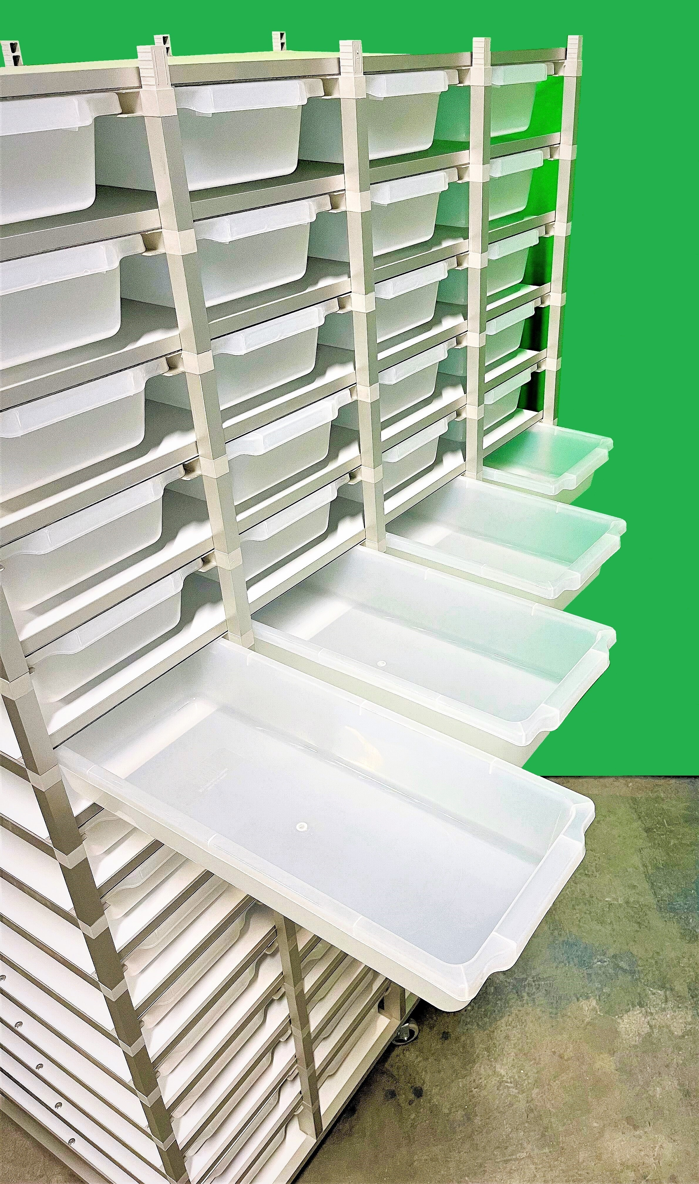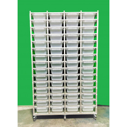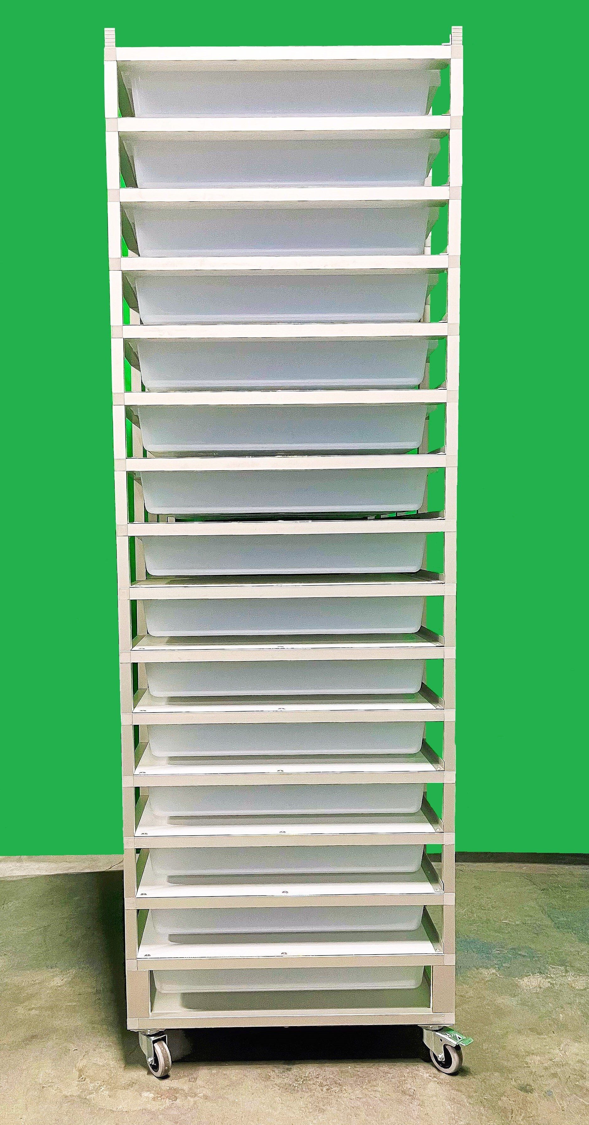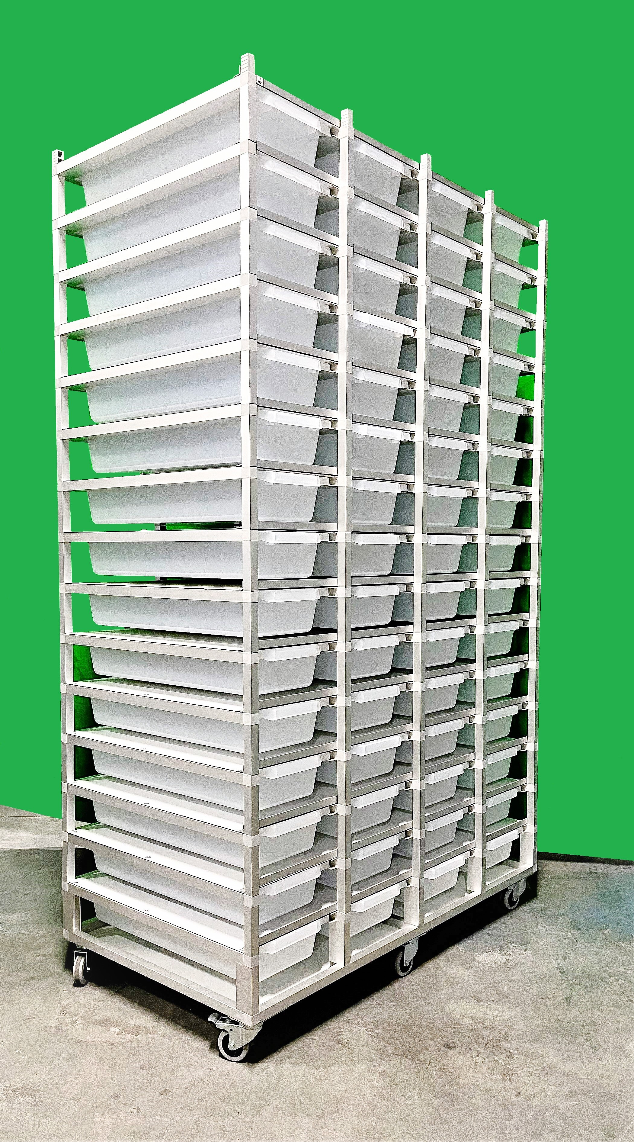 Chovatelský regálový Rack systém je často využíván ke komerčním ale i k hobby chovům. Jednotlivé bedny jsou zavěšeny v racku, jednotlivé stropy jsou z hliníkového sendviče. Jedná se o velmi odolný materiál. Do tohoto materiálů jdou odvrtat dírky různých průměrů pro odvětrání. Kolečka s gumovou pryží a brzdou umožňují velmi jednoduchý a lehký pohyb s celým regálem. Na přání zákazníka umíme Rack vyrobit jak do šíře, tak do výšky a počtu boxů, podle požadavků chovatele.