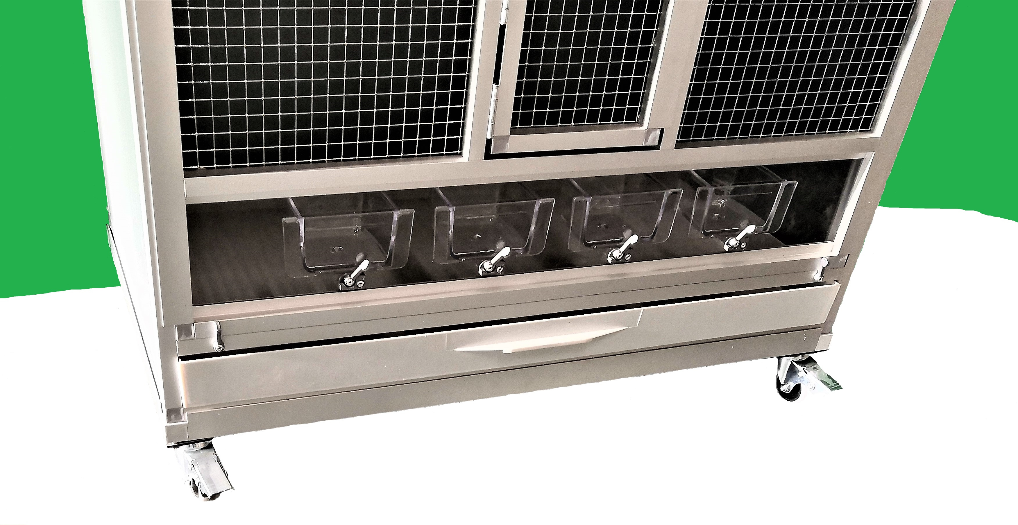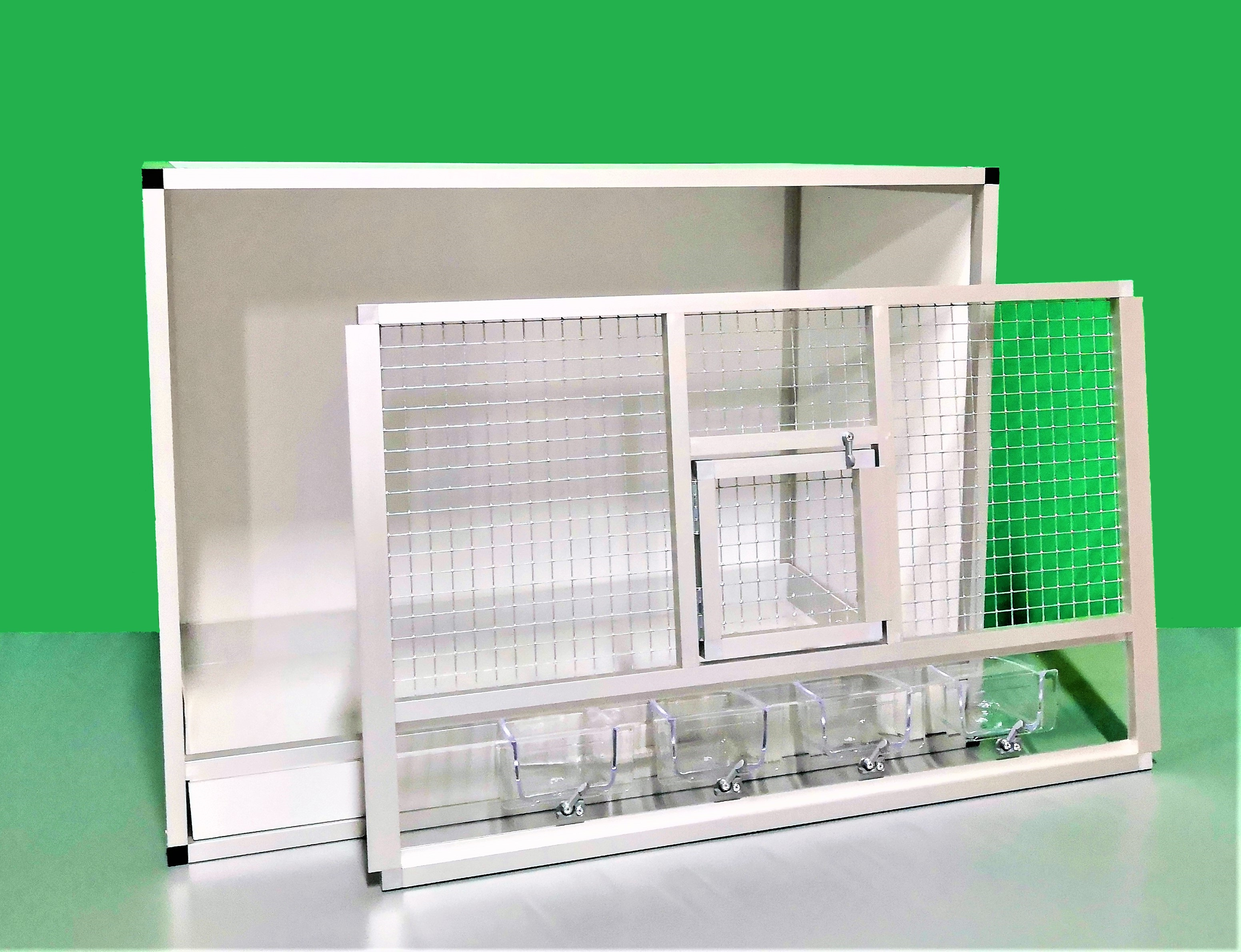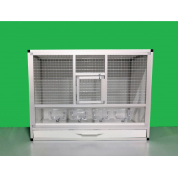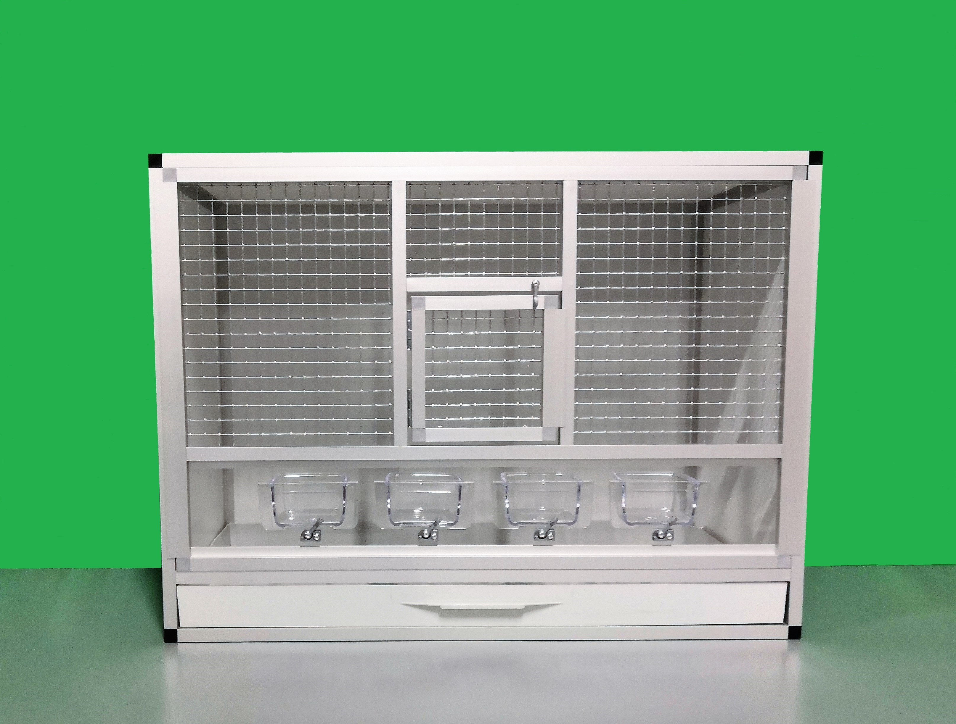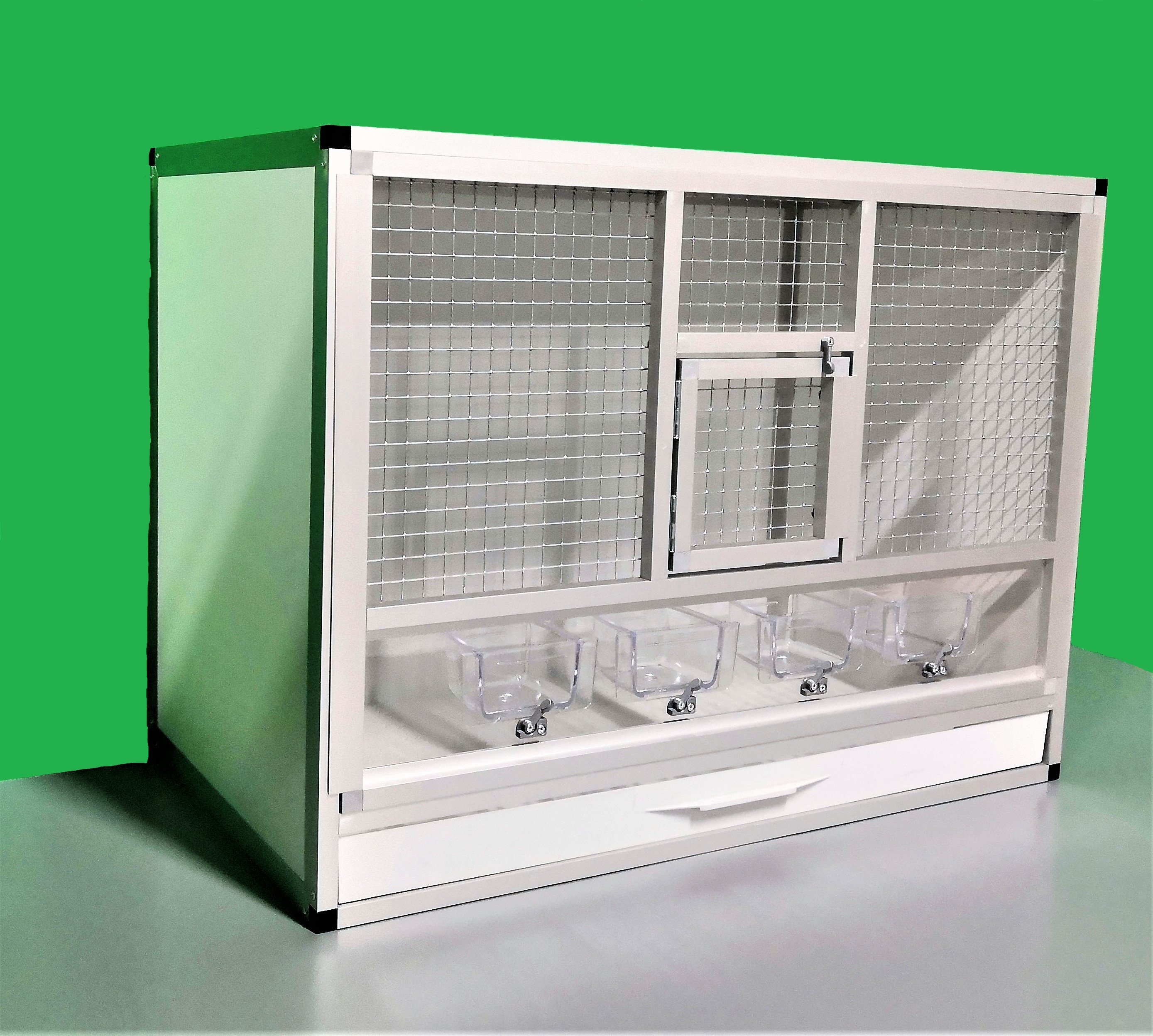 Hliníková konštrukcia s povrchovou úpravou strieborný elox. Desaťmilimetrová výplň môže byť v farbe bielej, šedej a čiernej. Ak zákazník požaduje strop potiahnuť pletivom, je to možné. Predná stena sa dá celá vybrať. Je to z dôvodov ľahkého čistenia, dezinfikovania klietky.Předné kŕmidlá je možné ako náhradné dokúpiť v našom e-shope s označením M007 https://www.aluhobby.sk/kŕmidlo-šuflík/Pletivo použité pre túto klietku má rozmer oka 16x16 a hrúbka drôtu je 1,2mm.