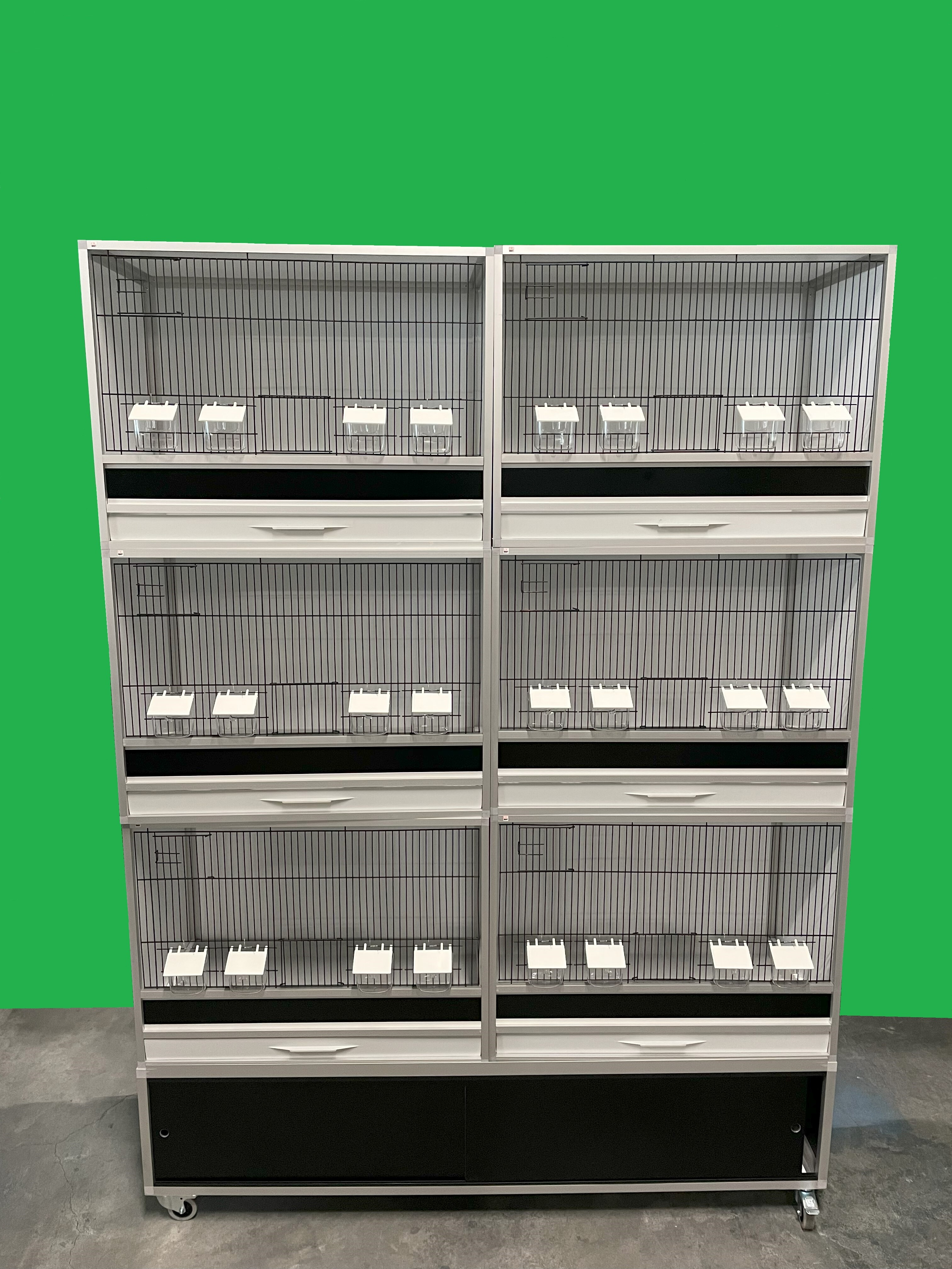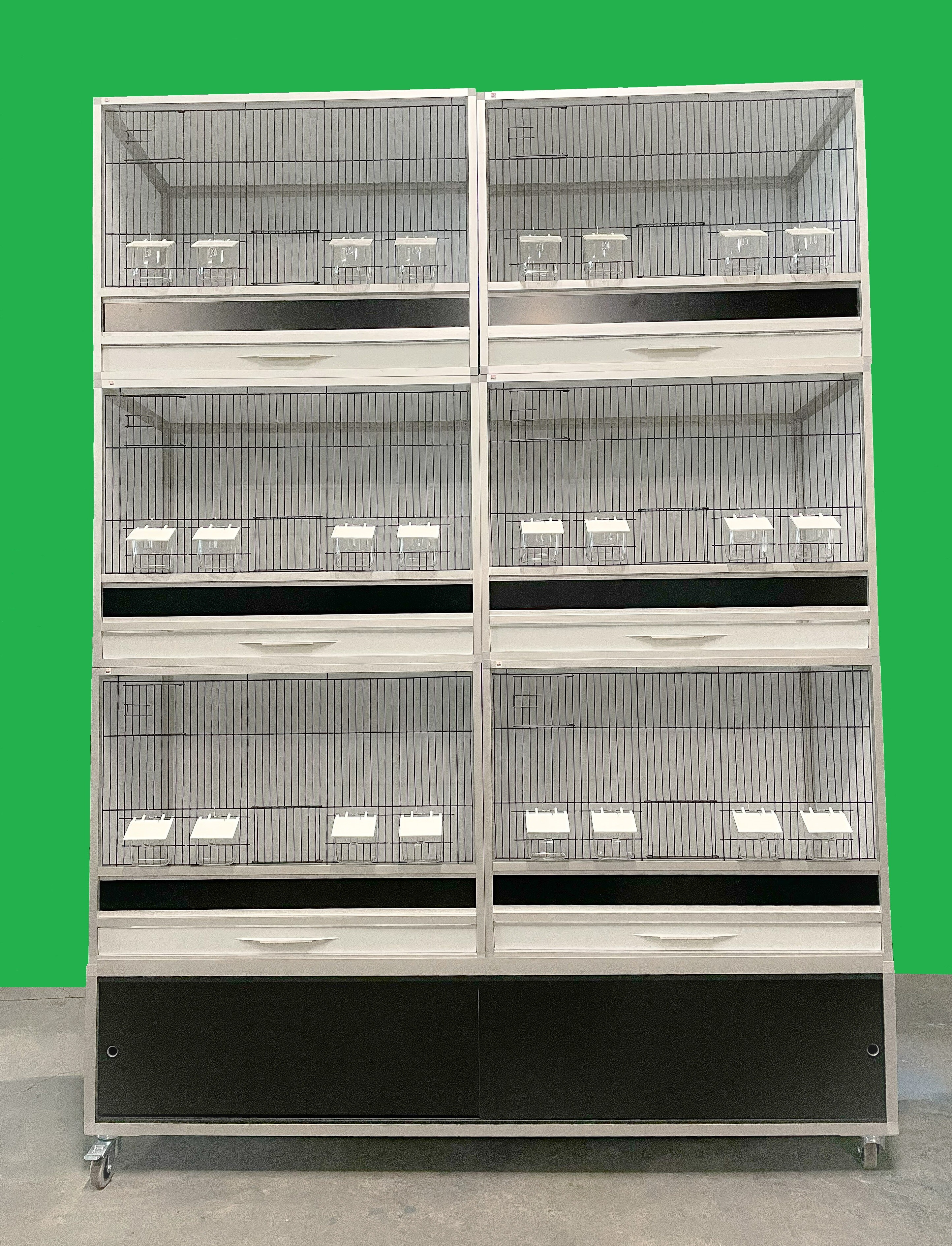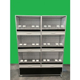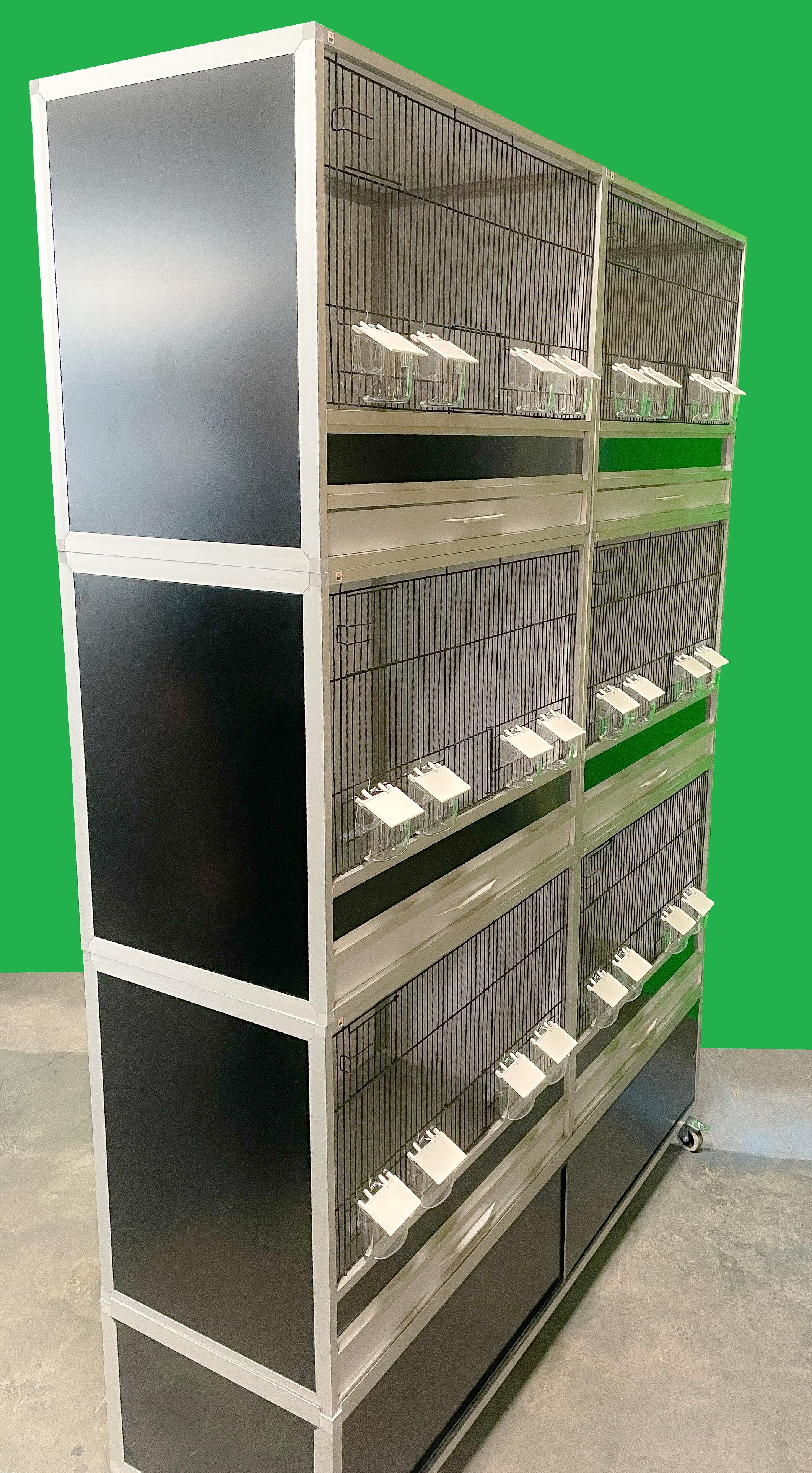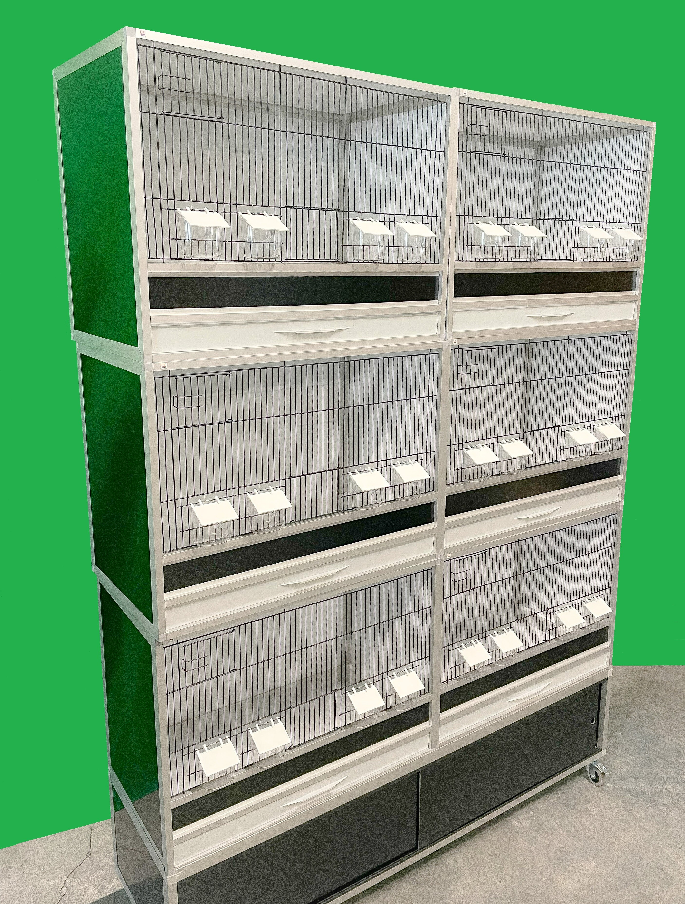 Každá klietka je samostatná a je položená buď priamo na podvozku alebo na druhej klietke, kde stabilitu klietok udržuje ďalší profil. Výplne stien sú z hliníkového sendviča, ktorý je zasadený do rámu klietky. Hliníkový sendvič je veľmi odolný, pevný materiál, do ktorého možno vŕtať a rezať.Bedňovú klietku si môžete zvoliť v bielej, striebornej, zelenej, antracitovej, žltej alebo tak ako je vidieť na obrázku v čiernej farbe, kde vnútorná strana klietky je v bielej farbe. Rozmer jednotlivé klietky je v 54 x š 73 x h 41cm. Celá zostava má potom rozmery v 205,5 x š 145,5 x h 41cm. Tieto debnové klietky sú veľmi odolné. Dajú sa nielen umývať horúcou vodou, ale dajú sa použiť aj rôzne dezinfekcie. Tieto klietky Vám zaručujú nielen zdravý chov, ale zároveň budú slúžiť generáciám.