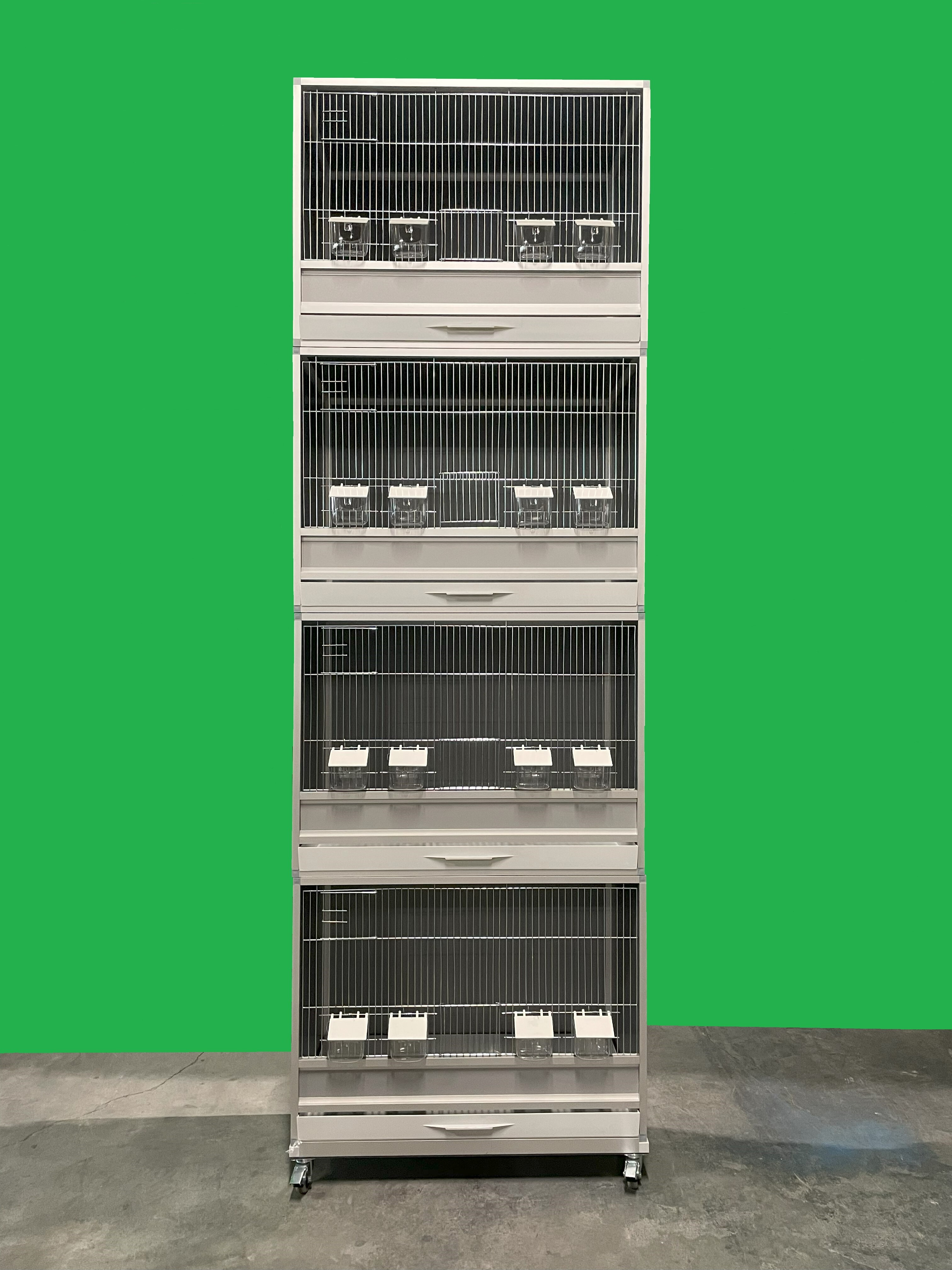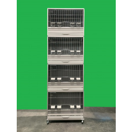Súprava štyroch debnových klietok plus podvozok. Každá klietka je samostatná a je položená buď priamo na podvozku alebo na druhej klietke, kde stabilitu klietky udržiava ďalší profil. Výplne stien sú z dutého 10 mm materiálu, ktorý je zasadený do rámu klietky. Tento materiál je veľmi ľahký. Vďaka tomu je manipulácia s klietkou hračkou. Bedňovú klietku si môžete zvoliť v bielej, sivej a čiernej farbe. Rozmer jednotlivé klietky je v 54 x š 12,5 x h 40,5cm.Celá zostava má potom rozmery v 230 x š 72,5 x h 40,5cm. Tieto debnové klietky sú veľmi odolné. Dajú sa nielen umývať vodou, ale dajú sa použiť aj rôzne dezinfekcie. Tieto klietky Vám zaručujú nielen zdravý chov, ale zároveň budú slúžiť generáciám.