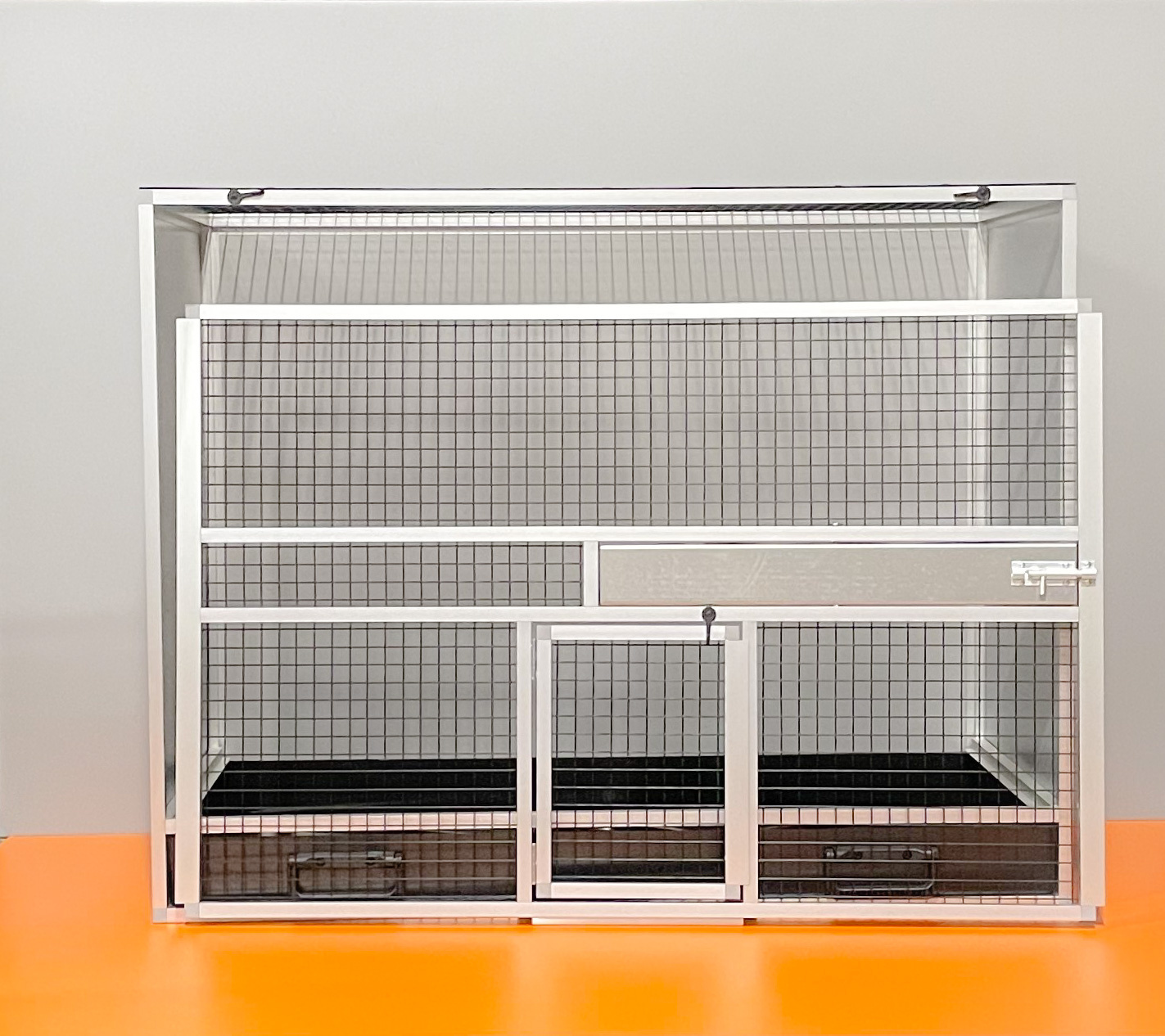 Zaujímavosťou u tejto klietky je čierne pletivo, jedná sa o lakované pletivo značky Esafort oko 19x19 drôt 1,45mm, čierny mat. Nejedná sa o poplastované pletivo!! Z tohto dôvodu nedokážu zvieratá lak narušiť. Pohľad na zvieratá cez tento typ pletiva je veľmi príjemný a nerušený strieborným odleskom. Bedňová klietka o rozmere šírka 99 cm, hĺbka 50 cm a výška 78,5 cm má hliníkovú konštrukciu tvorenú z profilu 15x15mm. Hliníková konštrukcia s povrchovou úpravou strieborný elox. Výplne klietky sú z hliníkového sendviča (hliník-plast-hliník). Jedná sa o veľmi pevný a kvalitný materiál. Môže byť v farbe bielej, šedej, tmavozelenej a antracitovej. Na želanie aj v čiernej farbe. Strop je potiahnutý pletivom, na želanie je možné urobiť plný strop. V prednej stene je umiestnený otočný kŕmny pult u nás označený ako KMP03. Jedná sa o kŕmny pult s tromi miskami s obsahom 0,35l. Súčasťou klietky nie je napájačka. Doplnky je možné doobjednať https://www.aluhobby.sk/ptactvo/doplnky-pre-bednove-klietky/. Veľkou prednosťou tejto debnovej klietky je predovšetkým nízka váha 14 kg a vysoká pevnosť. Vďaka nízkej váhe, použitým materiálom sa veľmi ľahko udržiava v chove hygiena.