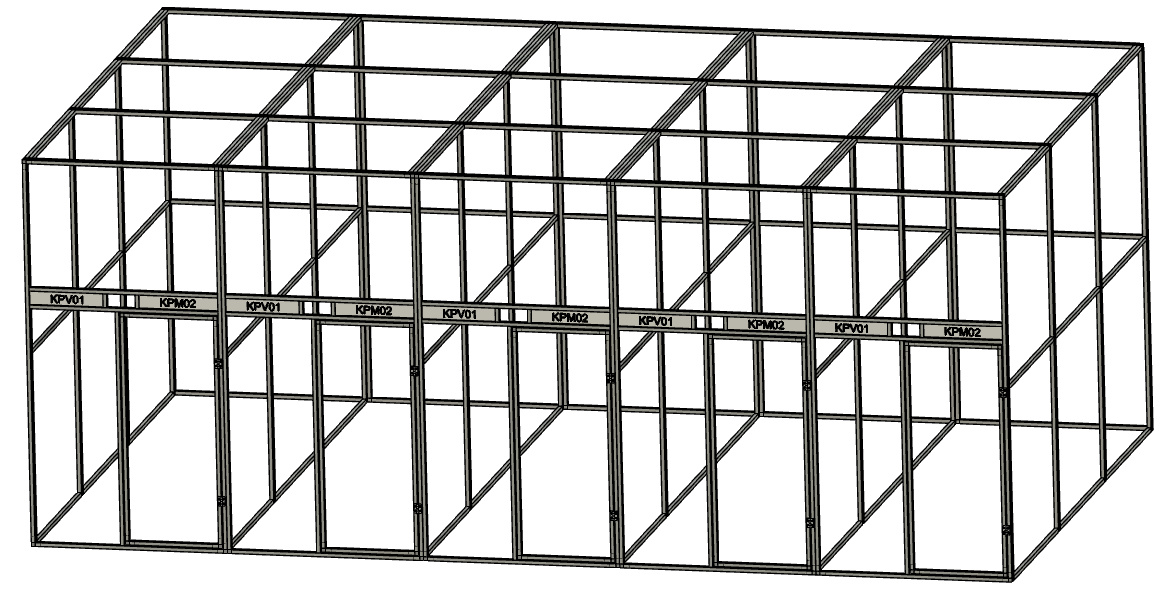 Rozmery voliéry šírka 500 cm, hĺbka 303 cm, výška 200 cm. Jedná sa o voliéru s piatimi chovnými boxami. Každý box je vybavený dvoma otočnými kŕmnymi pultmi. Prvý kŕmny pult je s jednou miskou o obsahu 0,75l a je určený pre vodu. Druhý kŕmny pult má dve misky s obsahom 2 x 0,35l určené pre krmivo. Použitie dvoch kŕmnych pultov v každom boxe čiastočne zabráni znečisťovaniu vody krmivom. Krmné pulty sú z 2 mm hliníkového plechu čo činí pult pevným a takmer bezúdržbovým. Voliéra v ponuke je potiahnutá značkovým pletivom Esafort oko 19x19mm drôt 1,45mm. Pletivo je vždy k rámom uchytené značkovými nitmi Bralo. Na žiadosť zákazníka môžeme pletivo zameniť za iné z našej ponuky. Rovnako použitie profilov s povrchovou úpravou eloxovaním je na vyžiadanie a je s príplatkom 10% z celkovej ceny. Ak bude zostava umiestnená a uchytená na stenu budovy, nie je potrebné zadných panelov. Tieto panely budú z celkovej ceny odpočítané. V cene nie je započítaná doprava a prípadná montáž na mieste.