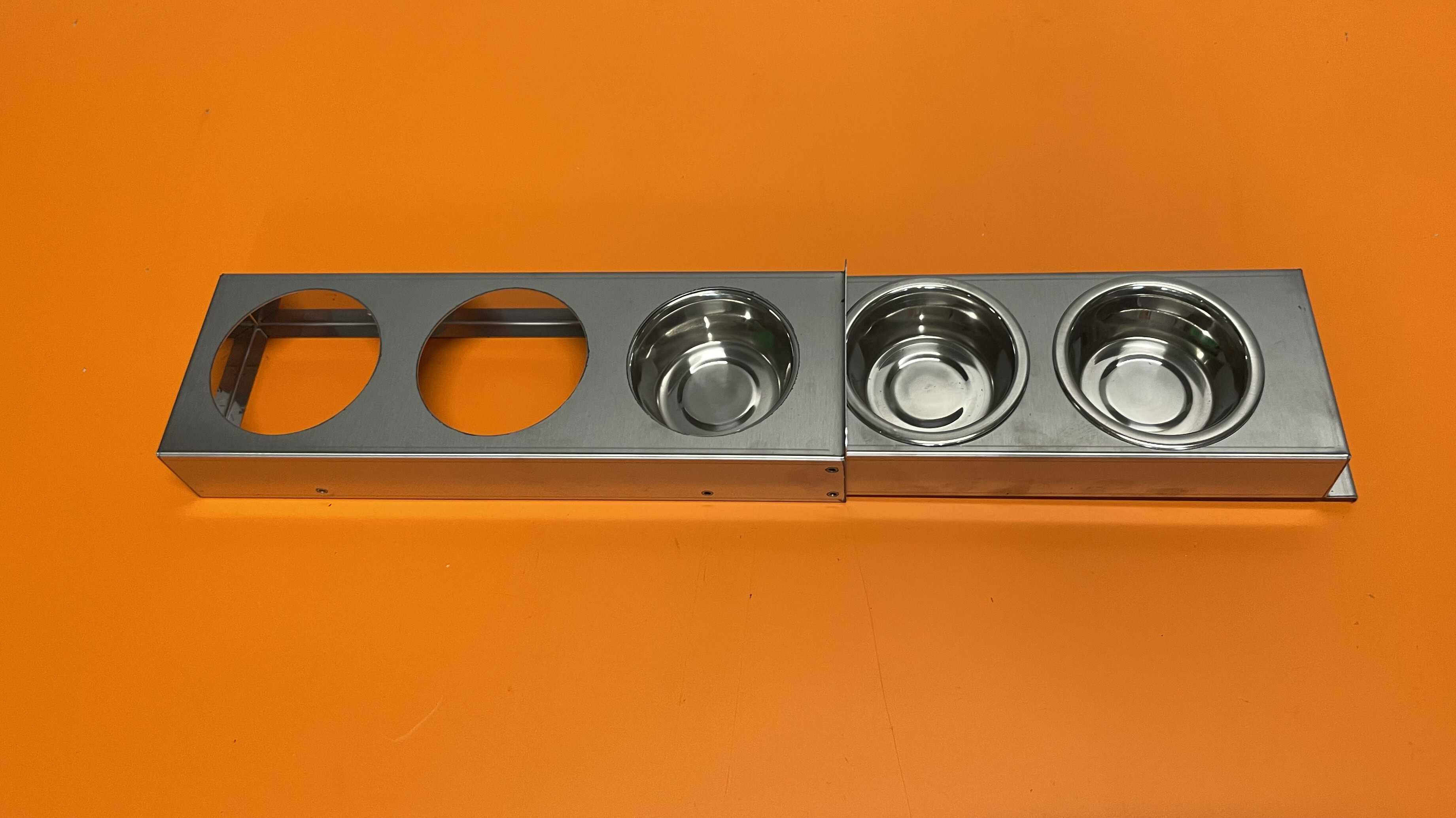 V porovnaní s inými zásuvkovými pultami zaberá kŕmny pult v prednej časti klietky veľmi málo miesta. Misky sú zabezpečené tak, aby ich žiadne zviera nemohlo vybrať. Pripevnenie k rámu klietky sa ideálne vykonáva pomocou nitu. Súčasťou kŕmneho pultu sú aj dva L profily na pripevnenie k rámu, ak sa rozhodnete umiestniť pult do stredu klietky. Na pulte sú dva otvory na pripevnenie profilu. Ak sa však chystáte umiestniť pult smerom k okraju klietky, postačí jeden z týchto profilov. Na pripevnenie pultu k pletivu alebo k celej stene klietky môžete použiť dva nity.