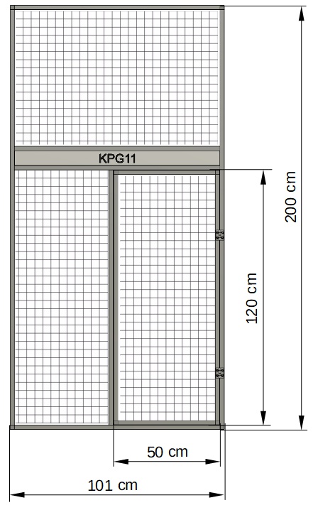 Predná stena voliéry s výsuvným nerezovým kŕmnym pultom. Krmný pult KPG11 je vybavený tromi gastro nádobami. Fotografie a popis kŕmneho pultu nájdete v oddelení kŕmnych pultov pod označením KPG11. Dvierka majú na výšku 120cm, na šírku 50cm. Hliníkový rám je potiahnutý pletivom Esafort 19x19x1,45mm. Na želanie zákazníka je možné použiť aj iné pletivá z našej ponuky.
