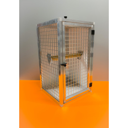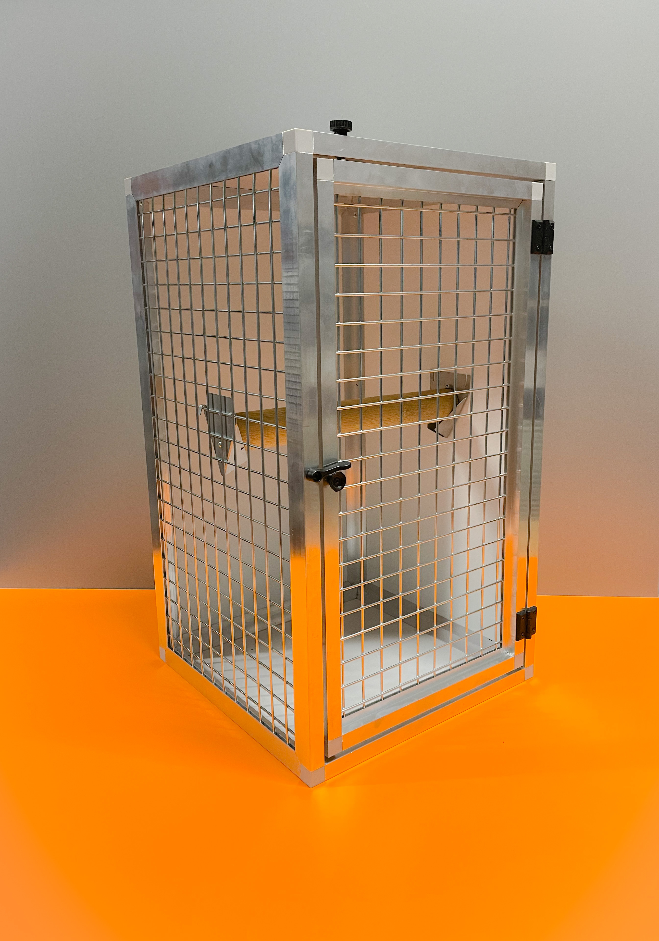 Táto veľká klietka slúži na prevoz veľkého krotkého papagája. Tvar tejto prenosky vznikol podľa požiadaviek našich klientov. Prepravka je vhodná iba pre krotkého papagája, pretože veľkosť dvierok je na to určená. Použitý materiál je prírodný hliník, hliníková sendvičová doska a sito s ležatými okami. Prenoska sa veľmi dobre upevňuje na sedadlo vozidla pomocou bezpečnostných pásov. Na požiadanie môžeme vyrobiť aj prenosku iných rozmerov.