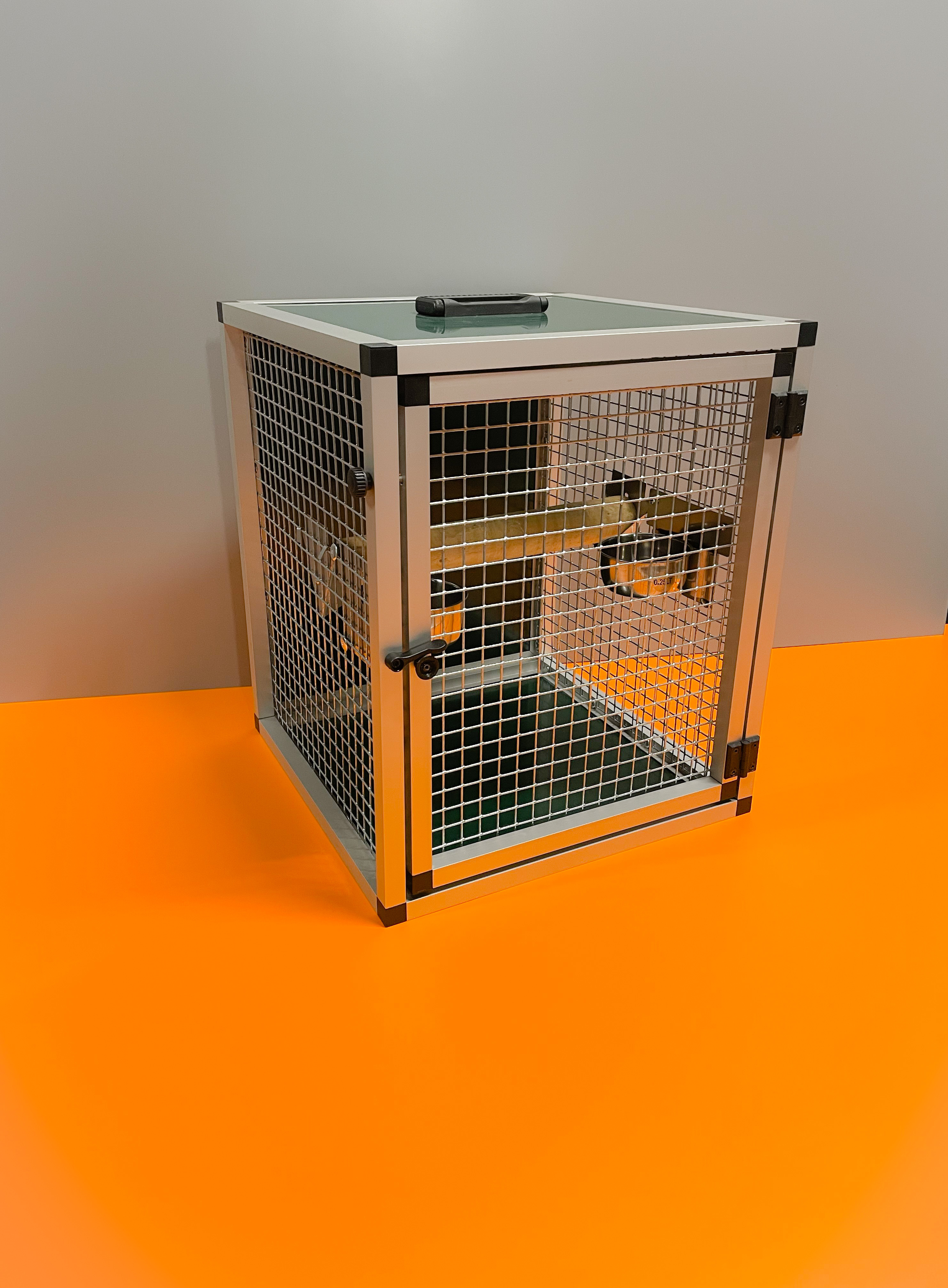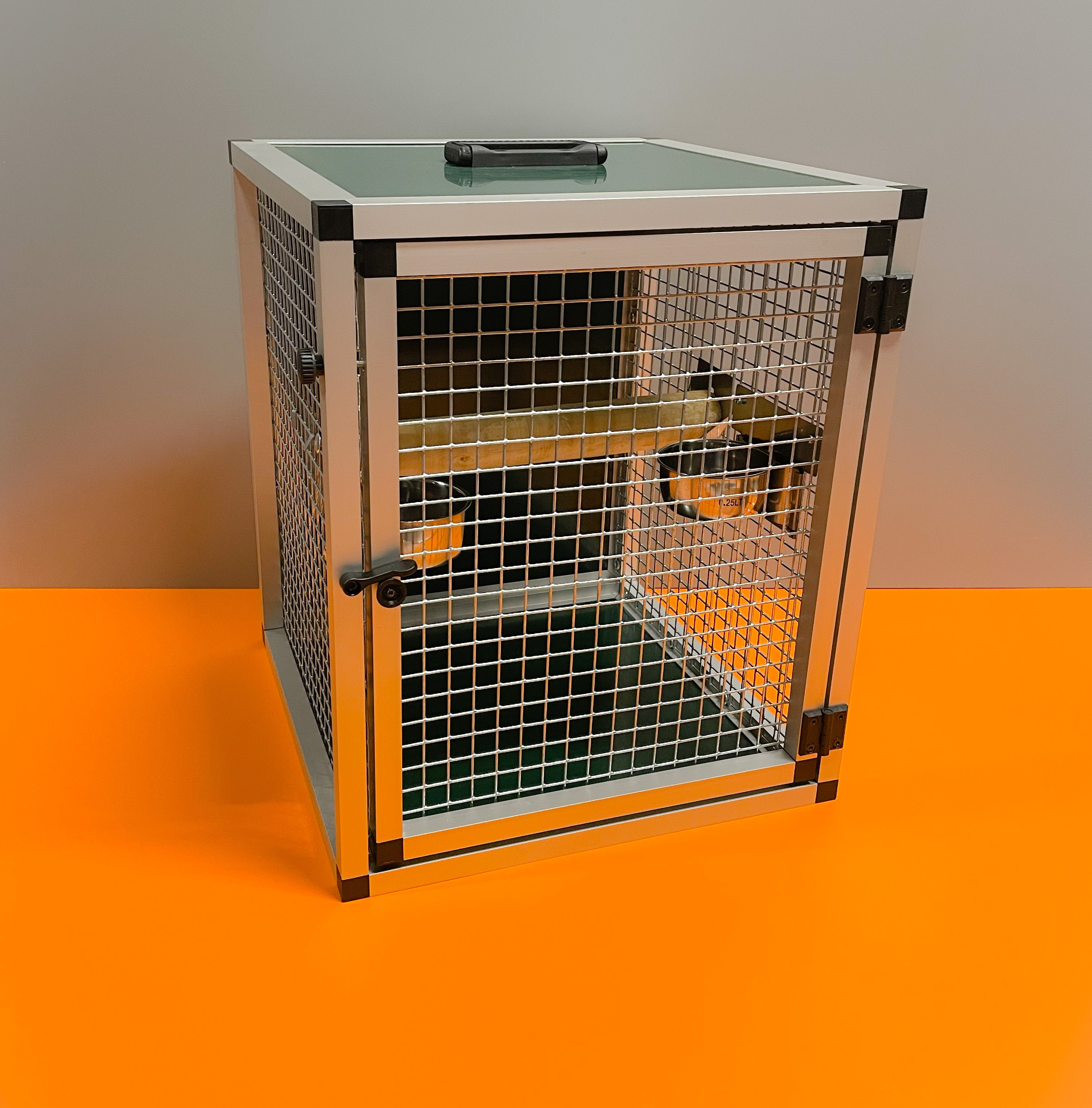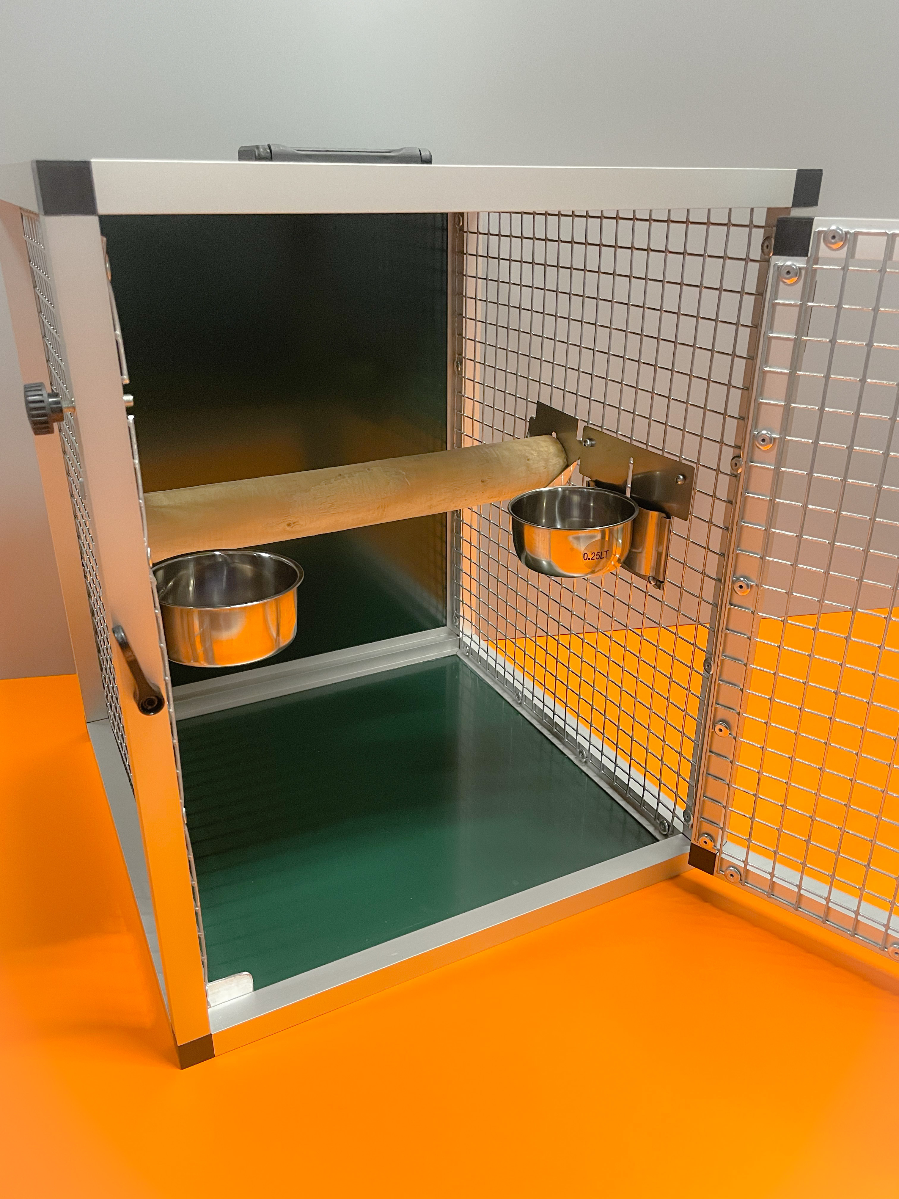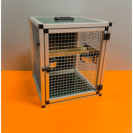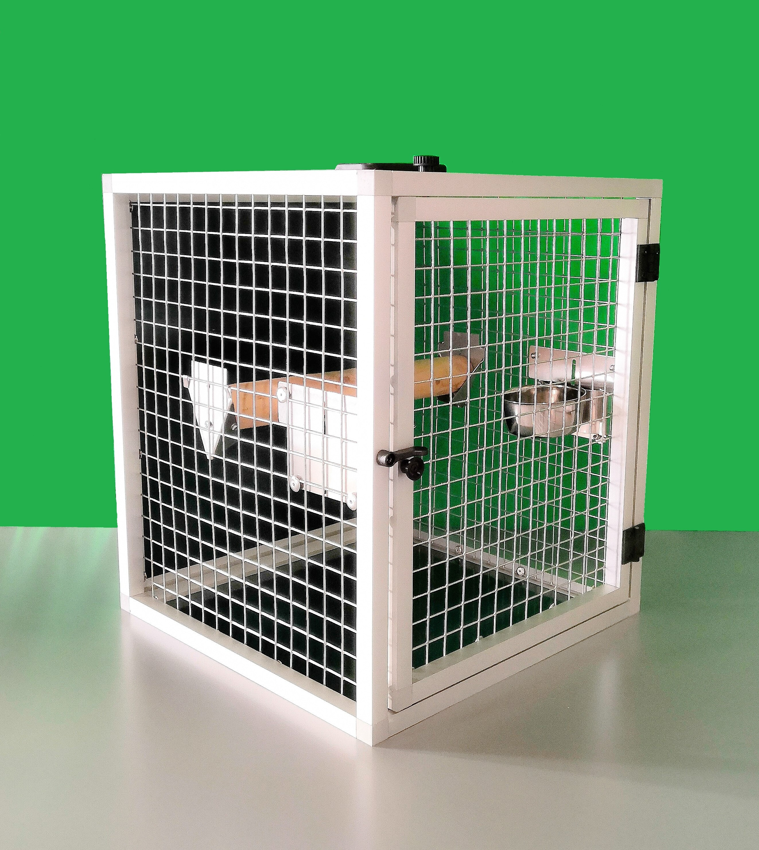 Prepravná klietka s kŕmidlami je vyrobená z profilu 20x20x1,5 mm s povrchovou úpravou eloxovaním.