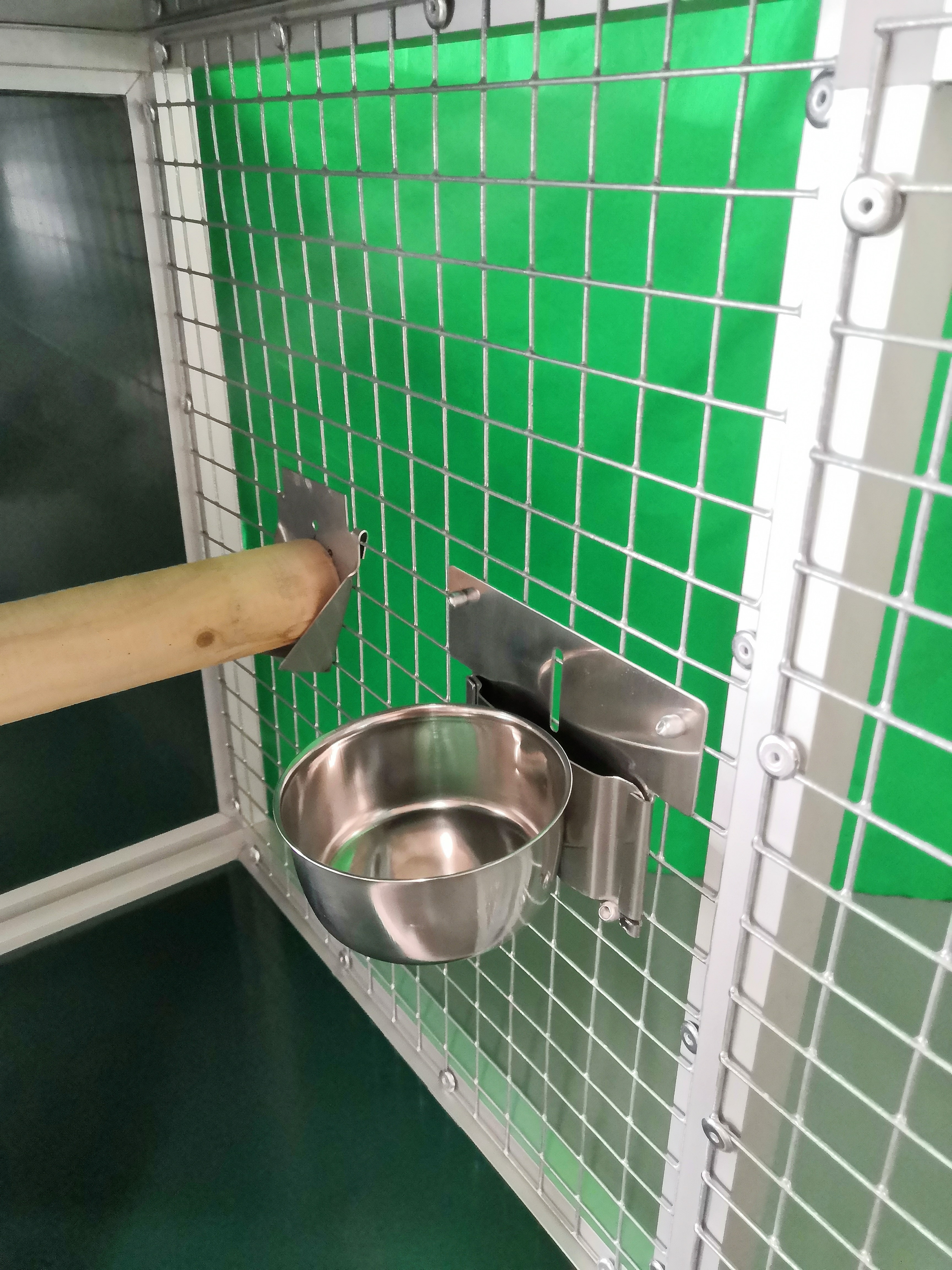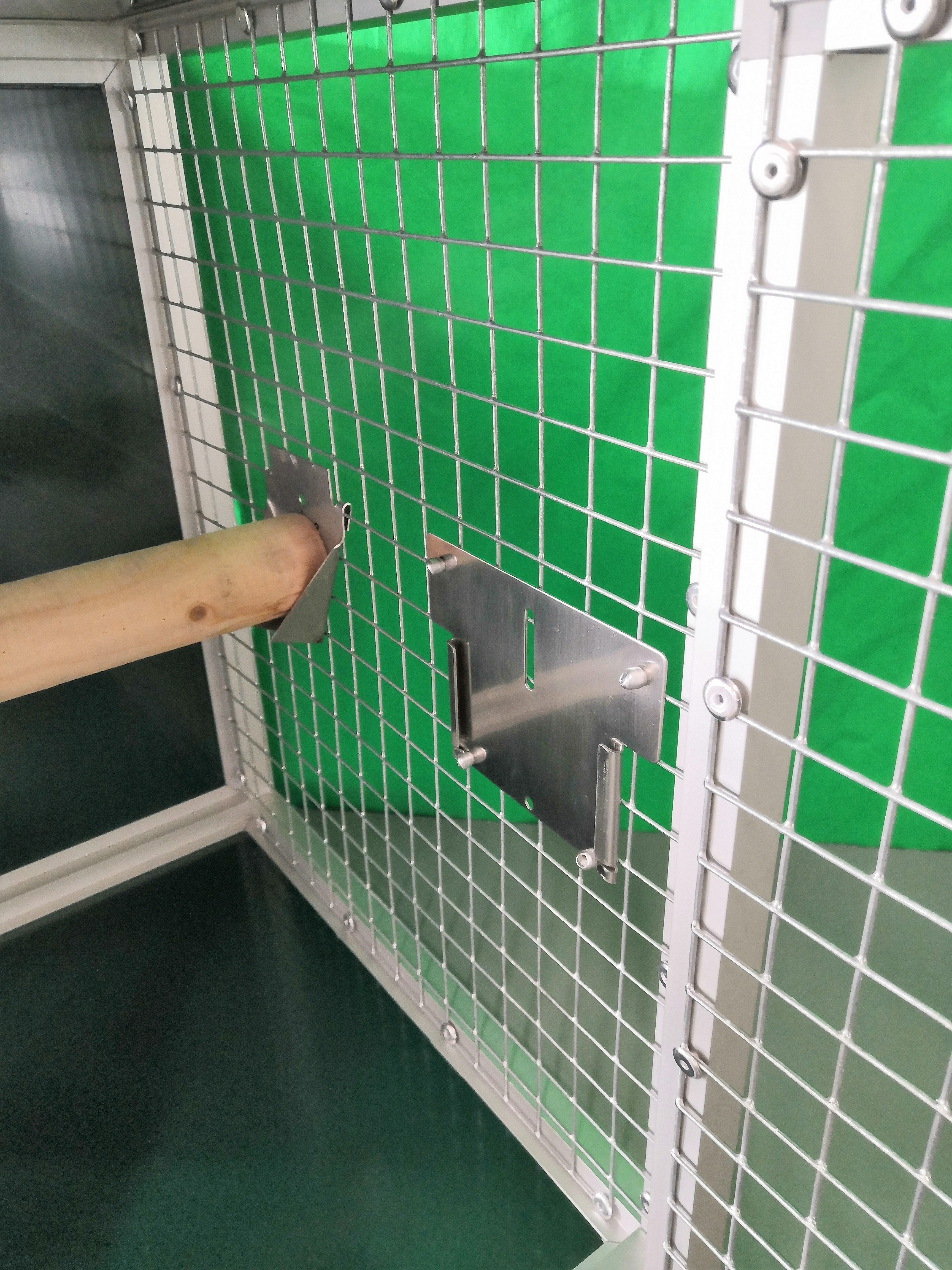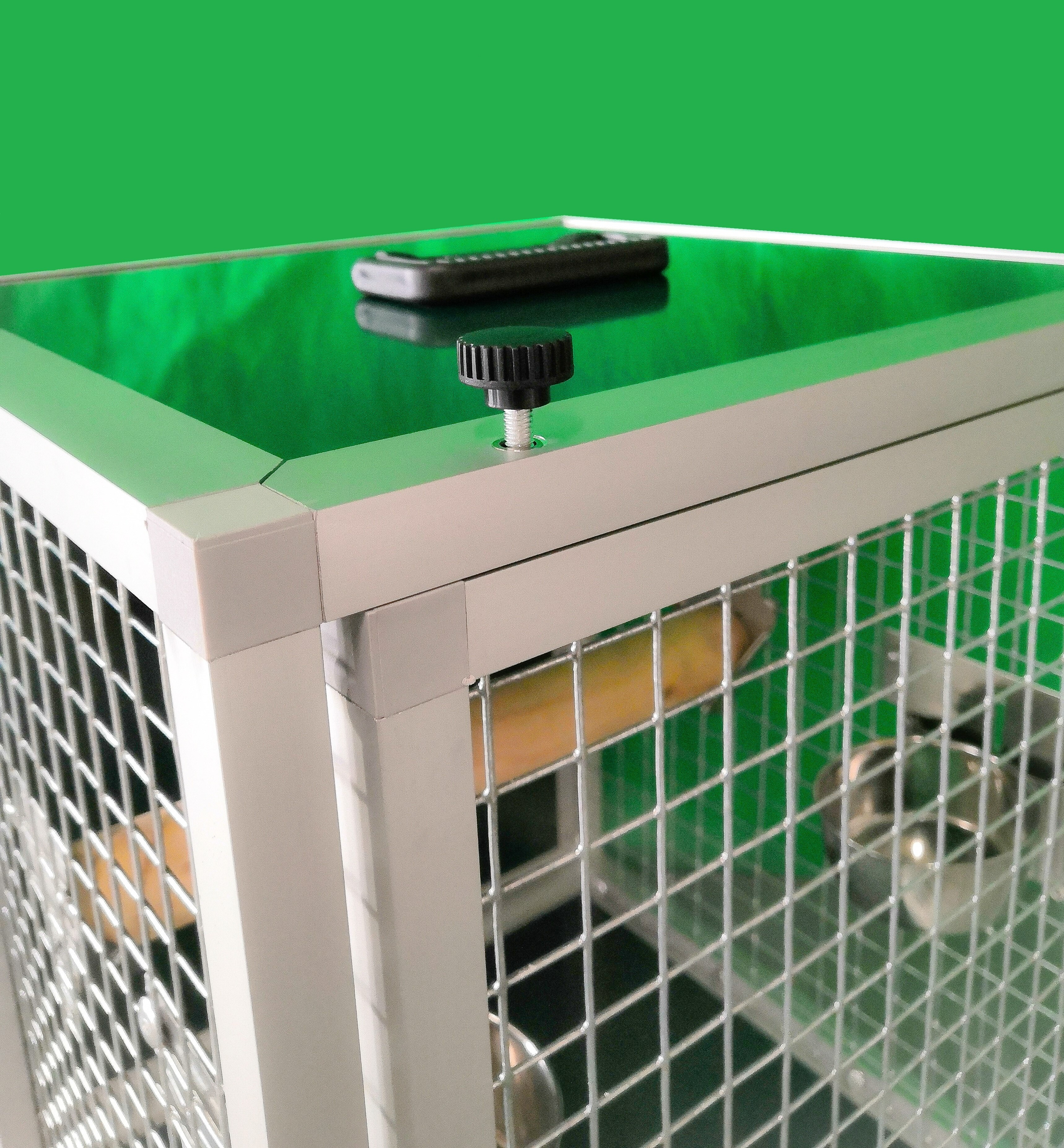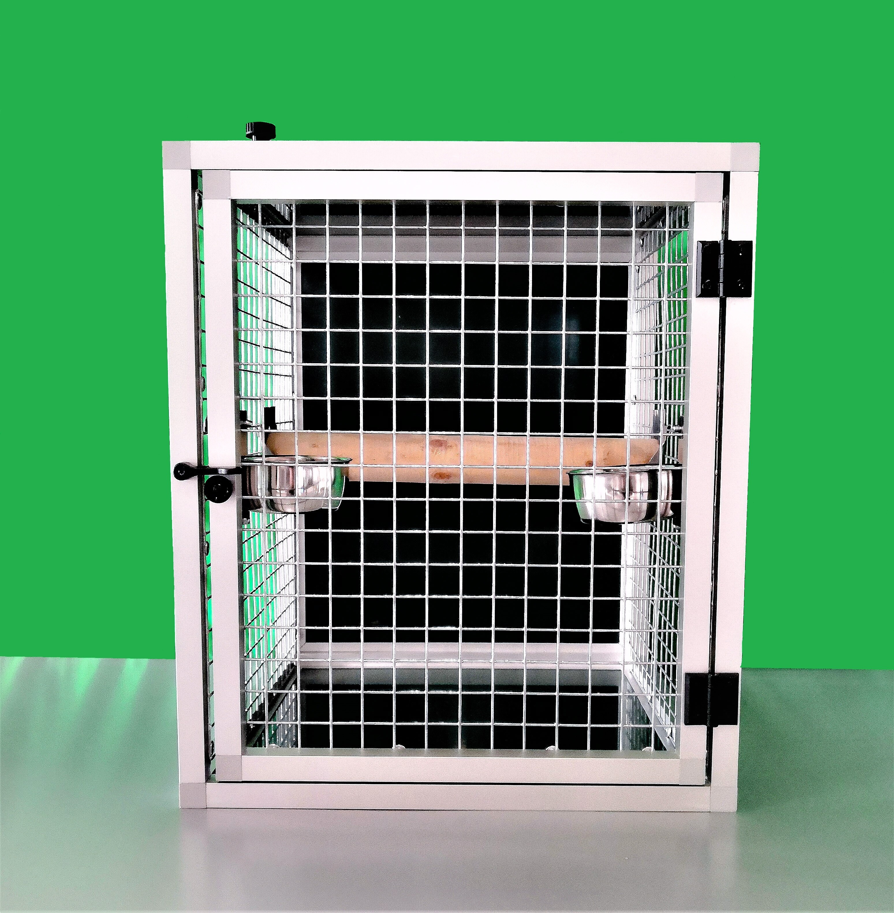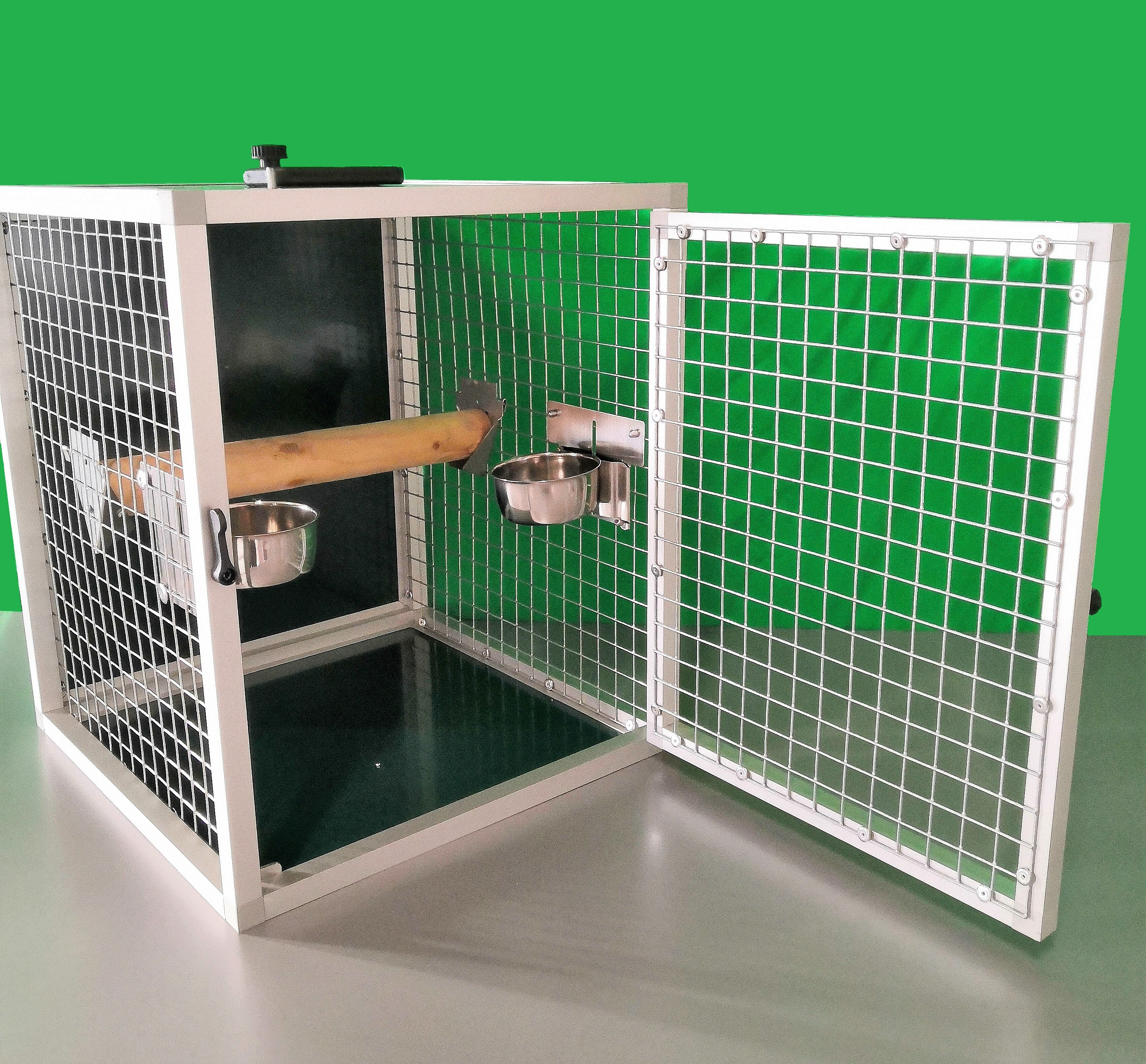 Prepravná klietka s kŕmidlami je vyrobená z profilu 20x20x1,5 mm s povrchovou úpravou eloxovaním.