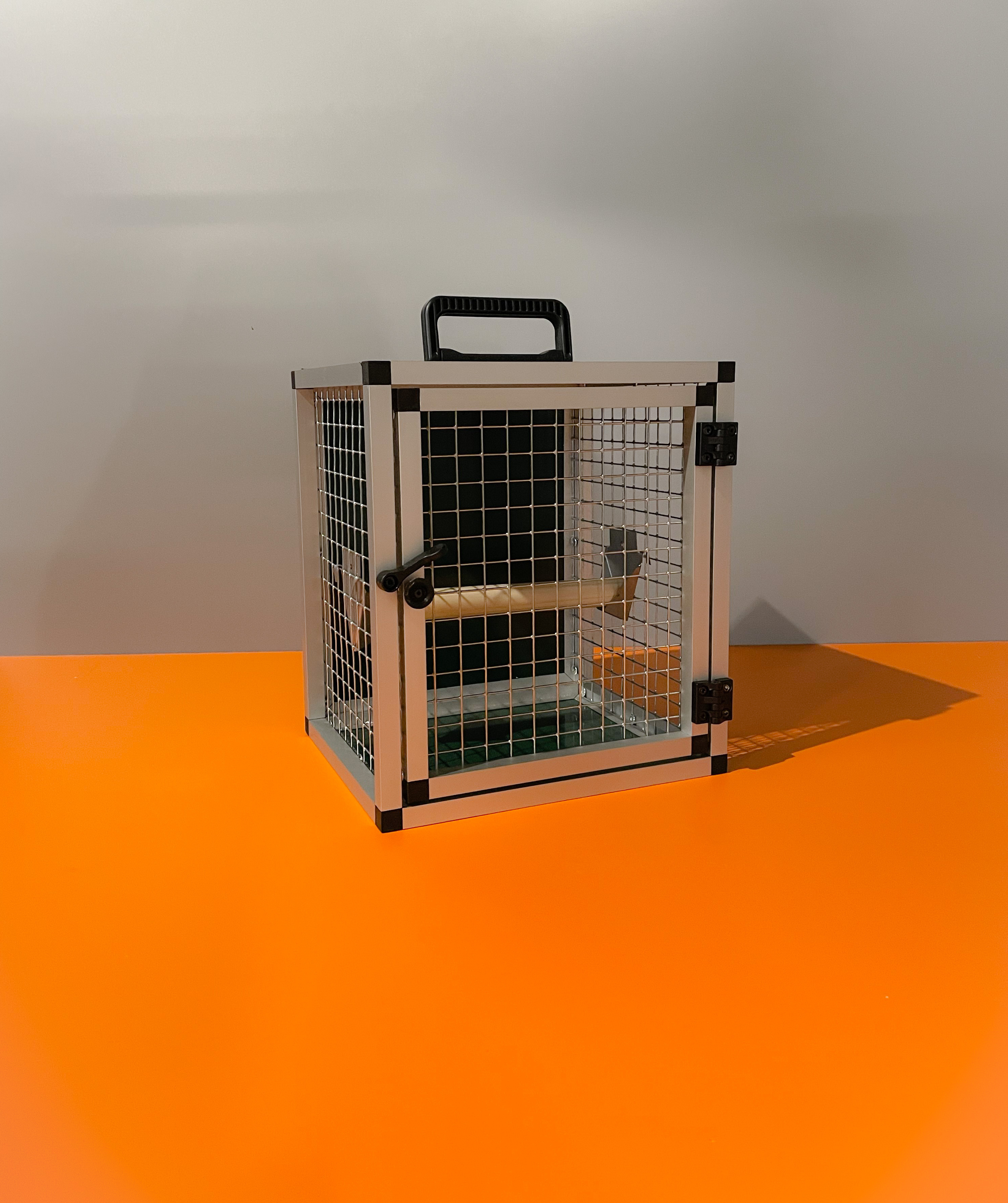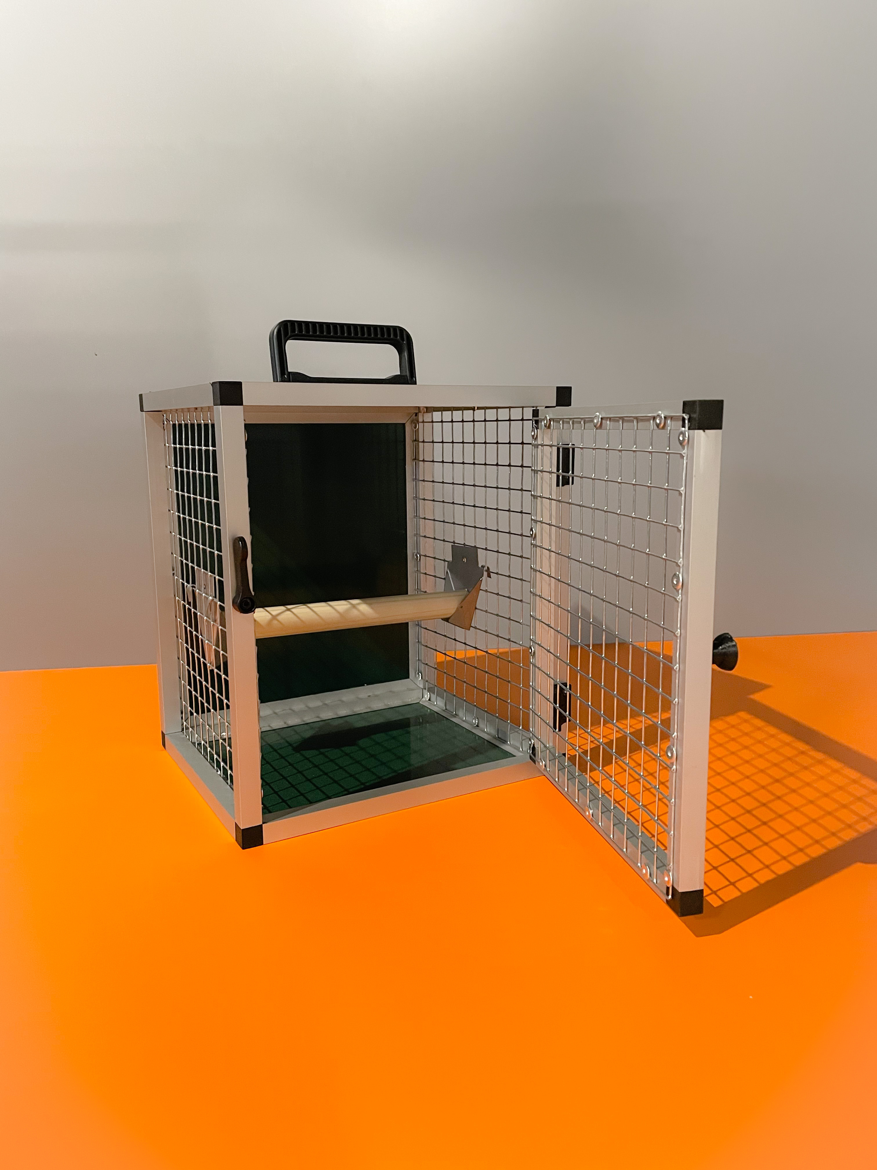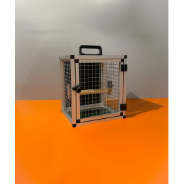 Použité materiály sú veľmi kvalitné a umývateľné. Je vyrobená z profilu 15x15x1 mm s povrchovou úpravou elox. Rozmery prepravnej klietky sú šírka 28 cm, hĺbka 24 cm, výška 32 cm. Výplne prepravky sú vyrobené z hliníkového sendviča. Použité pletivo je taliansky Esafort oko 19x19 drôt 1,45. Celková váha prepravky je iba 2kg.