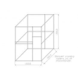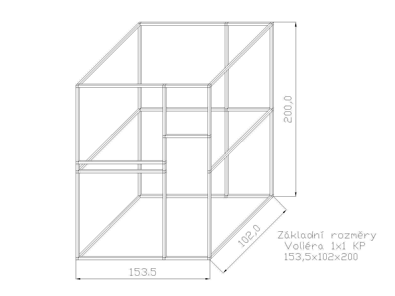 Šírka jedného boxu je cca 153 cm. Konštrukcia po zostavení tvorí jeden celok. Na vyžiadanie môžeme dodať za príplatok konštrukciu aj v striebornom eloxovanom prevedení, kde sa cena konštrukcie navýši o cca 13 %. Súčasťou stavebnice sú dvierka do voliéry, pánty a petlička. Rozmer samotných dvierok sú: výška 134cm, šírka 48cm. Súčasťou stavebnice je tiež kŕmny nerezový pult, kde zákazník má na výber z troch typov KPG05, KPG07, KPG11. Vždy sa jedná o kŕmne pulty zásuvné nerezové s gastro nádobami. Gastro nádoby majú na výšku 6 cm. Kŕmny pult KPG 11 ako jediný ponúka aj možnosť výmeny misiek s menšou hĺbkou. Miesto 6 cm na 4 cm. Vybraný typ je potrebné uviesť do poznámok. Tieto kŕmne pulty oproti otočným kŕmnym pultom majú hneď niekoľko výhod. Nádobu z krmného pultu nemožno vytiahnuť zvieraťom vo vnútri voliéry. Pred kŕmnym pultom možno umiestniť bidlo. Čo otočný kŕmny pult neumožňuje. Nádoby pre svoj tvar elipsy a hĺbku majú väčší obsah než misky okrúhle. Pletivo a úchytový materiál, nie je súčasťou stavebnice.